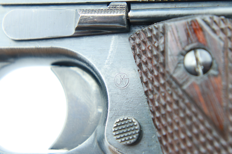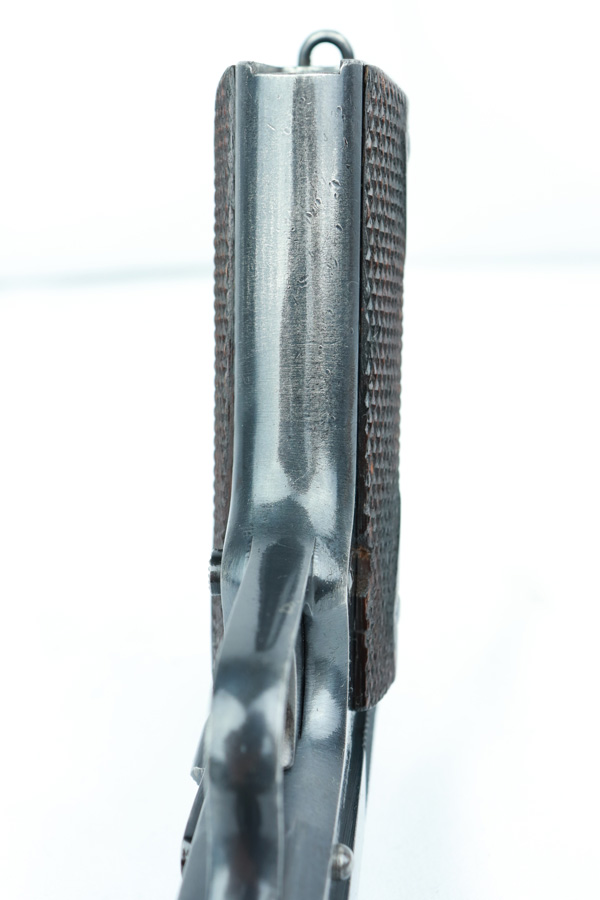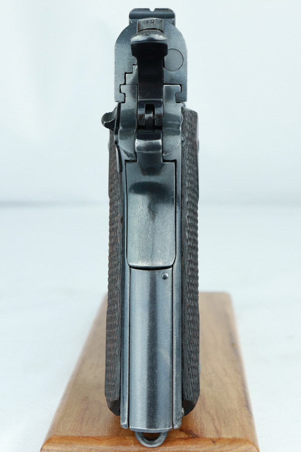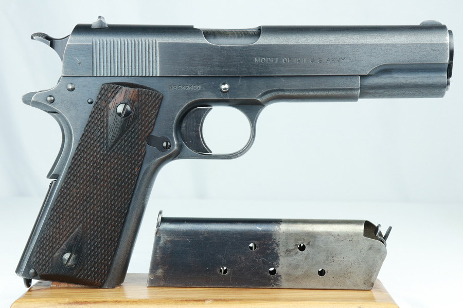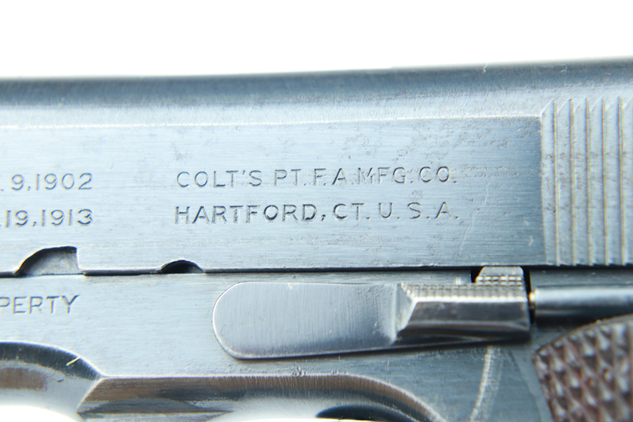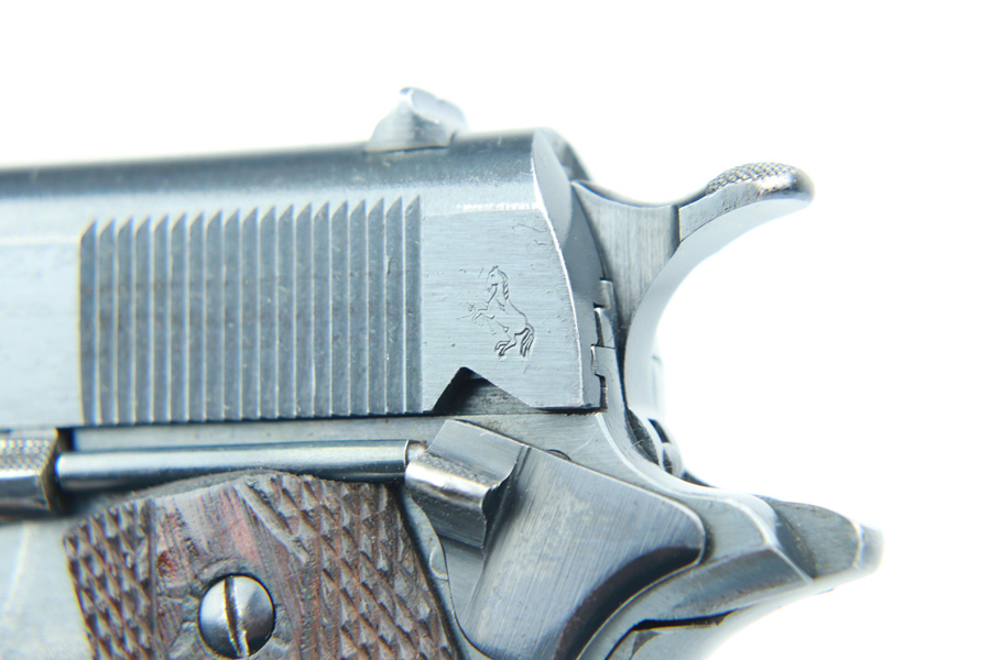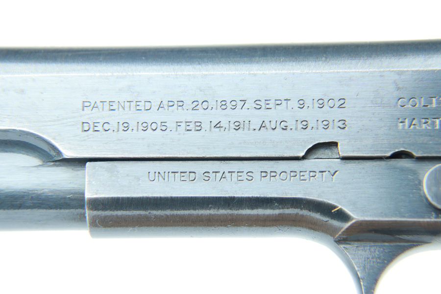 11/7/18 – This is a nice and original Colt M1911 from the end of the Great War. Made in 1918, this pistol is all correct and matching with 92-93% polished blue remaining. The front strap shows the majority of finish loss, though there is uniform edge wear and light patina on the slide. Proper ‘P H’ marked barrel. ‘H’ marked slide. Unmarked two-tone magazine. Bore shows minor frost but is otherwise in good shape.