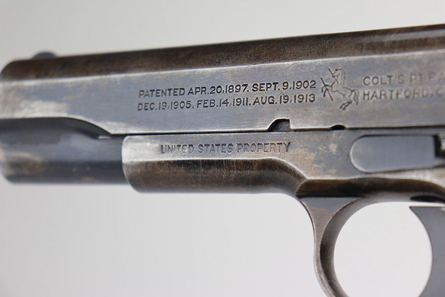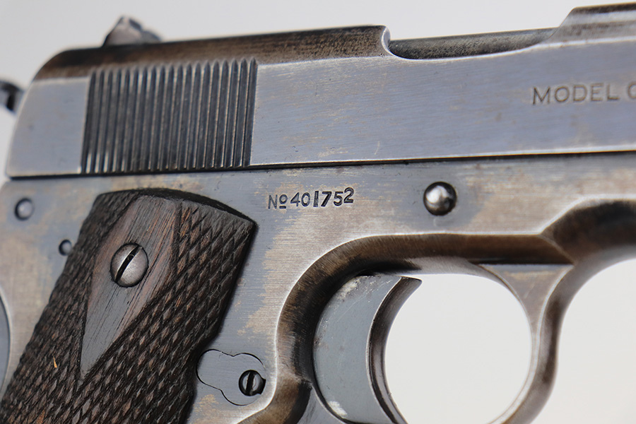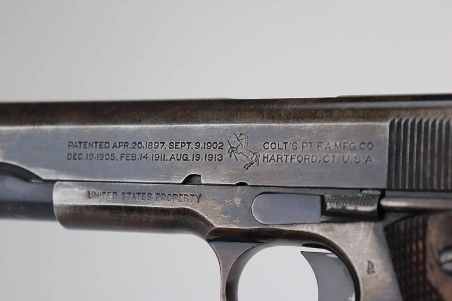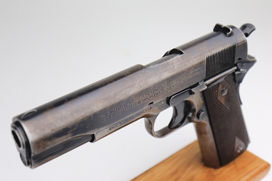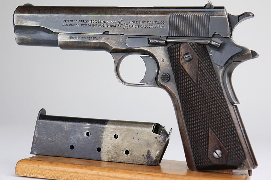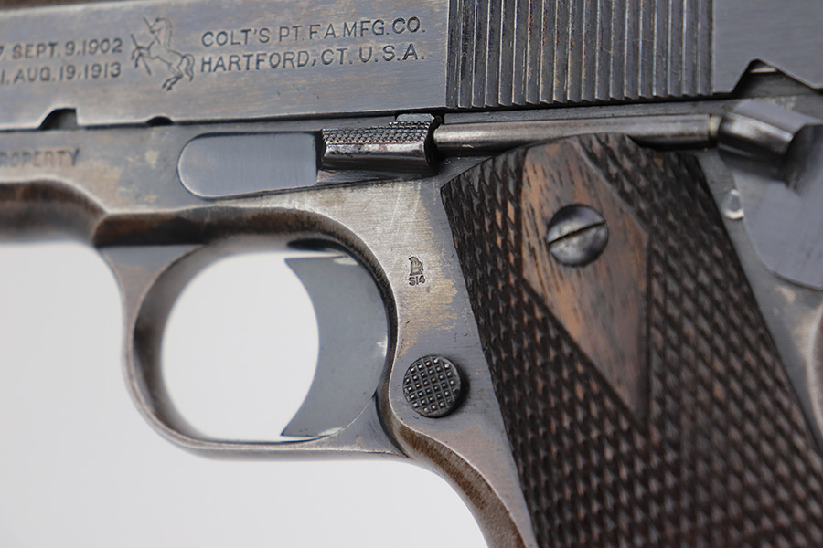 4/12/22 – This is a nice example of a Colt Model 1911 issued to the US military in 1918. It is properly “United States Property” marked and has an “Eagle Head S14” military inspection proof on the left side of the frame. It also has a correct “H P” Colt barrel. The gun has retained roughly half of its bluing with noticeable flaking in the finish and splotchy discoloration on the whole gun. Spotty oxidation on the grip straps. Comes with nice period-correct wood grips – some dulling in the checkering on the right side. Also comes with a proper two-tone magazine. The bore has great rifling with some very minor frosting in the grooves.