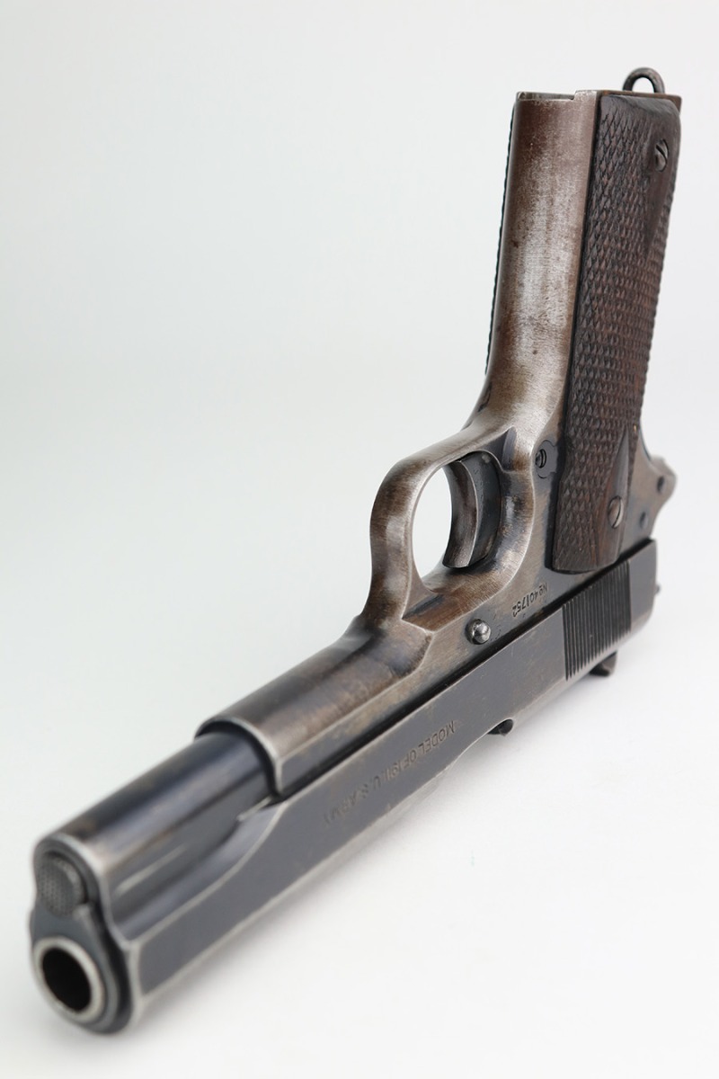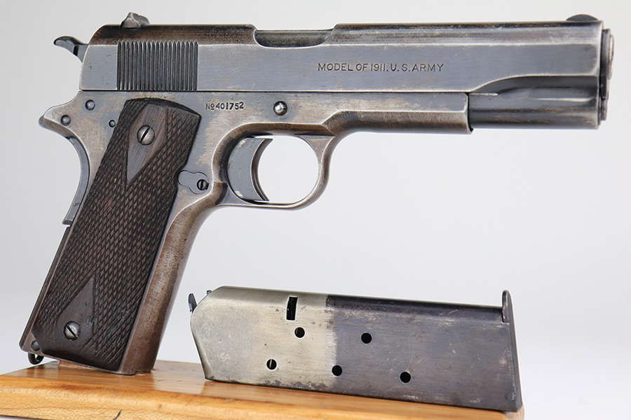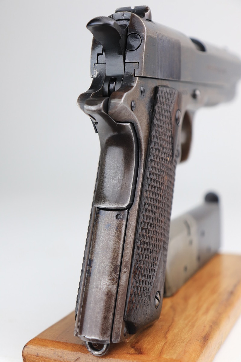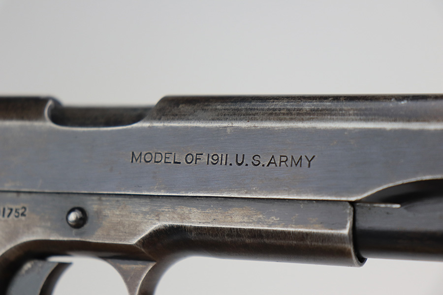 4/12/22 – This is a nice example of a Colt Model 1911 issued to the US military in 1918. It is properly “United States Property” marked and has an “Eagle Head S14” military inspection proof on the left side of the frame. It also has a correct “H P” Colt barrel. The gun has retained roughly half of its bluing with noticeable flaking in the finish and splotchy discoloration on the whole gun. Spotty oxidation on the grip straps. Comes with nice period-correct wood grips – some dulling in the checkering on the right side. Also comes with a proper two-tone magazine. The bore has great rifling with some very minor frosting in the grooves.