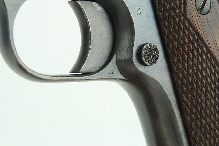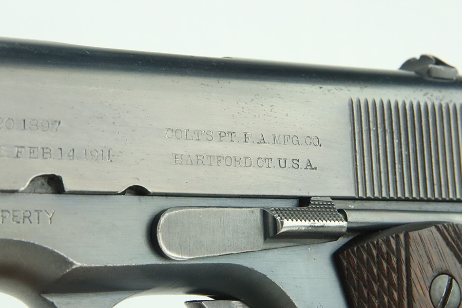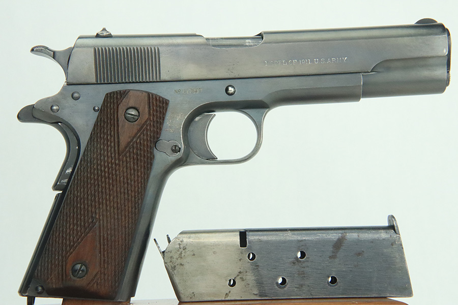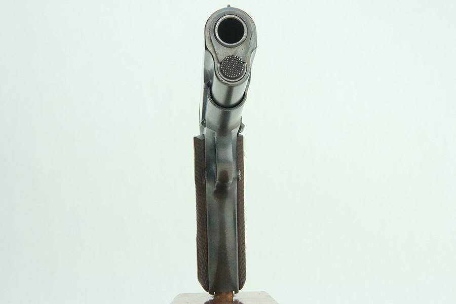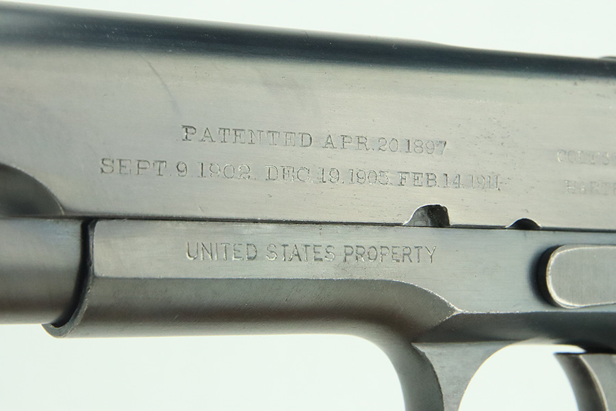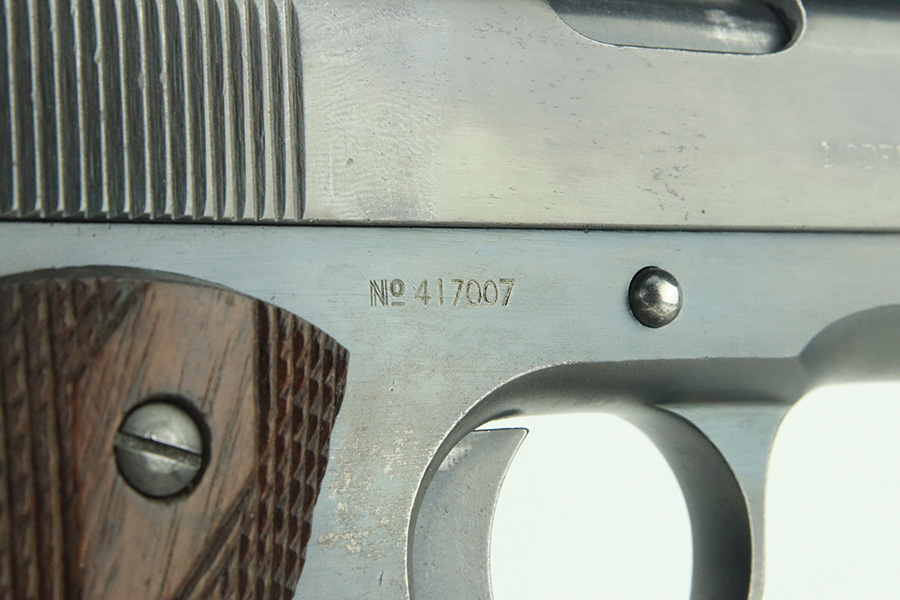 3/14/24 – This is a very nice example of a Colt Model 1911 issued to the US military in 1918. Intertwined “HP” Colt barrel. The entire gun has been re-blued, and there is very little finish loss. There are just tiny scratches and handling marks here and there and a small area of discoloration on the right side of the frame. Fitted with excellent period-correct wood grips and comes with a proper two-tone magazine. The bore has strong rifling, but there is light freckling in the grooves.