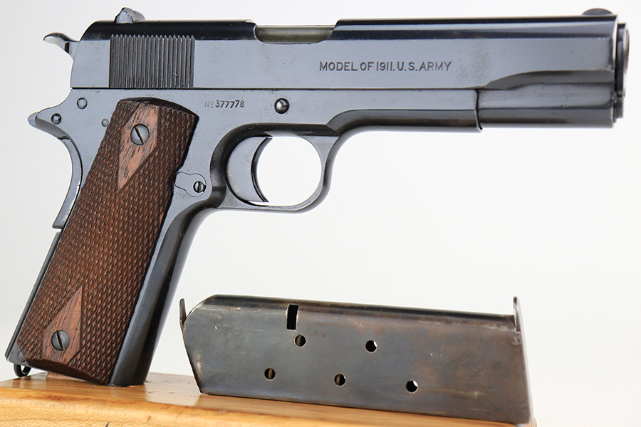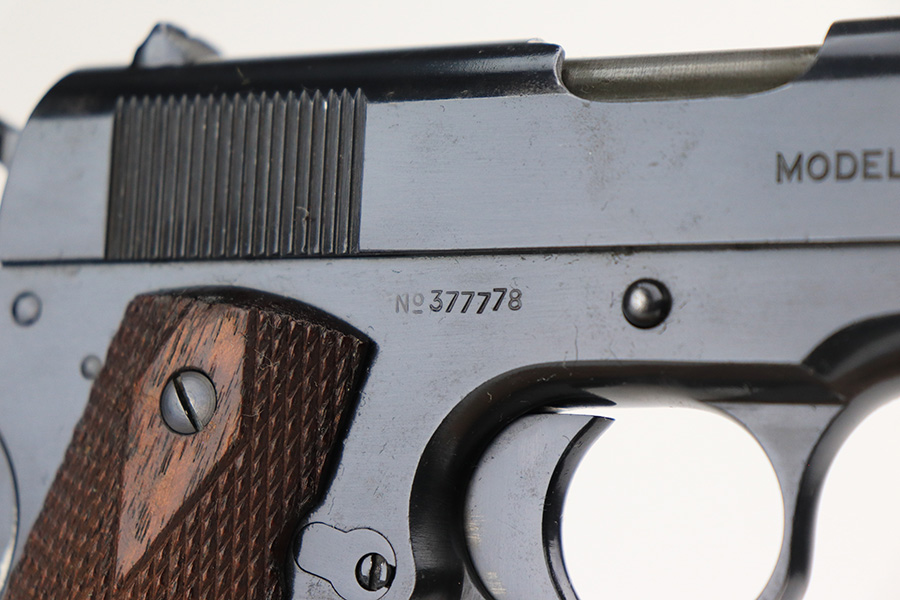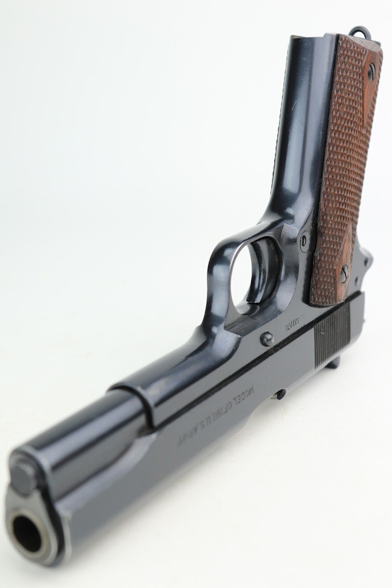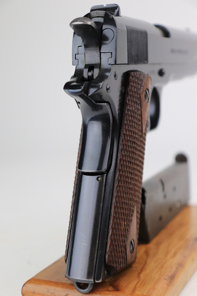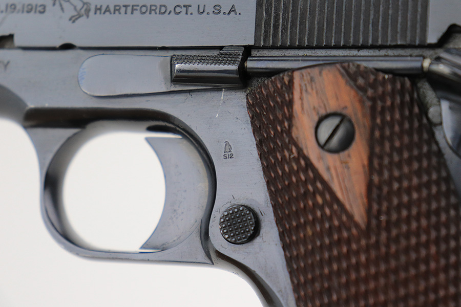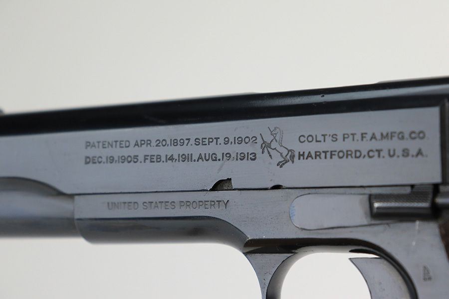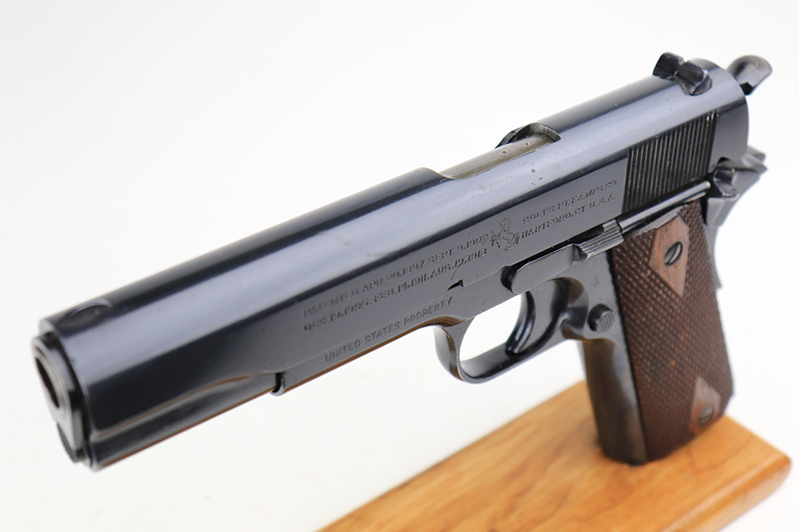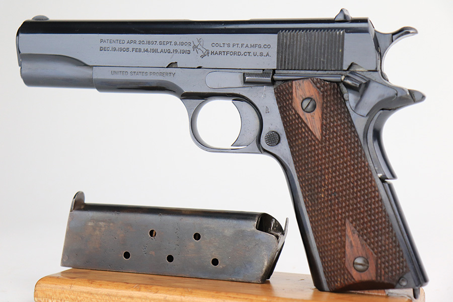 4/26/22 – This is an excellent example of a Colt Model 1911 issued to the US military in 1918. It is “United States Property” marked and has the proper “Eagle S12” military inspection proof on the left side of the frame. It also has the proper “H P” Colt barrel. The entire gun has been professionally restored, so the bluing is bright and beautiful. There is very little actual finish loss, but there are some areas of very minor pin-pricking on the right side of the gun and back strap that have been blued-over. A few very light handling marks and scratches here and there. Comes with minty wood grips and a period-correct magazine that was re-blued. Minty bore.