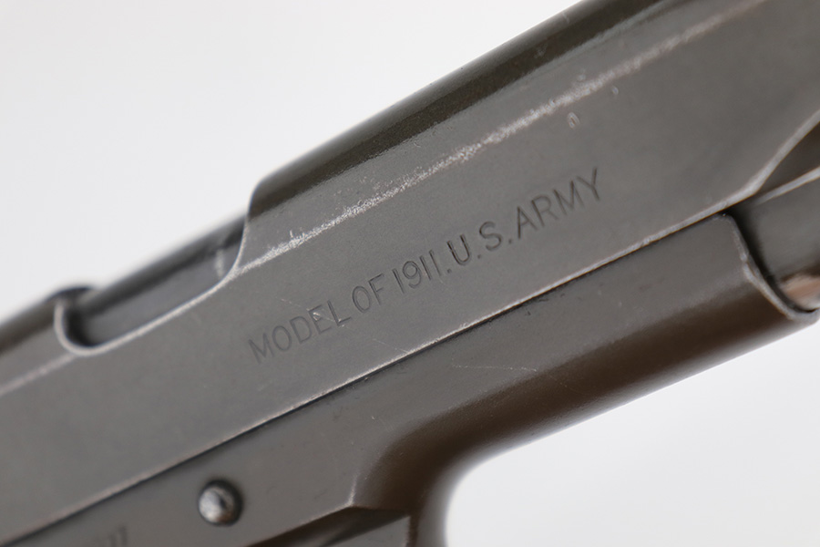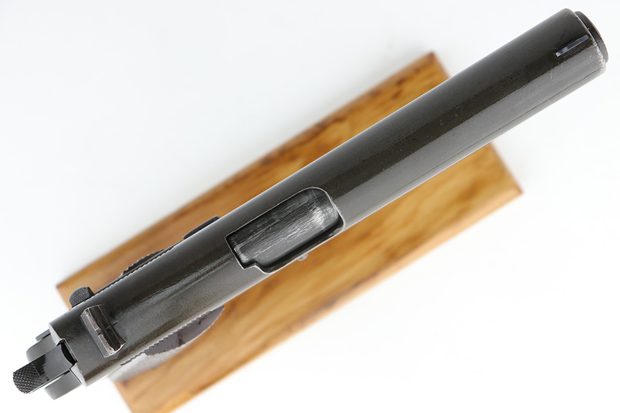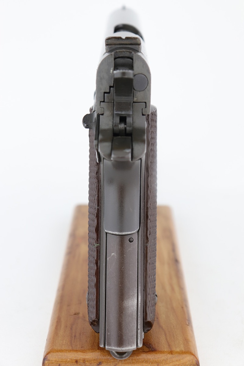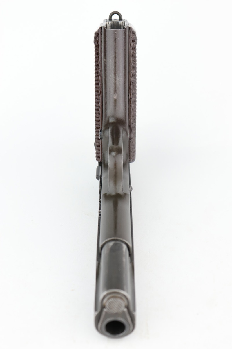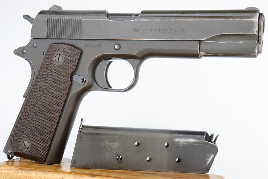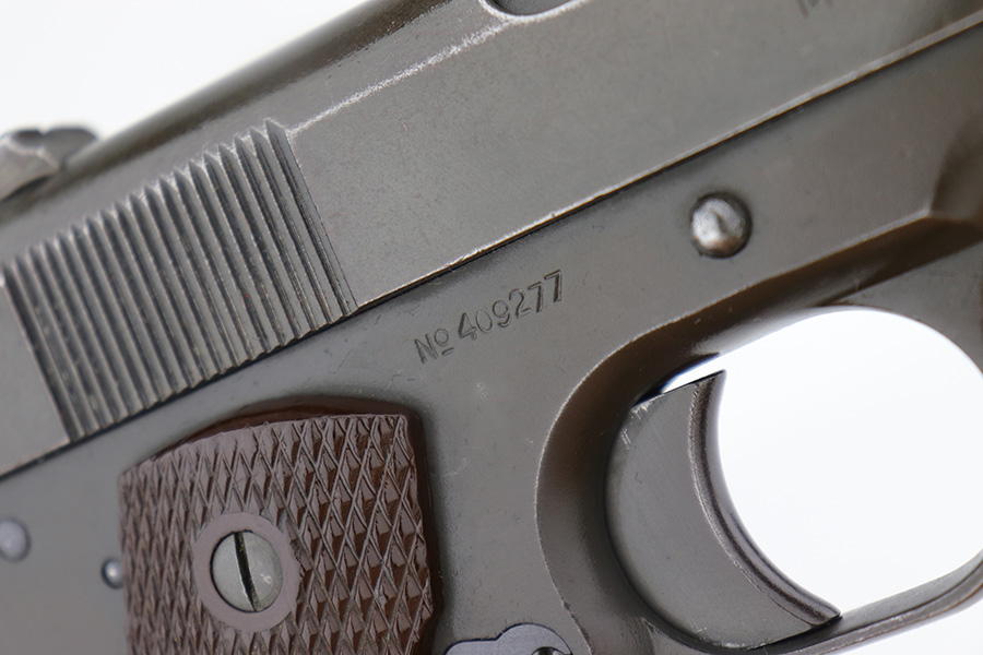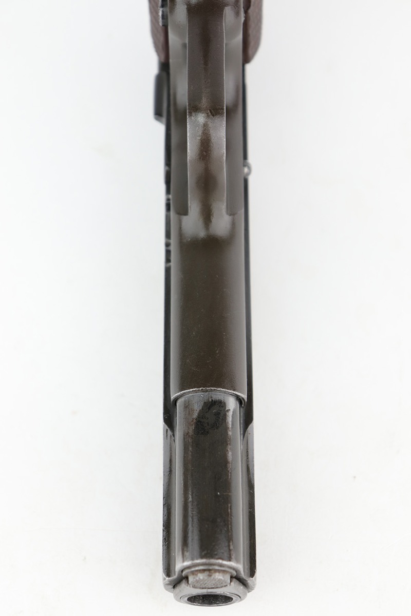 12/19/22 – This is a nice example of a Colt Model 1911 issued to the US military in 1918. It is “United States Property” marked and has a very faint “Eagle Head S16” military acceptance proof on the left side of the frame. The entire gun has been refinished and parkerized, possibly for re-issue during WW2. It comes with a Springfield barrel that has also been parkerized. The gun itself has retained about 96% of its finish. There is minor wear around the muzzle, high edges of the slide, and a couple of small spots of wear on the grip straps. There is some dark splotchy discoloration here and there, mostly on the left side of the slide. Light brown patina on the grip straps. Fitted with a set of nice WW2-era reddish plastic grips and comes with a parkerized magazine. The bore has good rifling, but there is frosting and pin-pricking throughout.