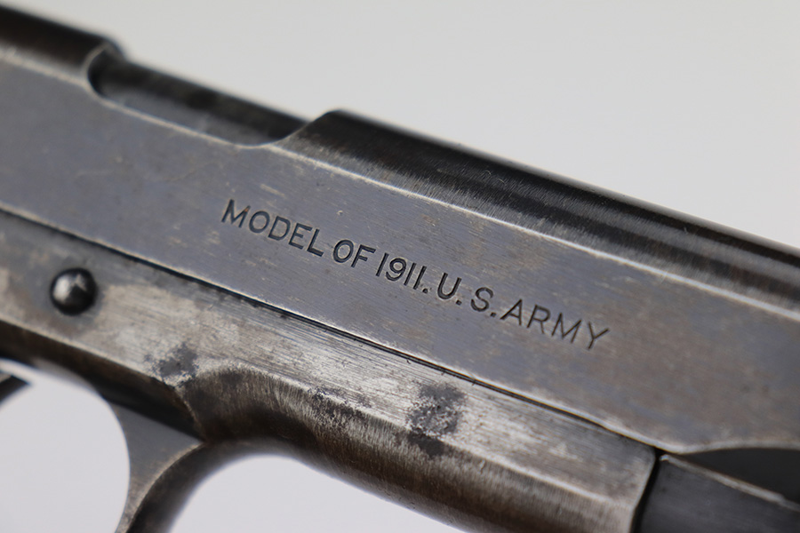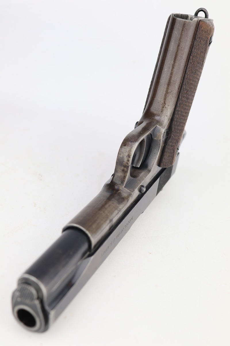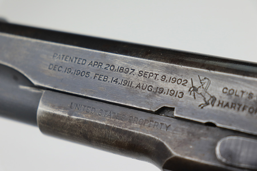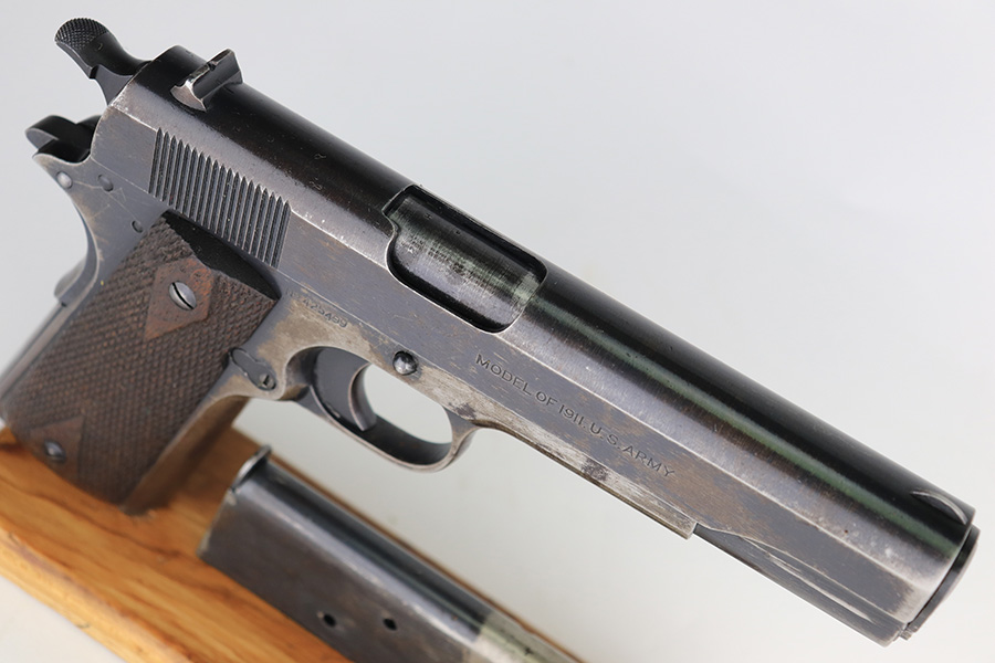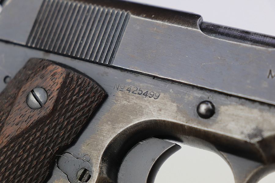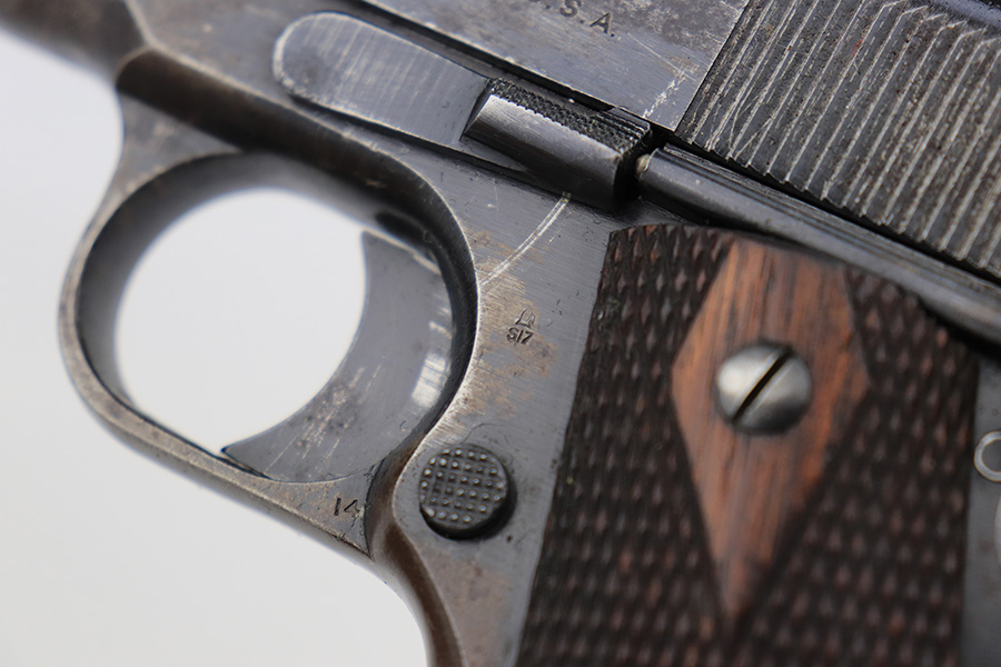 3/15/23 – This is a Colt Model 1911 issued to the US military in 1918. It is “United States Property” marked and has the proper “Eagle Head S17” military acceptance proof. Correct “H P” Colt barrel. It has retained roughly 75% of its finish. There is thinning on both grip straps and splotchy wear / discoloration on most of the gun. Areas of spotty oxidation and minor pitting here and there, most noticeable on the left side of the slide. Nice period-correct grips and comes with one correct two-tone magazine. Excellent, shiny bore with strong rifling.