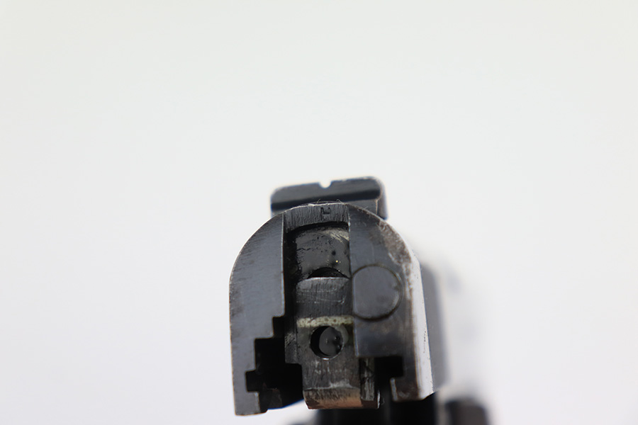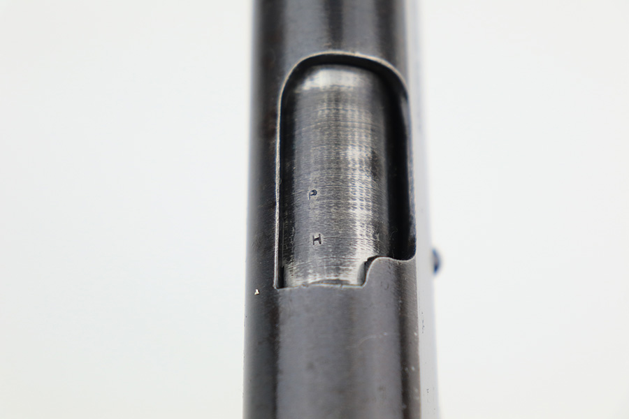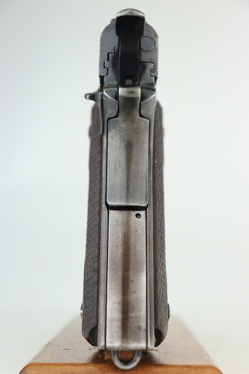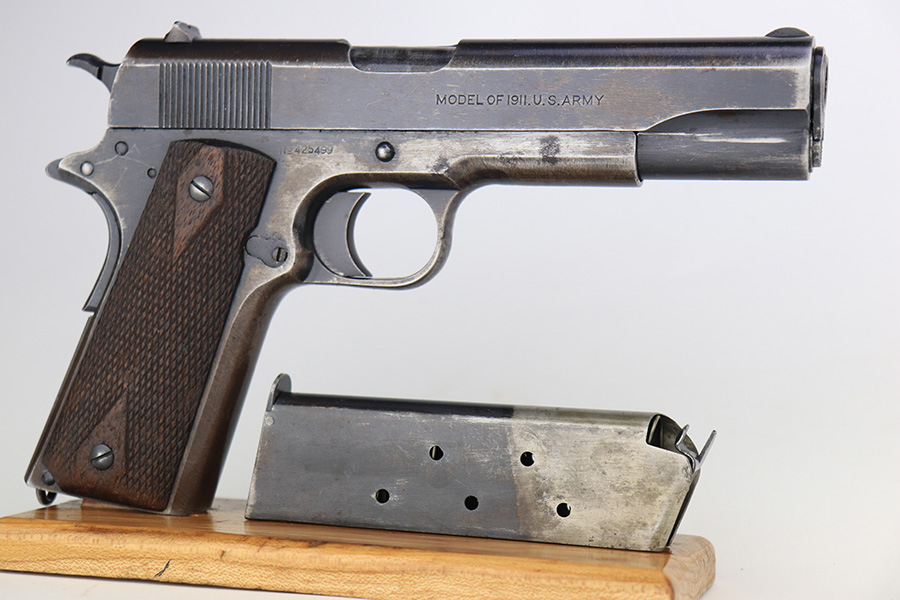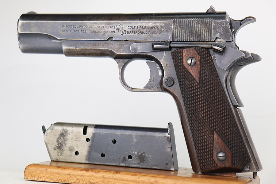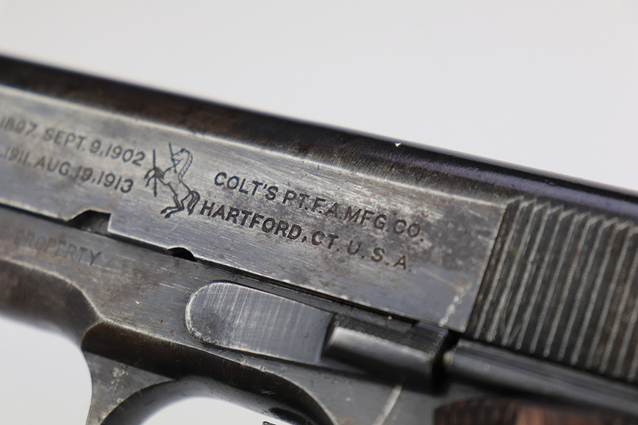 3/15/23 – This is a Colt Model 1911 issued to the US military in 1918. It is “United States Property” marked and has the proper “Eagle Head S17” military acceptance proof. Correct “H P” Colt barrel. It has retained roughly 75% of its finish. There is thinning on both grip straps and splotchy wear / discoloration on most of the gun. Areas of spotty oxidation and minor pitting here and there, most noticeable on the left side of the slide. Nice period-correct grips and comes with one correct two-tone magazine. Excellent, shiny bore with strong rifling.