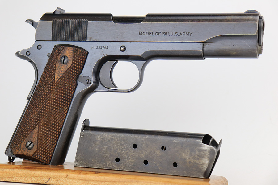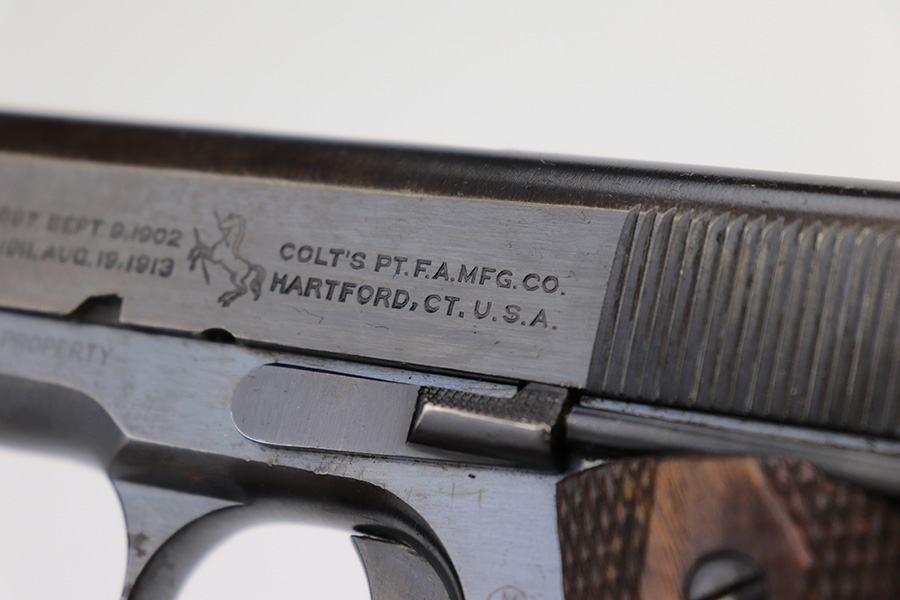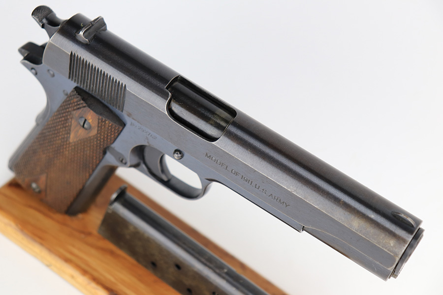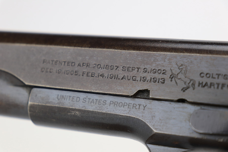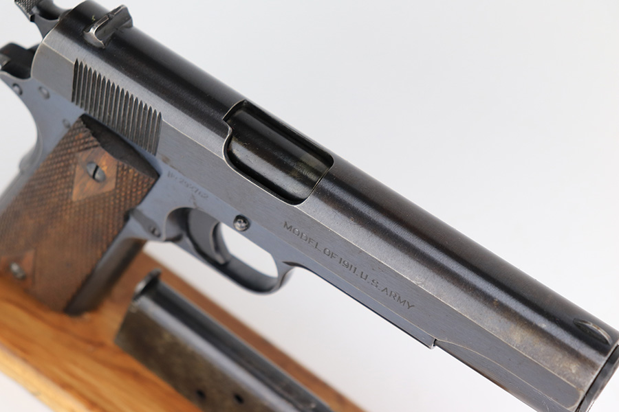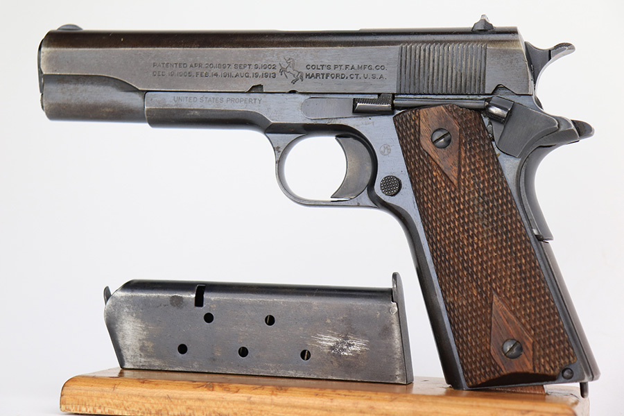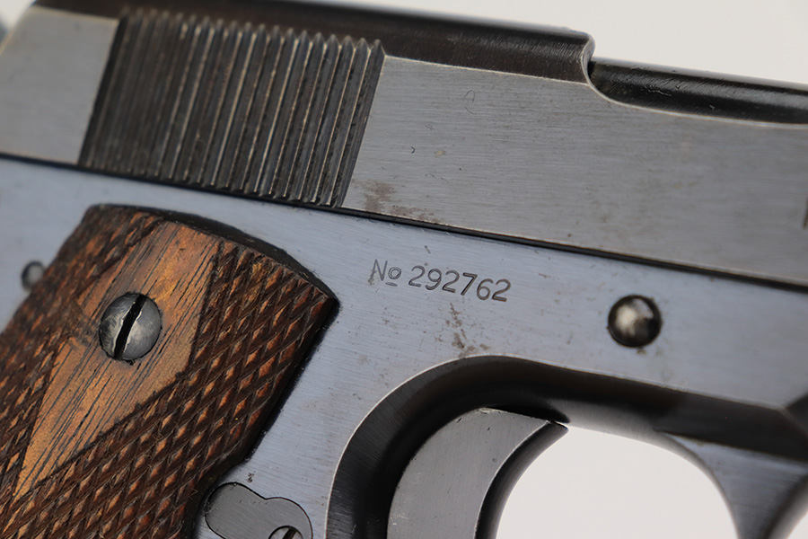 5/17/23 – This is a very nice example of a Colt Model 1911 issued to the US military in 1918. It is “United States Property” marked and has the proper military inspection proof. Correct “H P” Colt barrel. The gun itself has retained about 93% of its original finish. There is minor thinning on the grip straps, light spotty wear around the muzzle, minor high edge wear in general, and some minor thinning along the left side of the slide. There are areas of freckling and light spotty oxidation here and there, most noticeable on the left side of the slide. Fitted with very nice period-correct wood grips and comes with one magazine. The bore has good rifling with very minor frosting throughout.