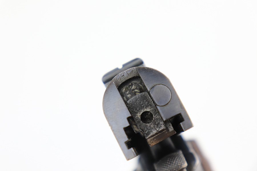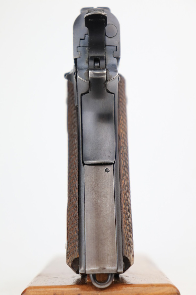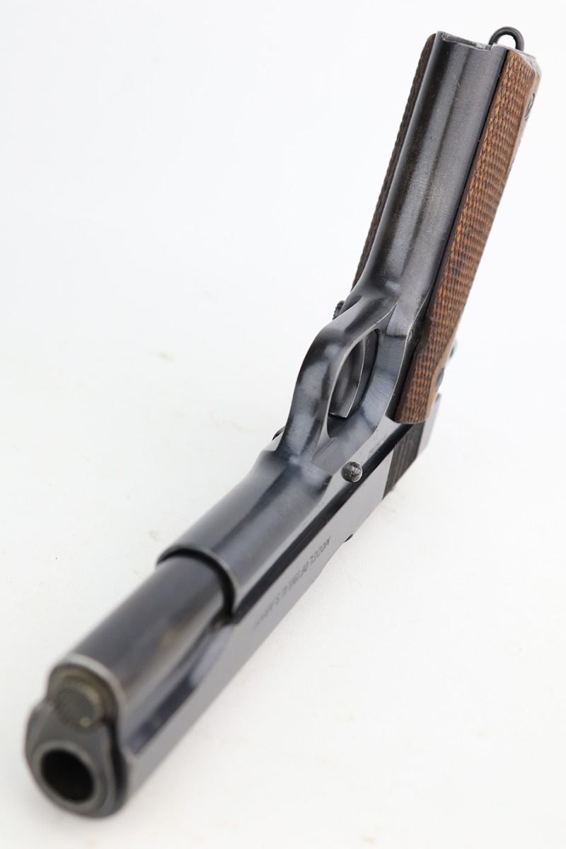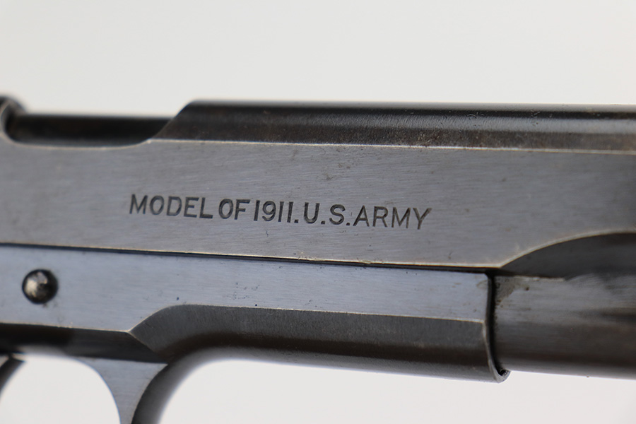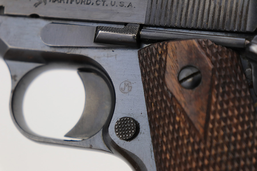5/17/23 – This is a very nice example of a Colt Model 1911 issued to the US military in 1918. It is “United States Property” marked and has the proper military inspection proof. Correct “H P” Colt barrel. The gun itself has retained about 93% of its original finish. There is minor thinning on the grip straps, light spotty wear around the muzzle, minor high edge wear in general, and some minor thinning along the left side of the slide. There are areas of freckling and light spotty oxidation here and there, most noticeable on the left side of the slide. Fitted with very nice period-correct wood grips and comes with one magazine. The bore has good rifling with very minor frosting throughout.