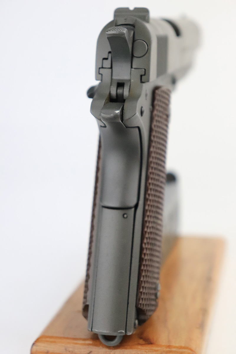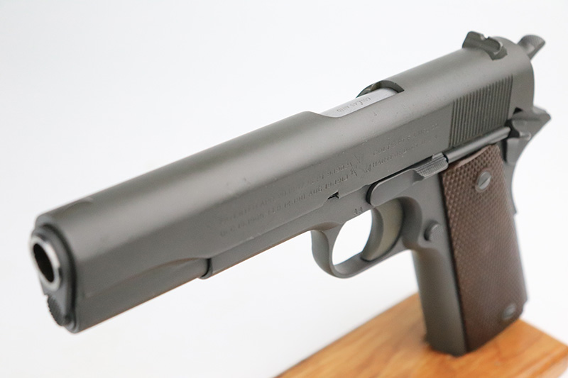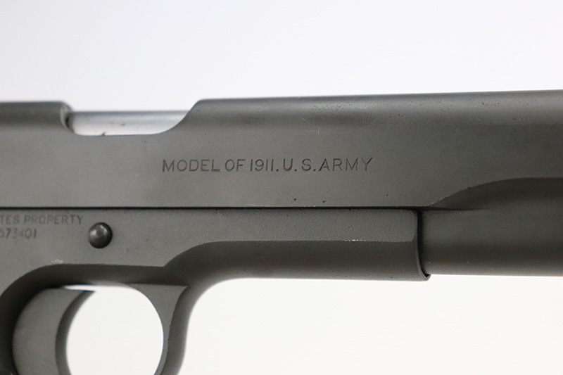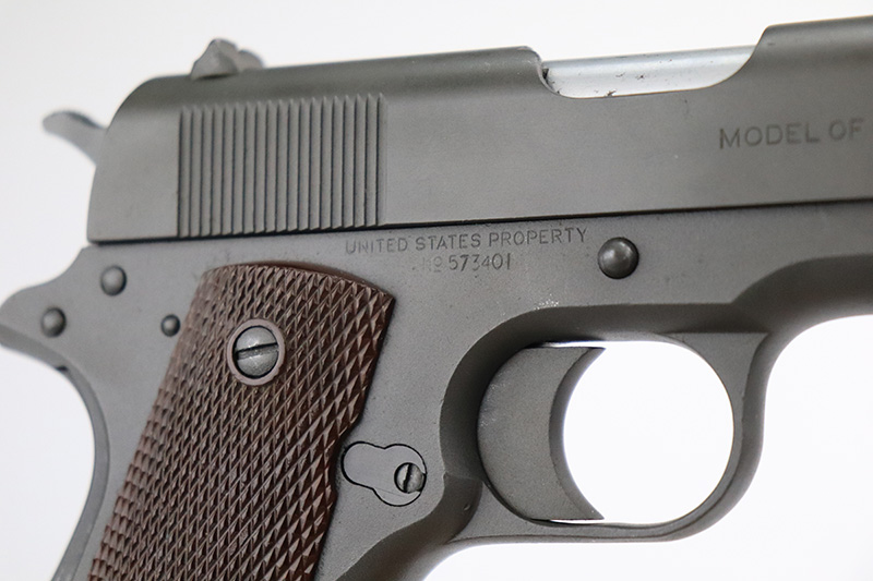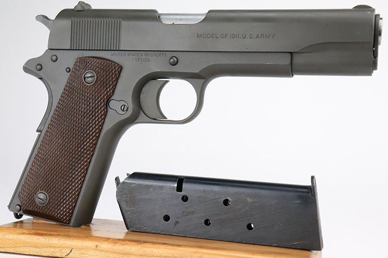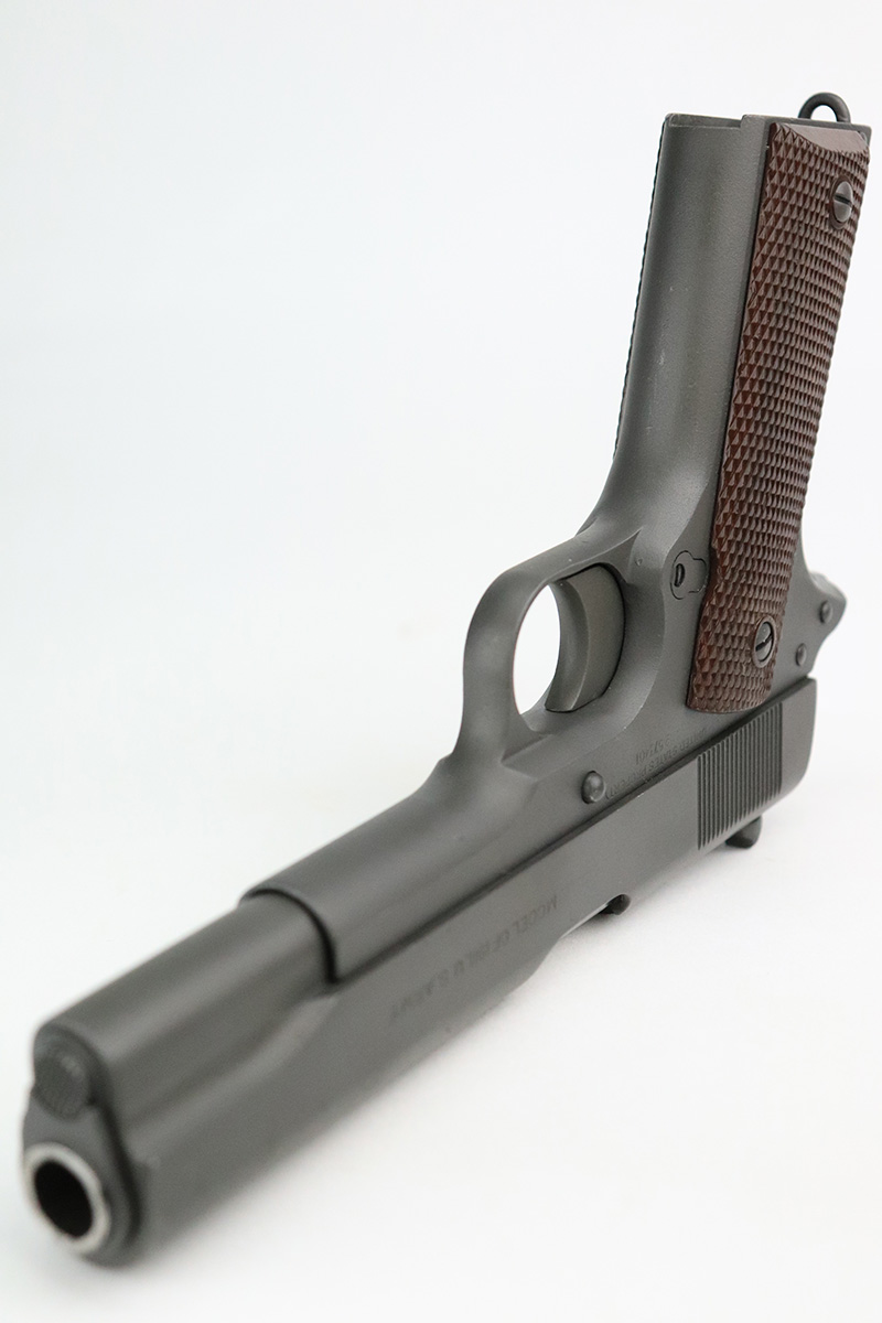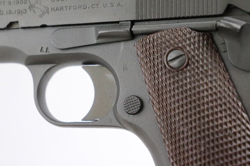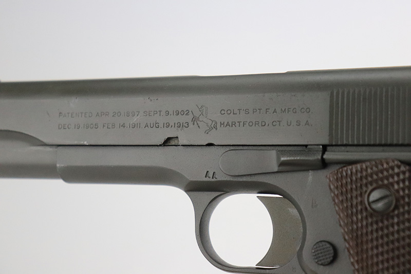 10/11/22 – This is an excellent example of a Colt Model 1911 issued to the US military in 1918. It is “United States Property” marked and has the proper “Eagle Head” military inspection marking on the left side of the frame. There is also an “AA” marking on the frame, indicating this gun was reworked at the Augusta Arsenal, likely for use in WW2. The entire gun was refurbished at this arsenal, and the barrel was replaced. The gun has retained virtually all of its new parkerized finish with just some tiny pits under the finish on the slide. Comes with excellent WW2-era plastic grips and one magazine. Minty bore.