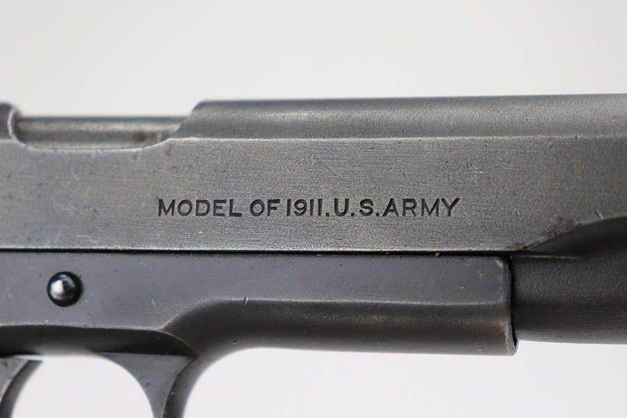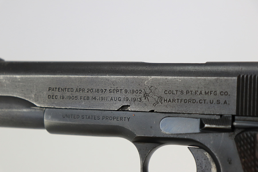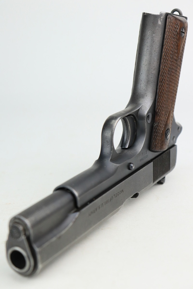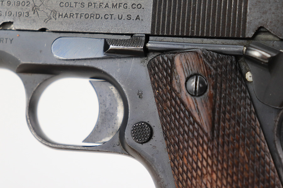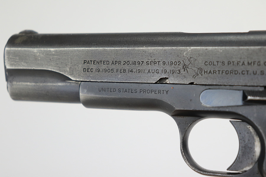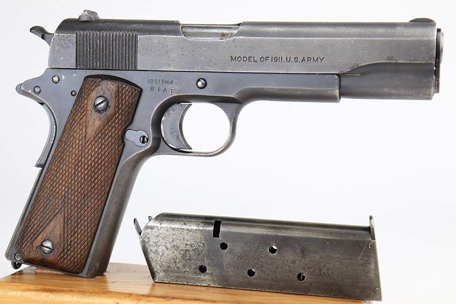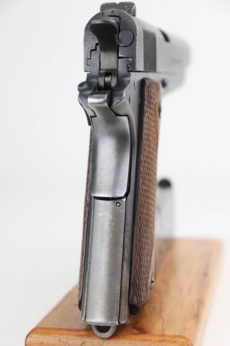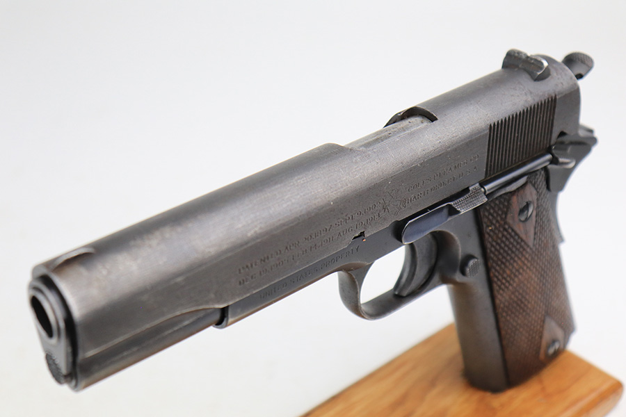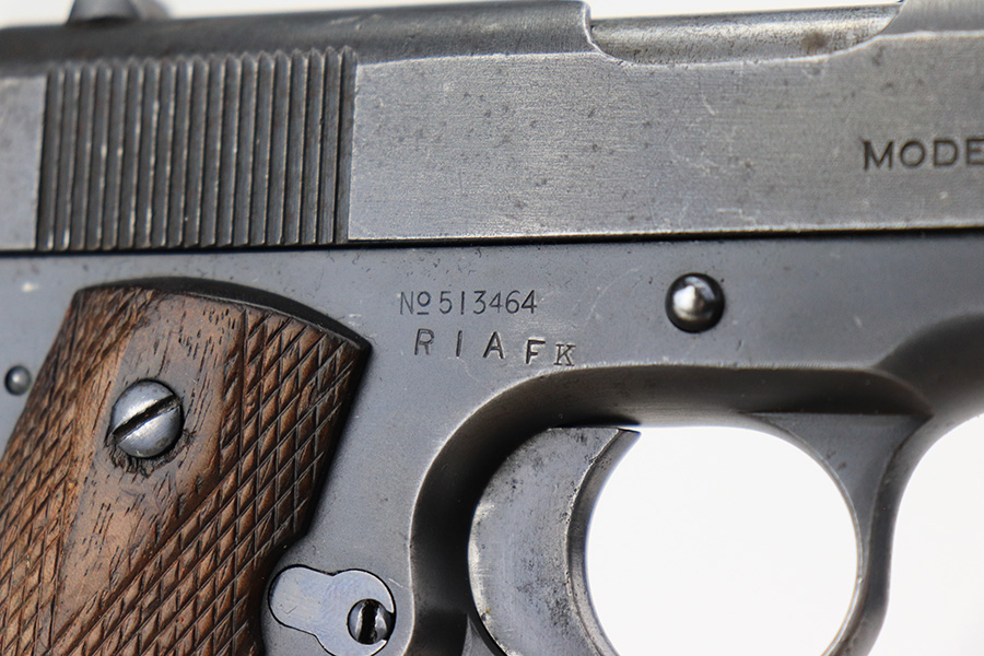 4/26/22 – This is a nice example of a Colt Model 1911 issued to the US military in 1918. It is “United States Property” marked and has the proper Eagle Head military acceptance proof. There is an “RIA” marking on the right side of the frame, indicating this gun was sent to the Rock Island Arsenal and reworked, likely for WW2. It has a proper WW1-era “H P” barrel. The gun has retained roughly 75-80% of its finish. There is significant finish loss on both grip straps. Noticeable thinning and tiny dots of oxidation along the slide. Comes with nice wood grips and a period-correct two-tone magazine. The rifling is a bit worn with minor pitting throughout.