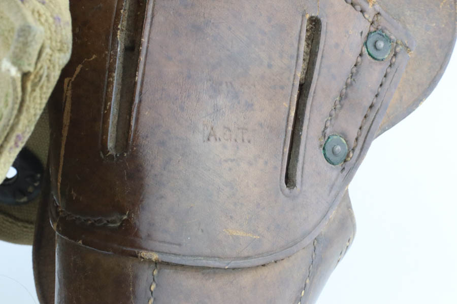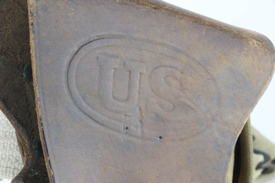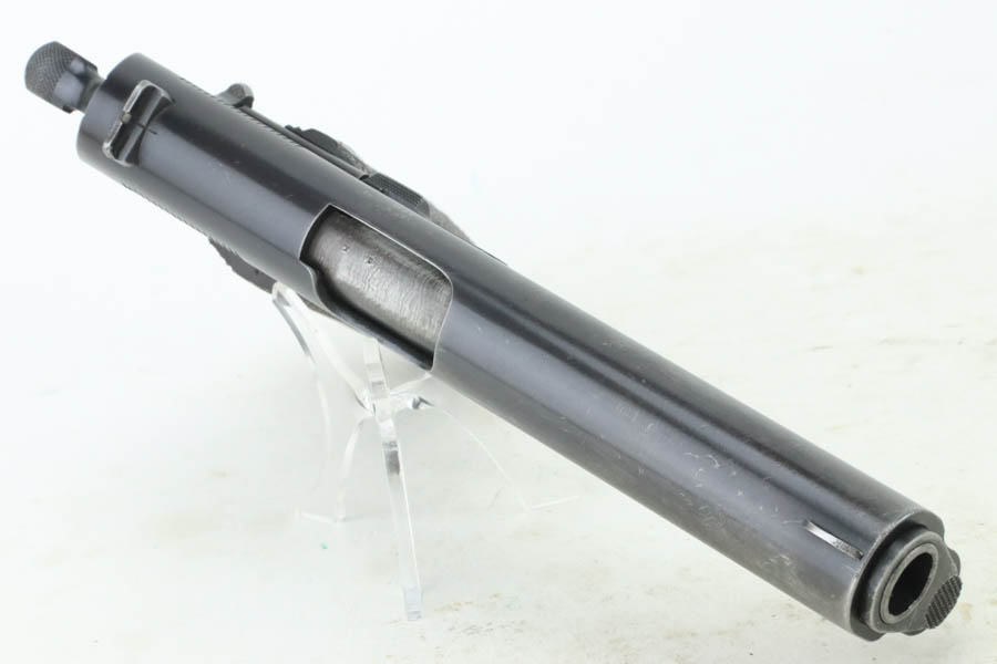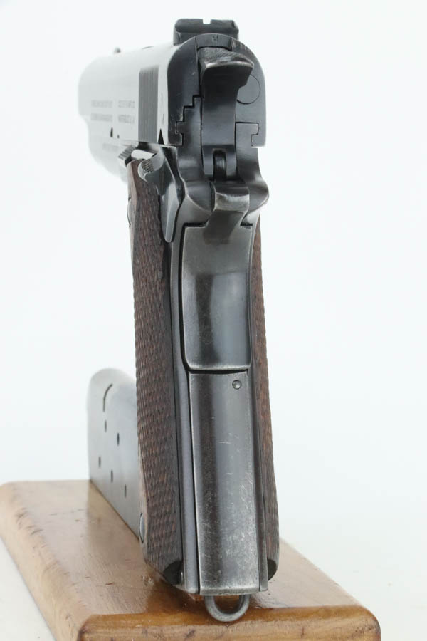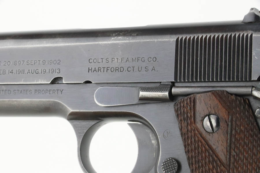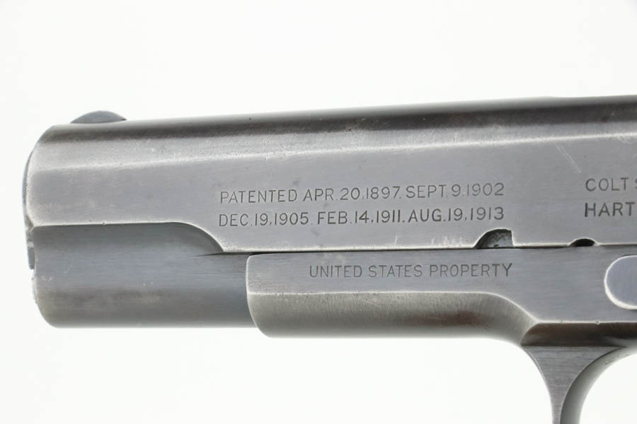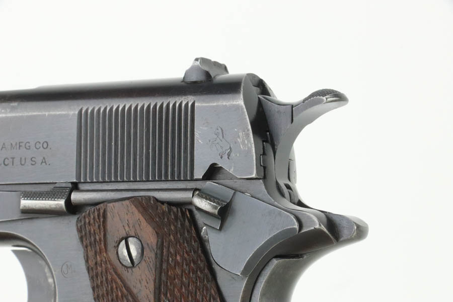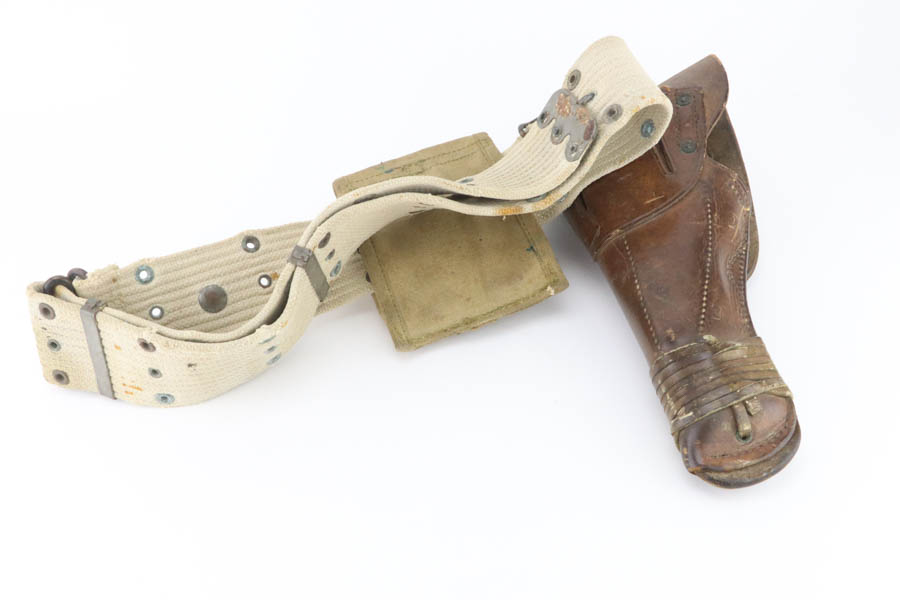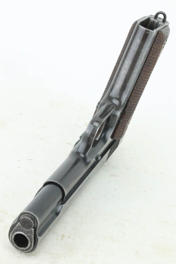 7/25/24 – This is a very nice example of a Colt 1911 issued to the US military in 1918. It is all correct and has a proper “H P” barrel. It comes as a rig with two period-correct two-tone magazines, a nice Boyt leather holster (with original leather lanyard), a light khaki-colored canvas belt, and a 1918-dated canvas magazine pouch. The gun itself has retained about 90-92% of its original bluing. There is general minor high edge wear and some very minor thinning on the grip straps. Fitted with period-correct wood grips. The bore has good rifling, but there is light pin-pricking throughout.
