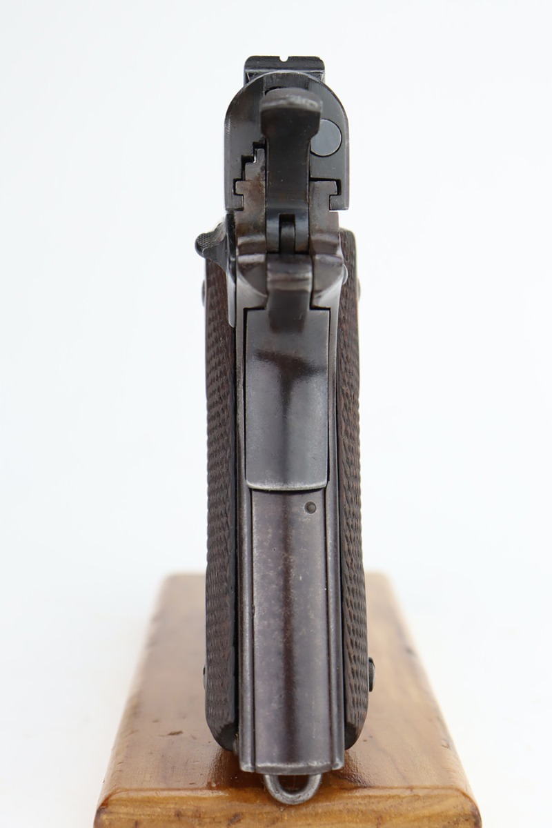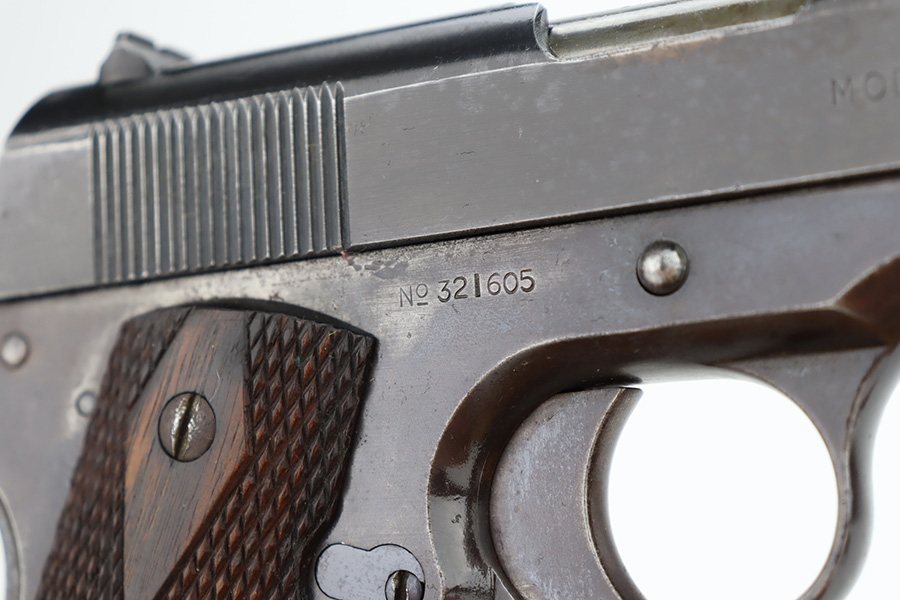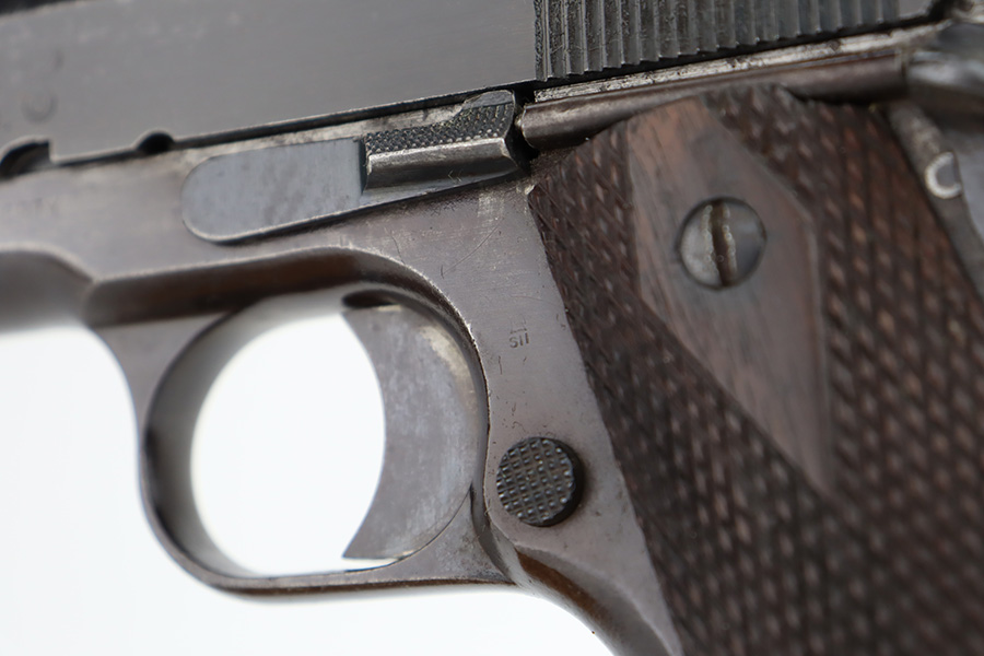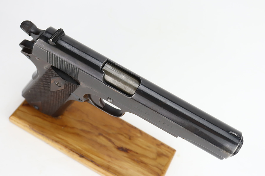 12/1/23 – This is a Colt Model 1911 issued to the US military in 1918. It has a Savage-made replacement slide and WW2-era Colt replacement barrel. The finish rates somewhere between 85-90%. There is some brown patina on the frame, some spotty discoloration here and there, and spotty oxidation on the grip straps. Fitted with period-correct wood grips. Comes with a proper two-tone magazine. Mint bore.