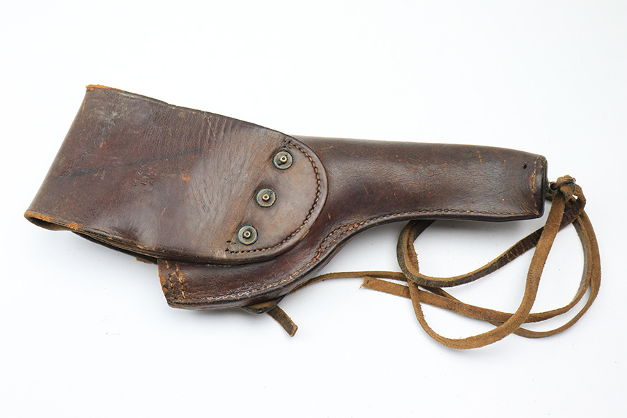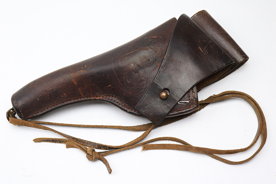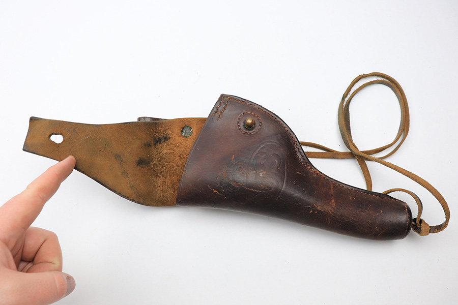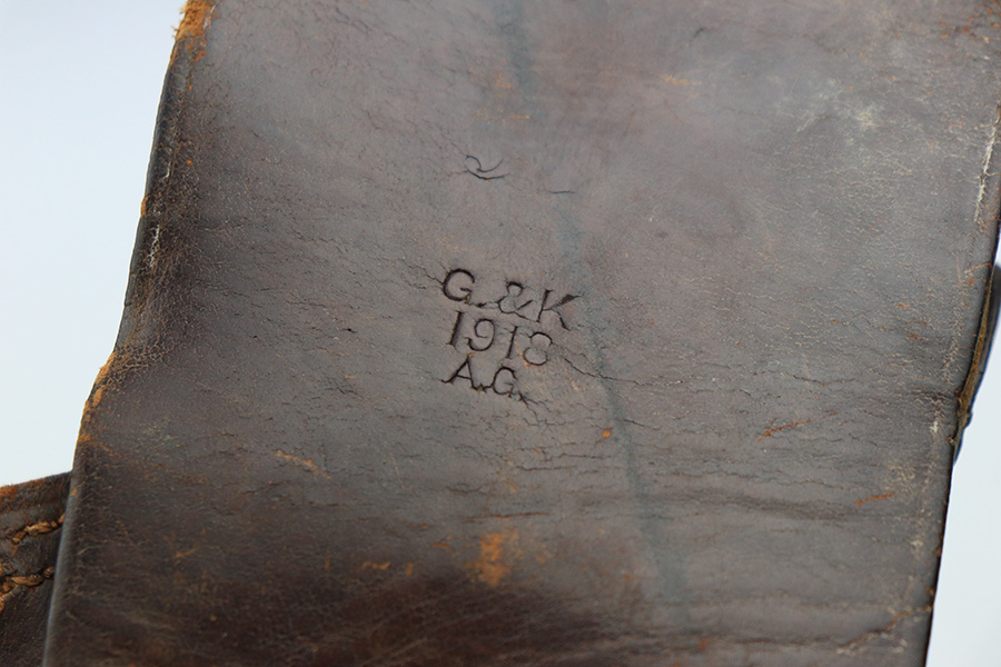 5/11/22 – This is an original WW1 production holster for the M1917 revolver by Colt or Smith & Wesson. The holster is in great overall condition with some mild surface wrinkling throughout the exterior. There’s some typical aging wear but no major issues and normal pliability overall. There are no stitching issues. The back leather is maker stamped and dated. A fairly scarce WW1 production holster.