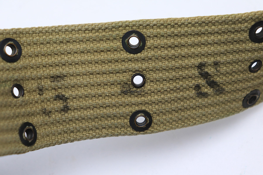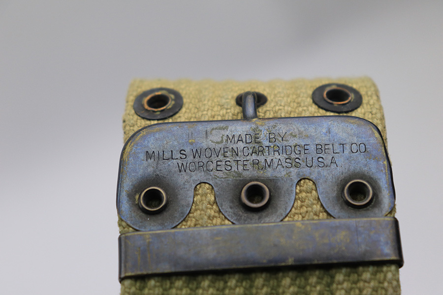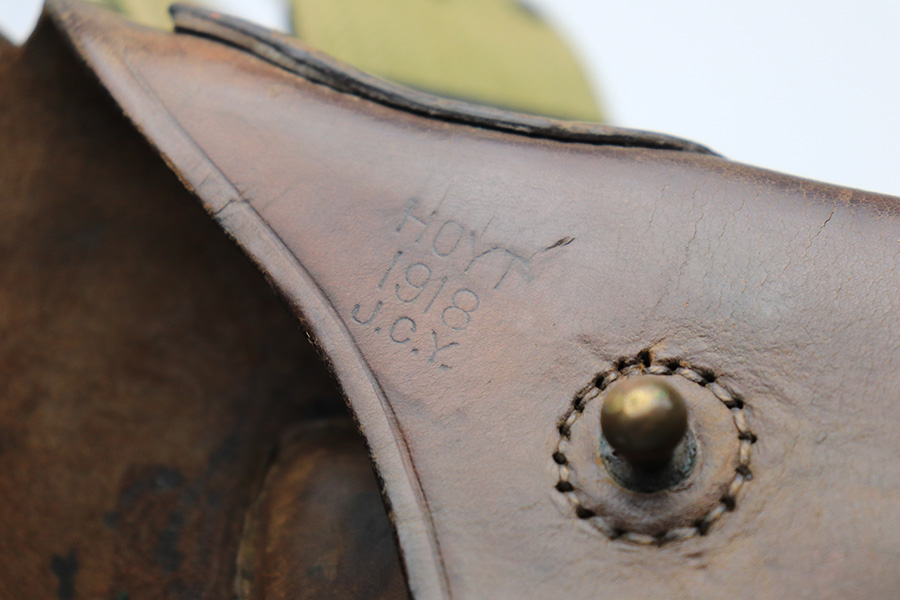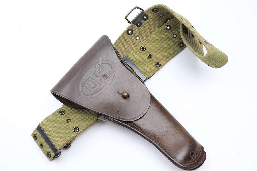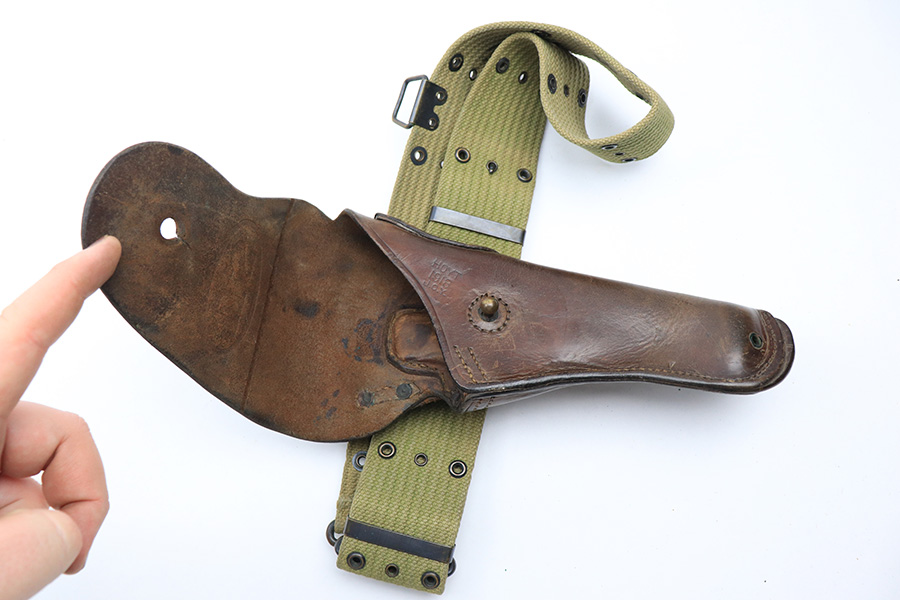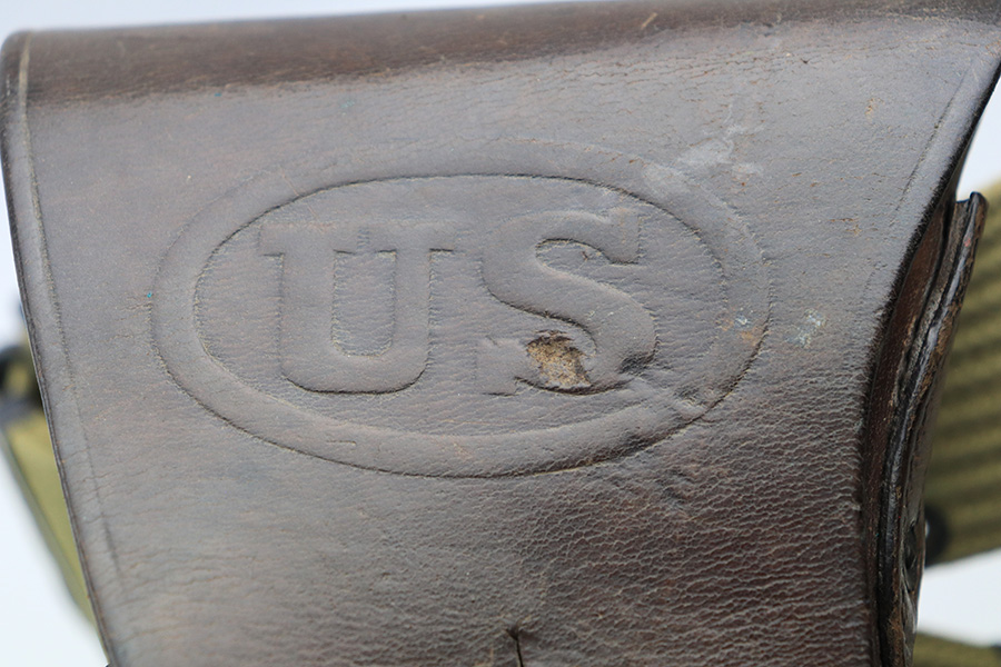 5/11/22 – This is an original WW1 production holster for the model 1911 pistol. The holster comes with a canvas US belt maker stamped by Mills. The holster has strong, dark brown leather that has some mild surface wrinkling throughout. The back leather has some surface cracking but this doesn’t go deep into the leather. Maker stamped and dated under the front flap, near the brass closure knob. Clean interior leather and excellent stitching throughout.