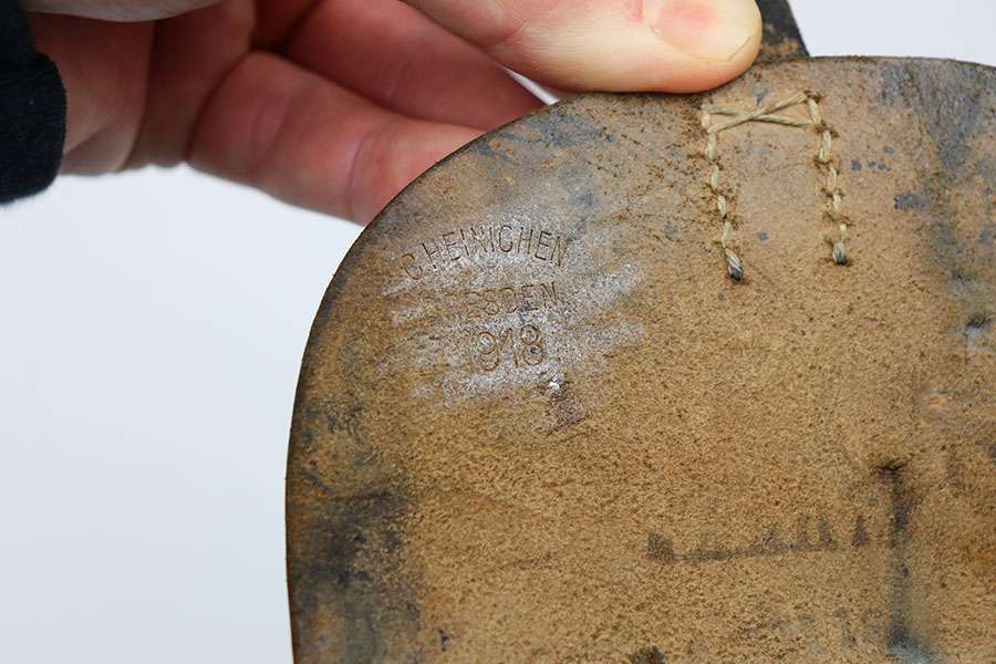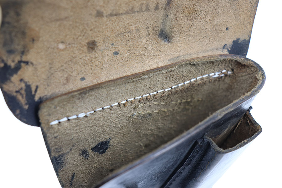 4/8/21 – This is an original WW1 era holster for a model 1914 Mauser or similar sized handgun. The holster is maker stamped and dated on the interior of the lid with a crisp, legible stamp. The leather has normal pliability and appears to have been dyed black previously, but most of the dye has since worn off. The stitching is all original except for the line of stitching that connects the lid to body of leather – see photos. Priced accordingly.