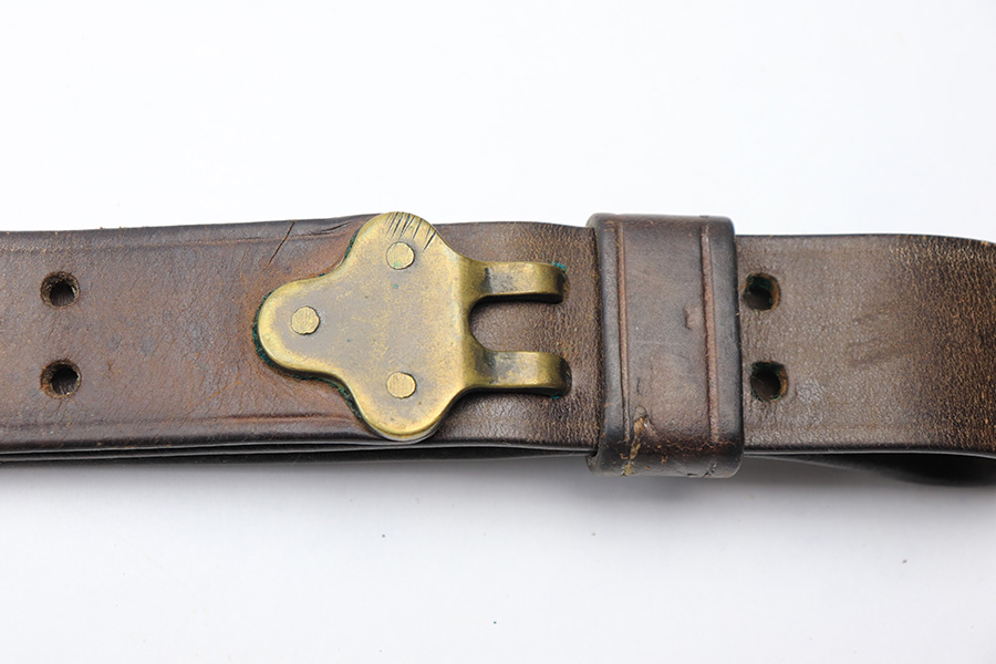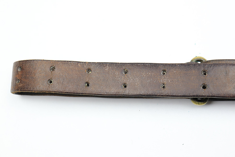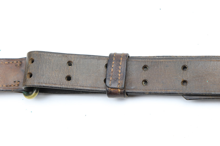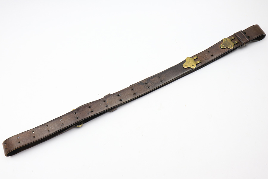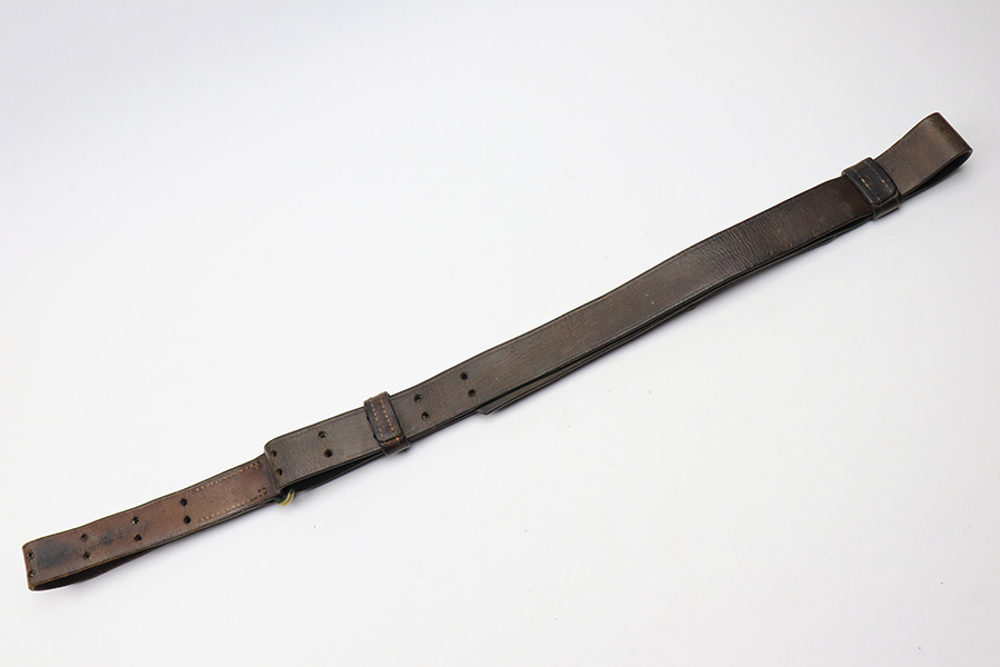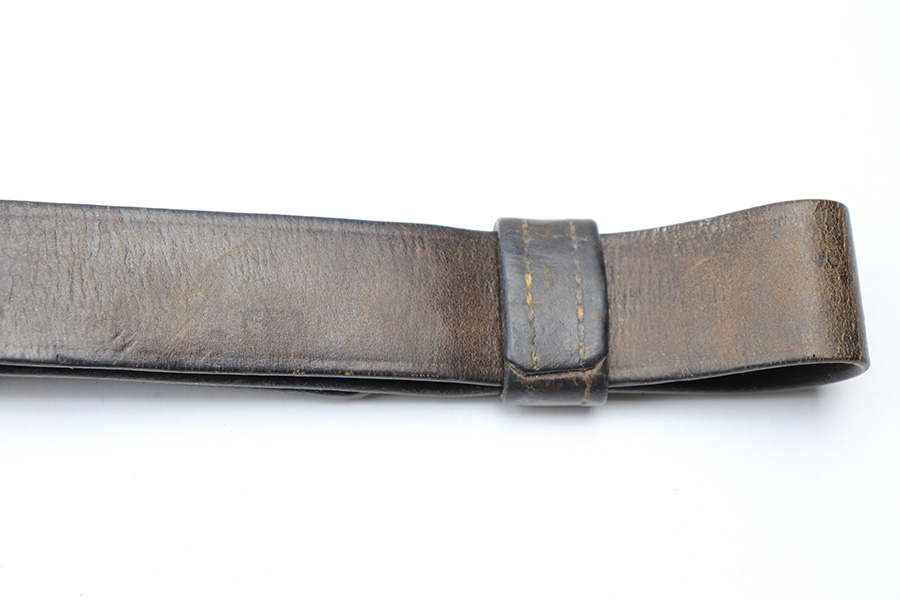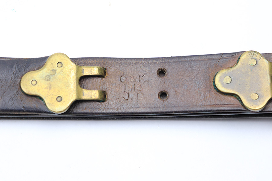 3/29/22 – This is an original leather rifle sling for a M1903 Springfield rifle or similar WW1 era US rifle. The sling is in great condition with some normal signs of aging and wrinkling / surface wear on the leather but no major issues. All stitching and metal fixtures are in great shape. The leather is maker stamped and dated “G&K 1918 J.B.”. A great addition to any US WW1 rifle.