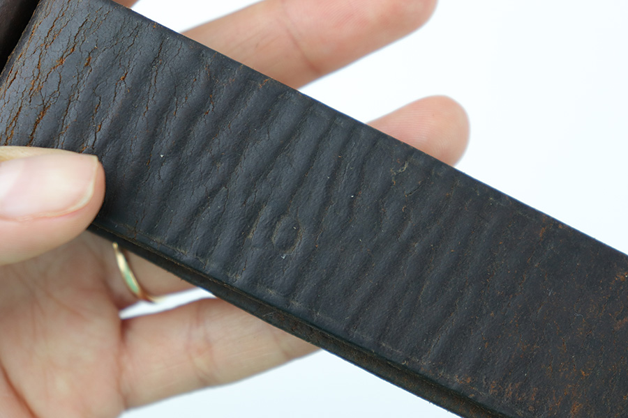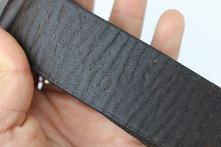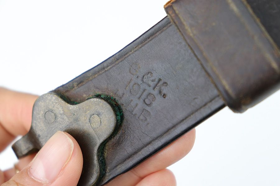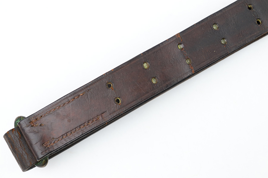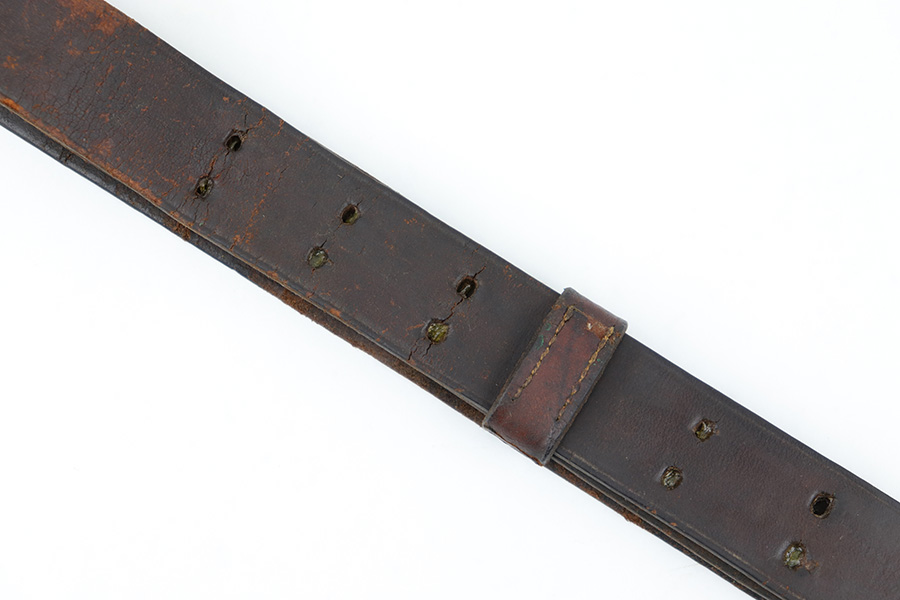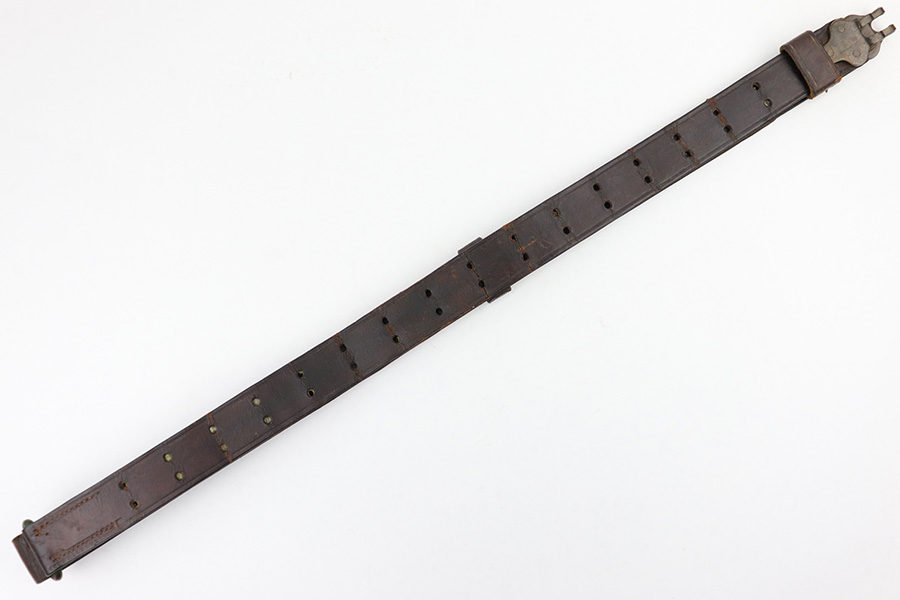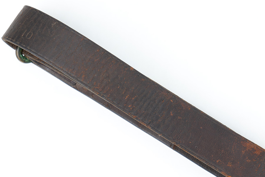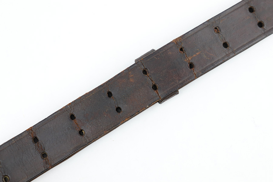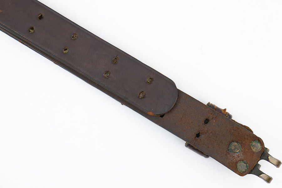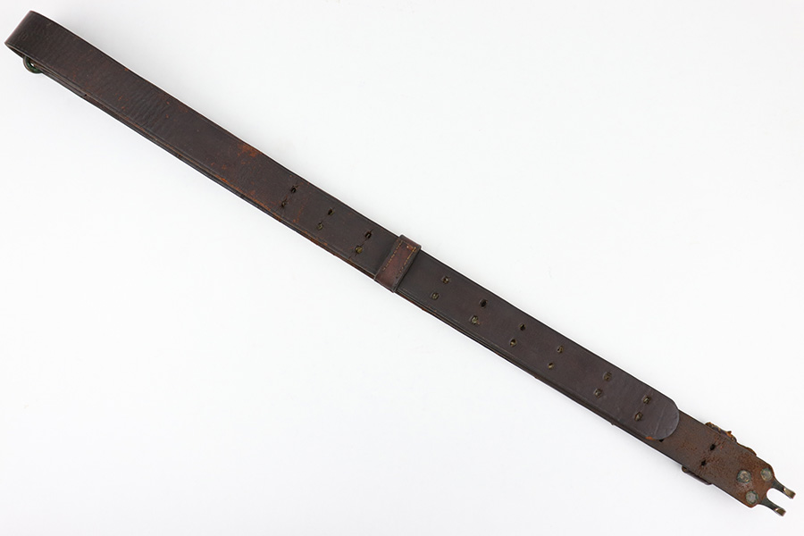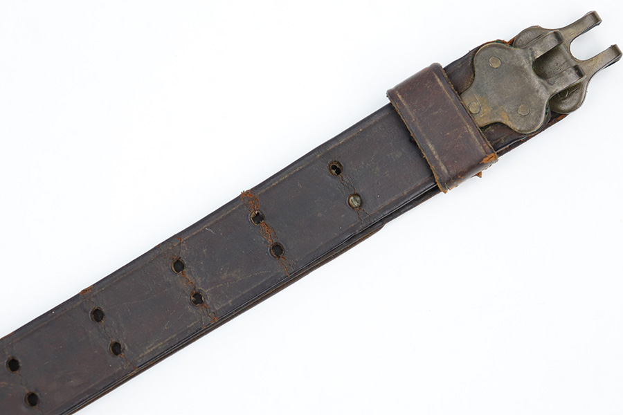 6/27/23 – This is an original WW1 era production US M1907 leather rifle sling. This example is in very good overall condition with some light surface wrinkling and signs of use and aging throughout the leather. A few of the adjustment holes have weakness and cracking around the surrounding leather (this is from previous use). The sling is completely intact and original with brass fixtures. One end of the sling is 1918 date stamped with a “G.&K.” maker stamp and “H.H.B.” inspector stamp.