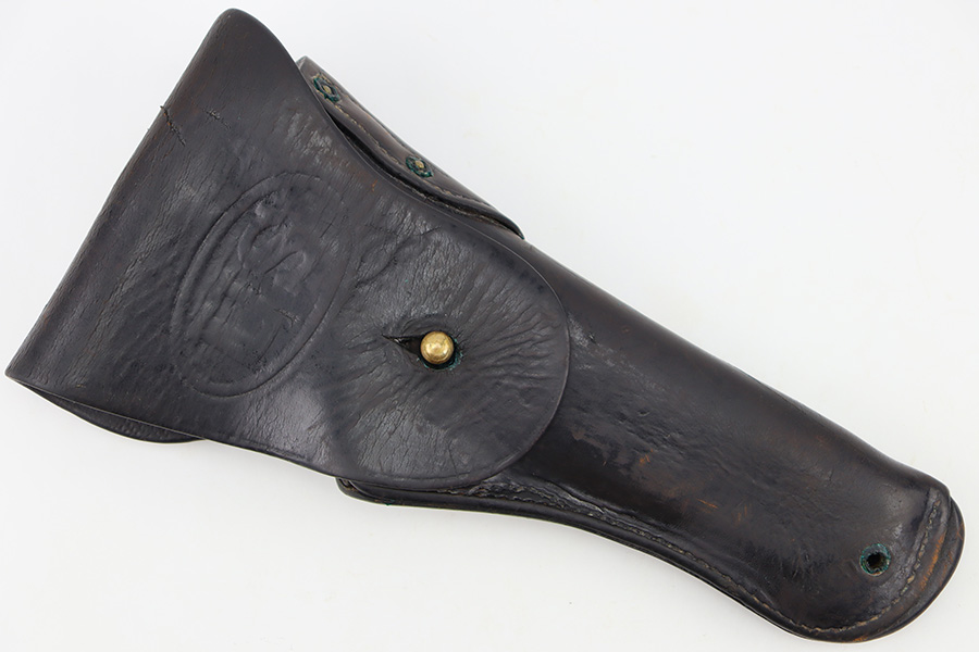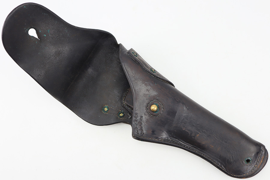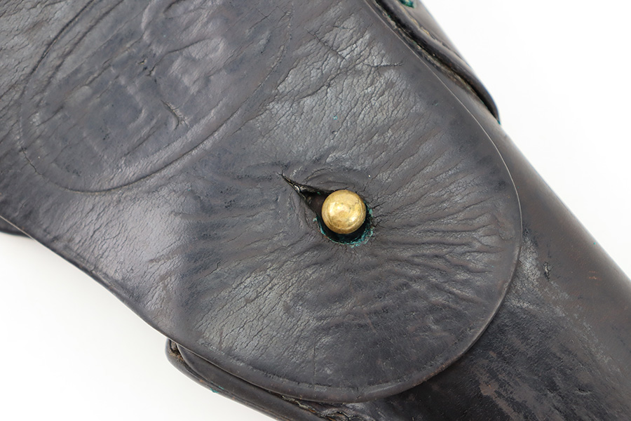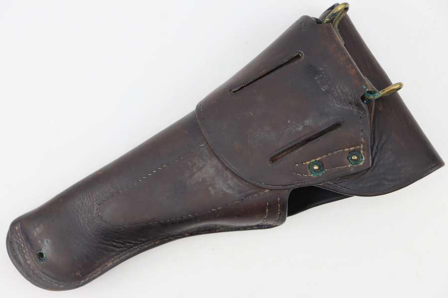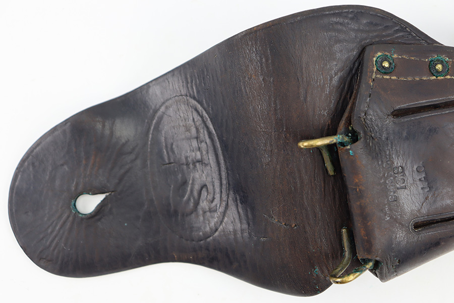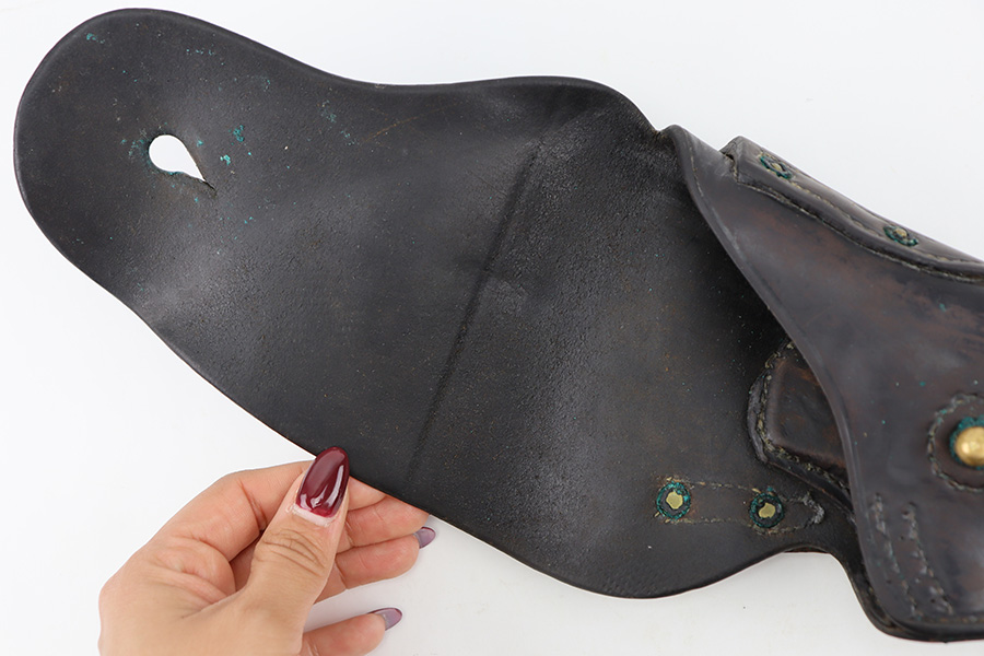 11/28/23 – This is an original WW1 production M1916 leather holster by Warren Leather Goods. Made for the M1911 Colt pistol, this holster is in good overall condition with signs of aging and use throughout. The leather is soft and pliable with wrinkling and surface wear throughout. The front “US” stamp is still visible however, and the back leather has a faint maker stamp, visible date stamp, and an inspector initial stamp. Some loose stitching on the back leather, but this doesn’t affect functionality and all the leather is secure. Most of the original stitching is still intact.