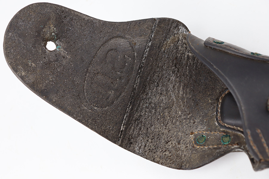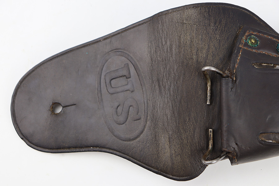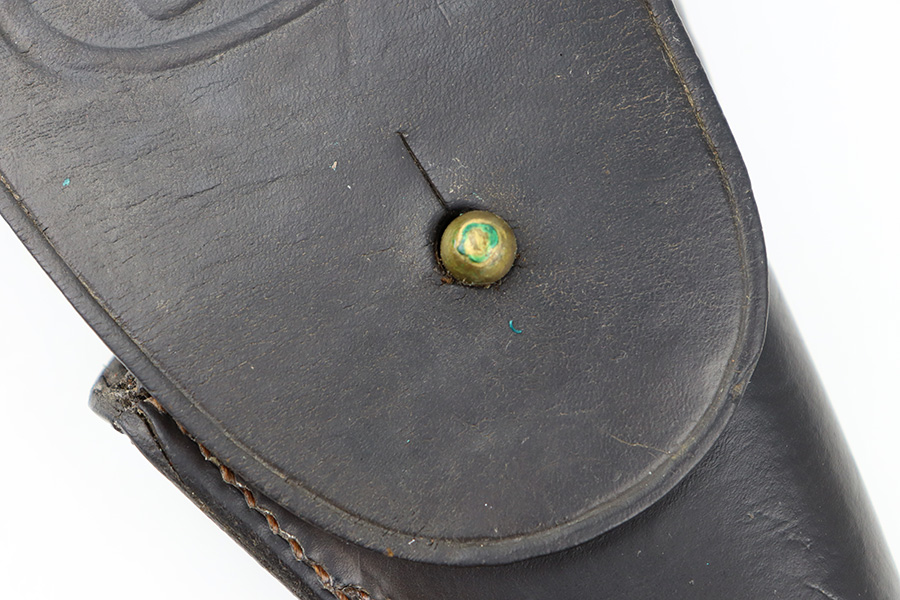 12/18/23 – This is an original 1918 dated M1916 holster. The holster is in great condition with dark chocolate brown leather and all original stitching intact. Normal pliability and light signs of previous use. US stamped on the front leather, and maker and date stamped on the back leather. No stitching issues.