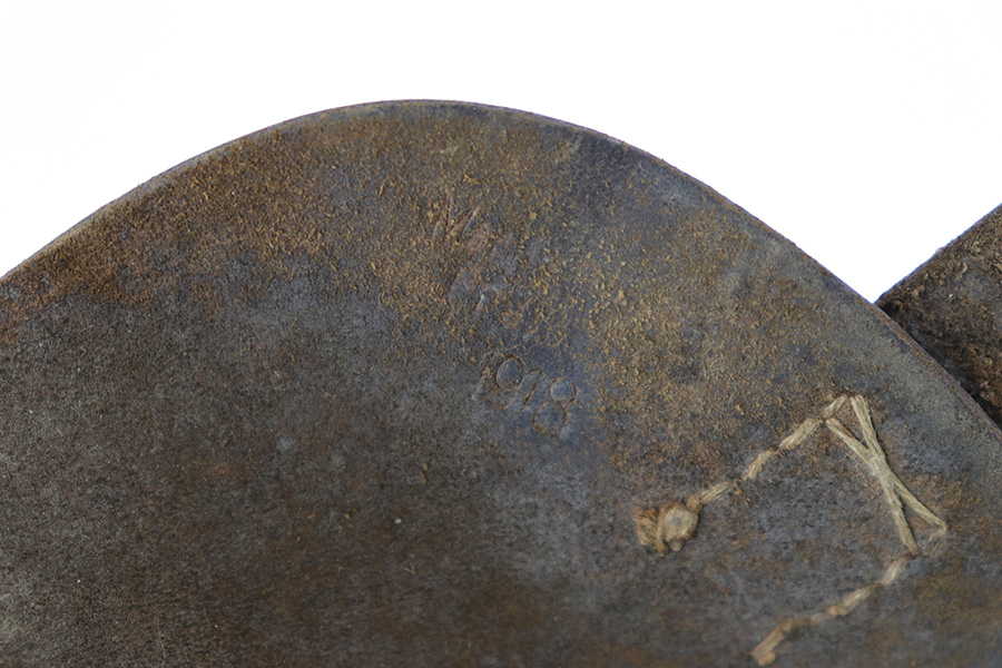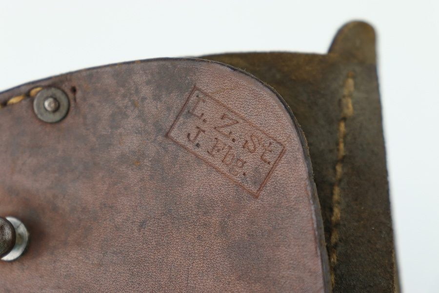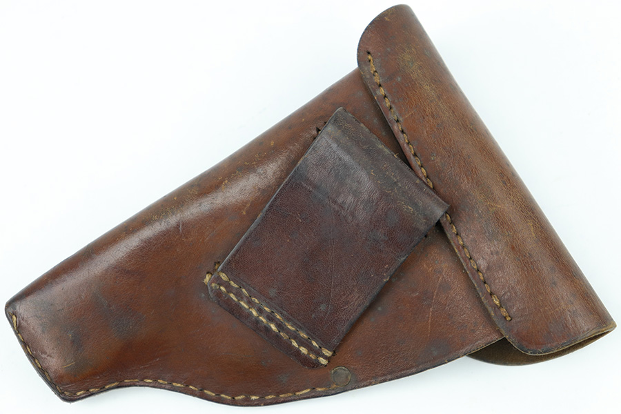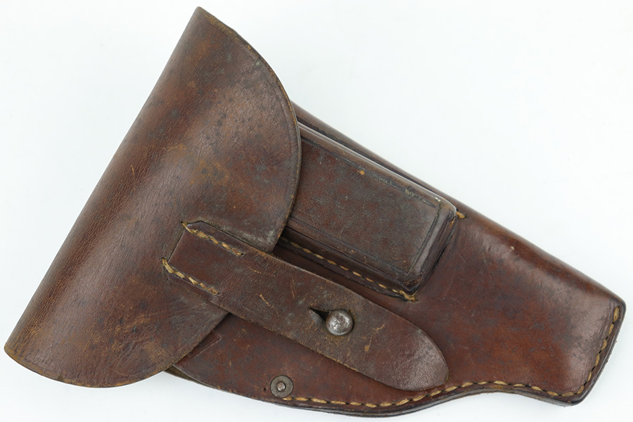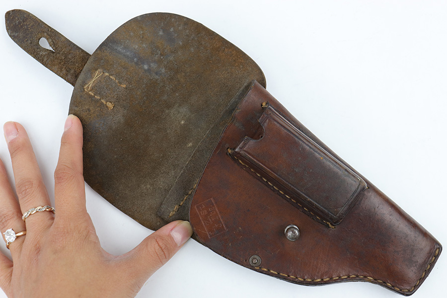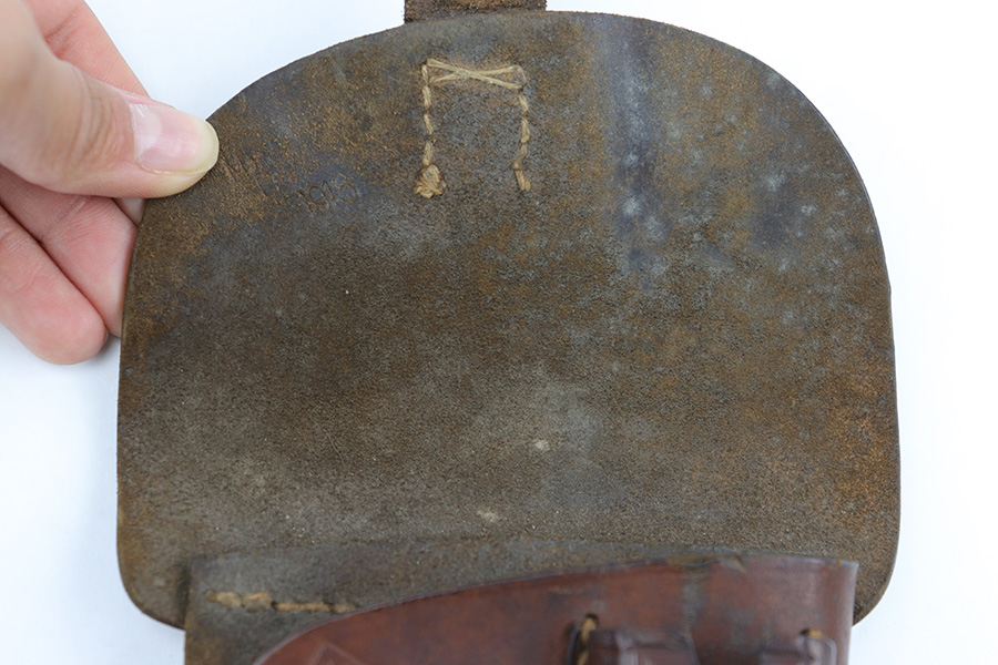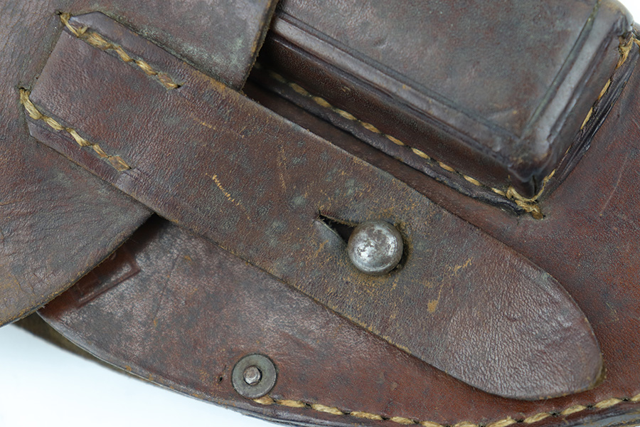 6/30/23 – This is an original 1918 dated pistol holster from WW1. The holster is likely for a Mauser model 1910 or model 1914, based on the size, but any similar sized pistol would also be appropriate. The holster is in very good overall condition with normal pliability and light surface wear throughout the exterior. There are some extra stitching holes inside the magazine pouch, which suggests that the mag pouch has been modified post-factory in some way (we’re not sure). The stitching is excellent and original throughout the holster.