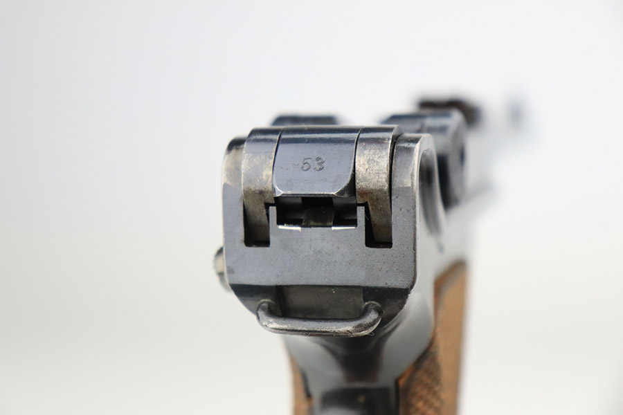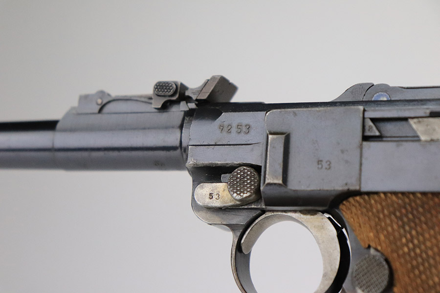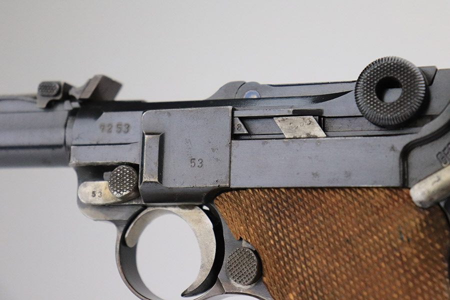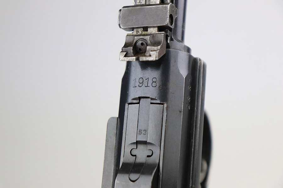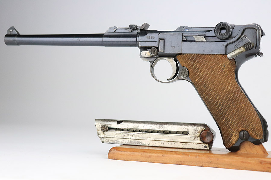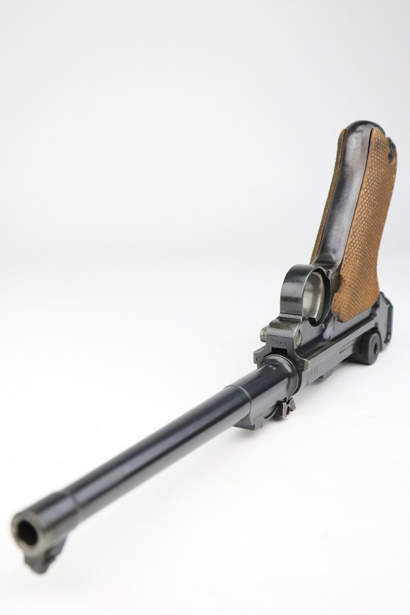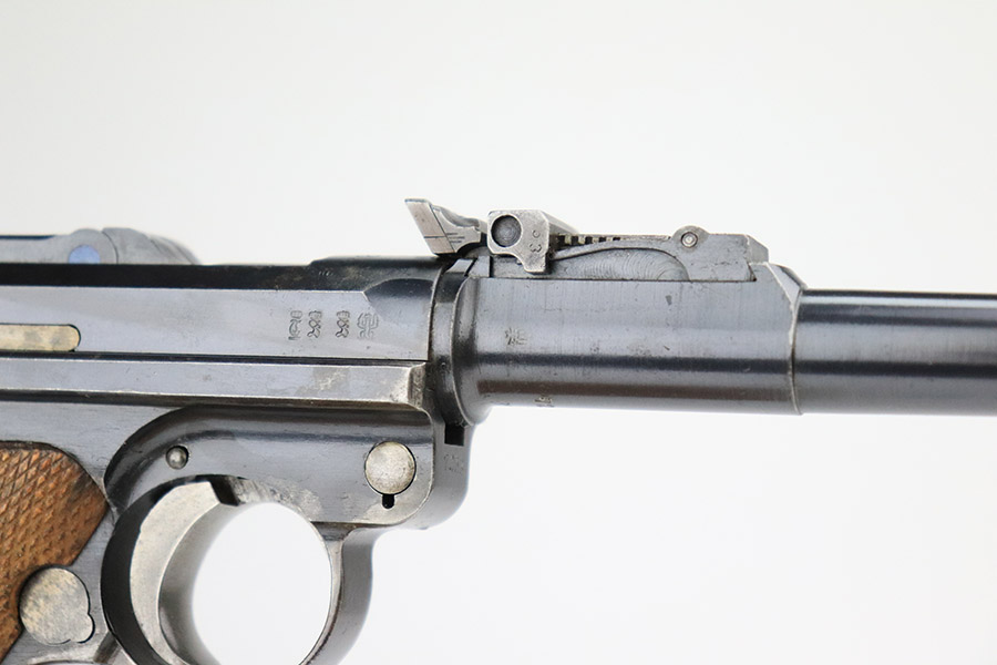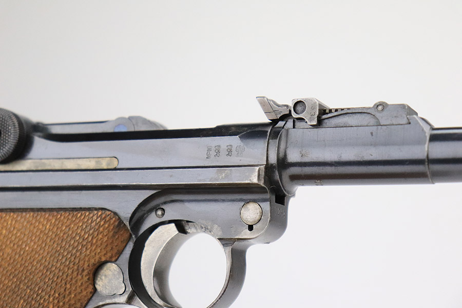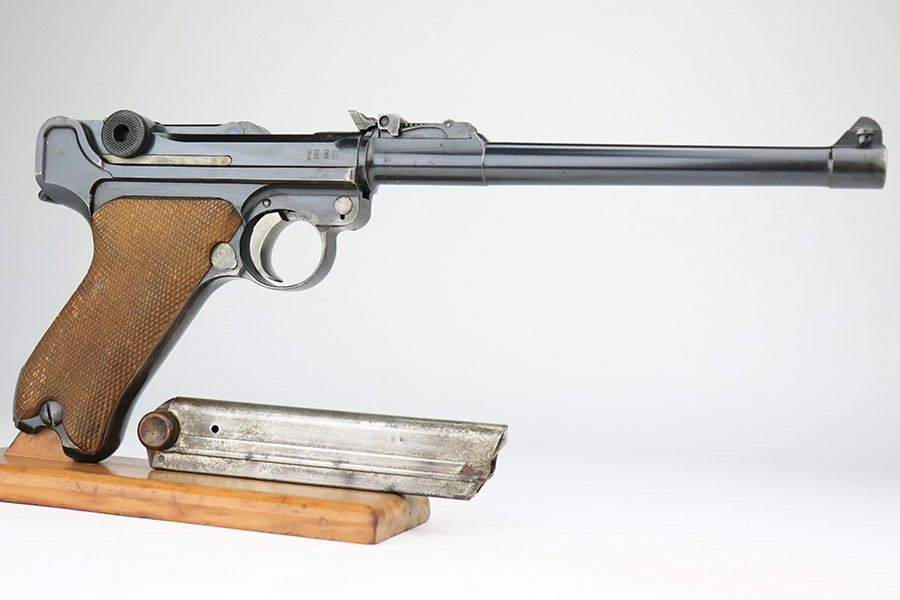 11/23/22 – This is a very nice example of a DWM Artillery Luger issued to the Imperial German military in 1918. It is all matching and has the proper Imperial military acceptance proofs. The gun has retained about 92% of its original finish. The majority of the wear is on the front strap, where there is also some light brown patina and a few tiny pits. Very minor wear on some of the high edges. A few small dots of wear on the back strap. Minor pin-pricking around the muzzle. Comes with minty matching-numbered wood grips and a period-correct but mismatched magazine. Very nice bore with good rifling.