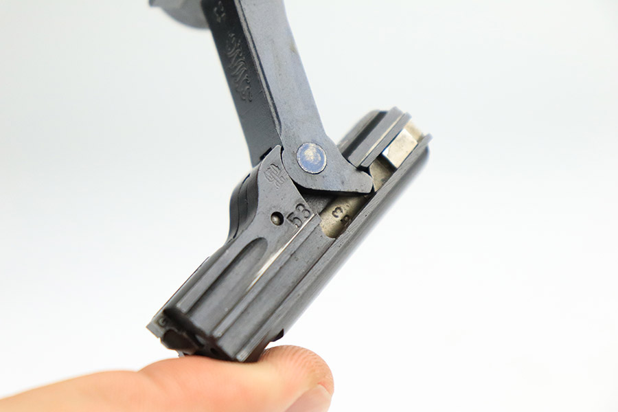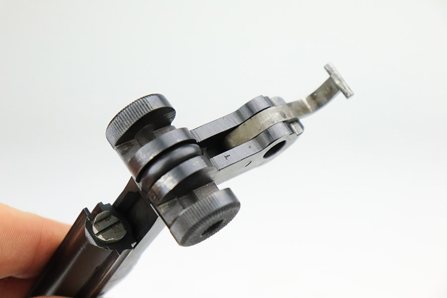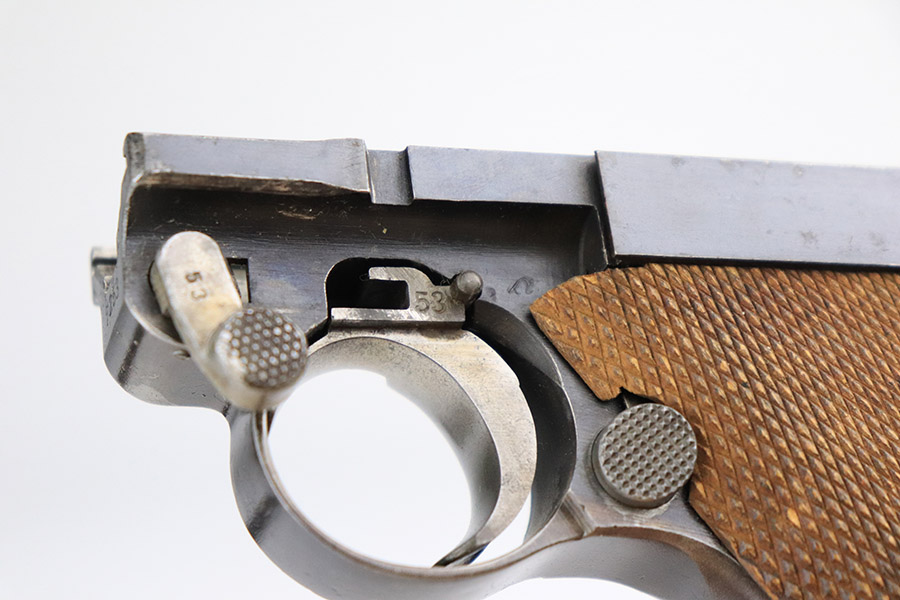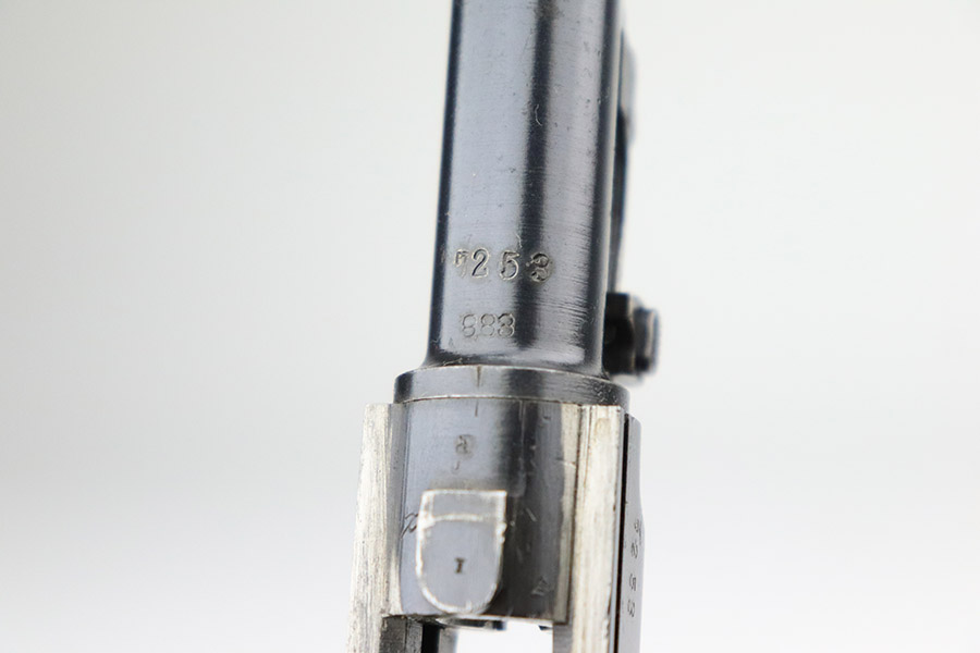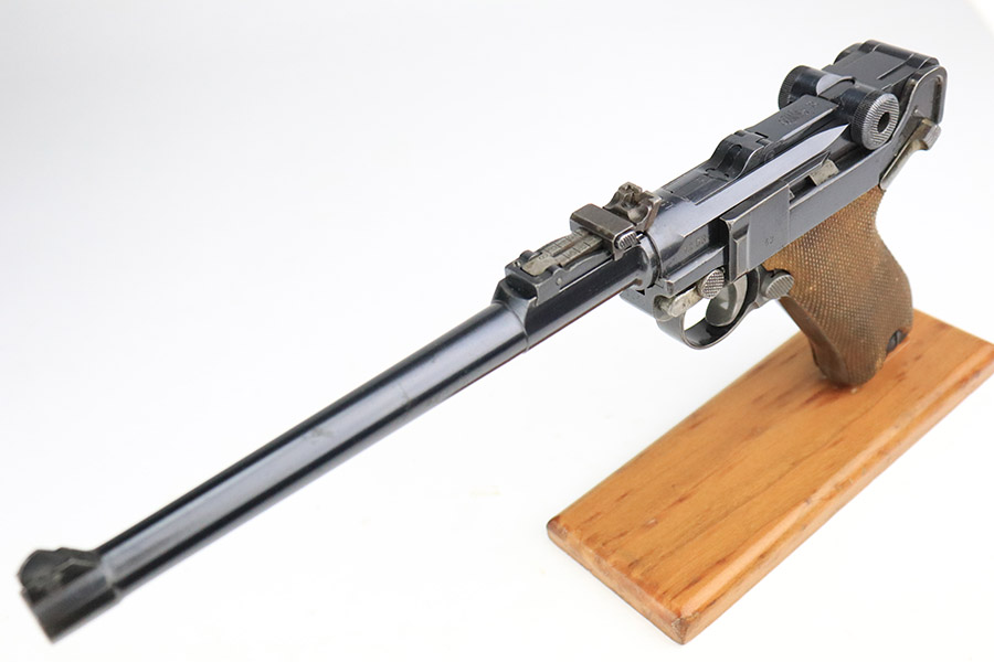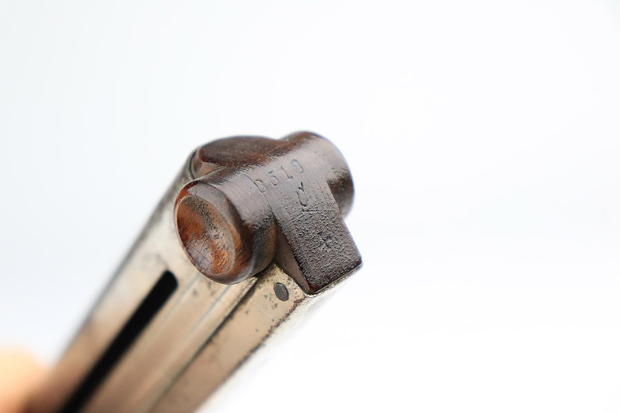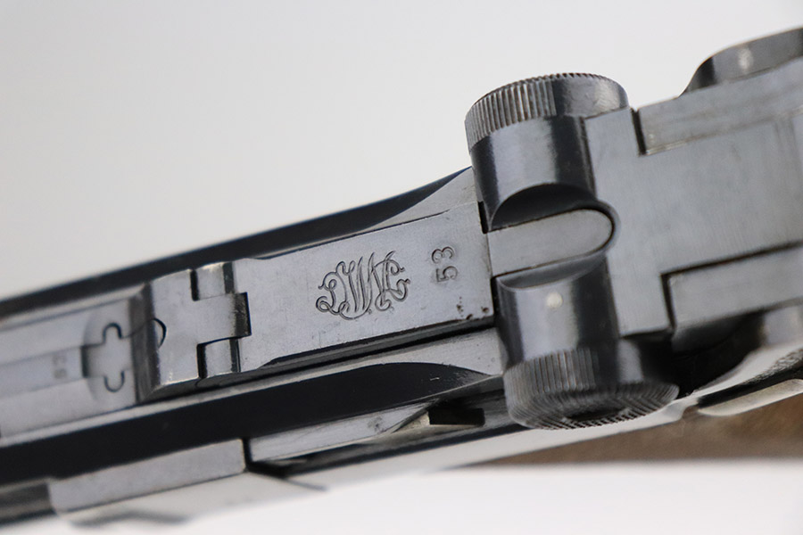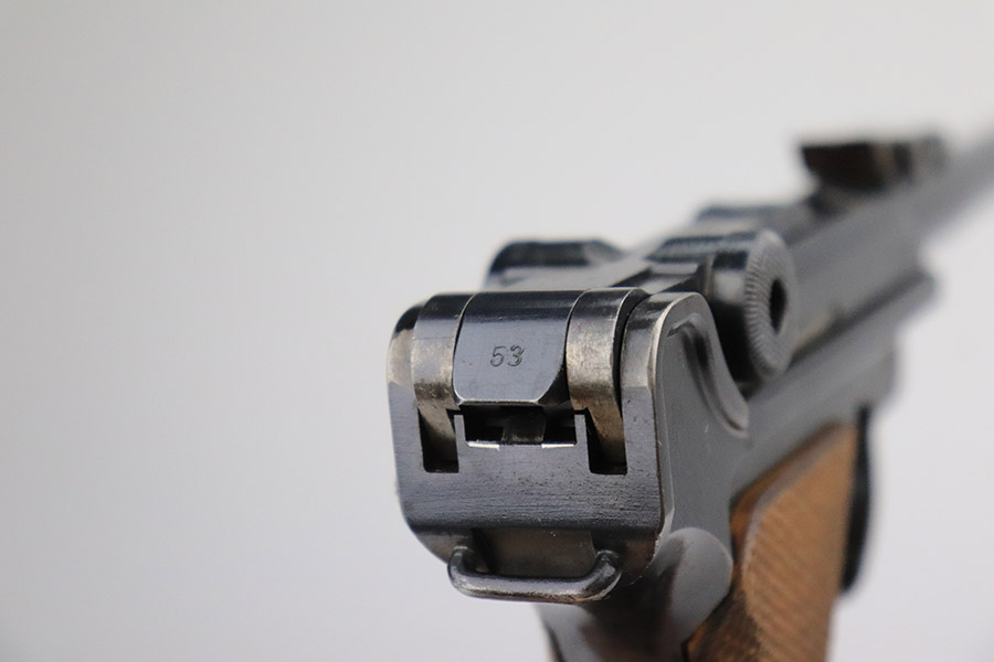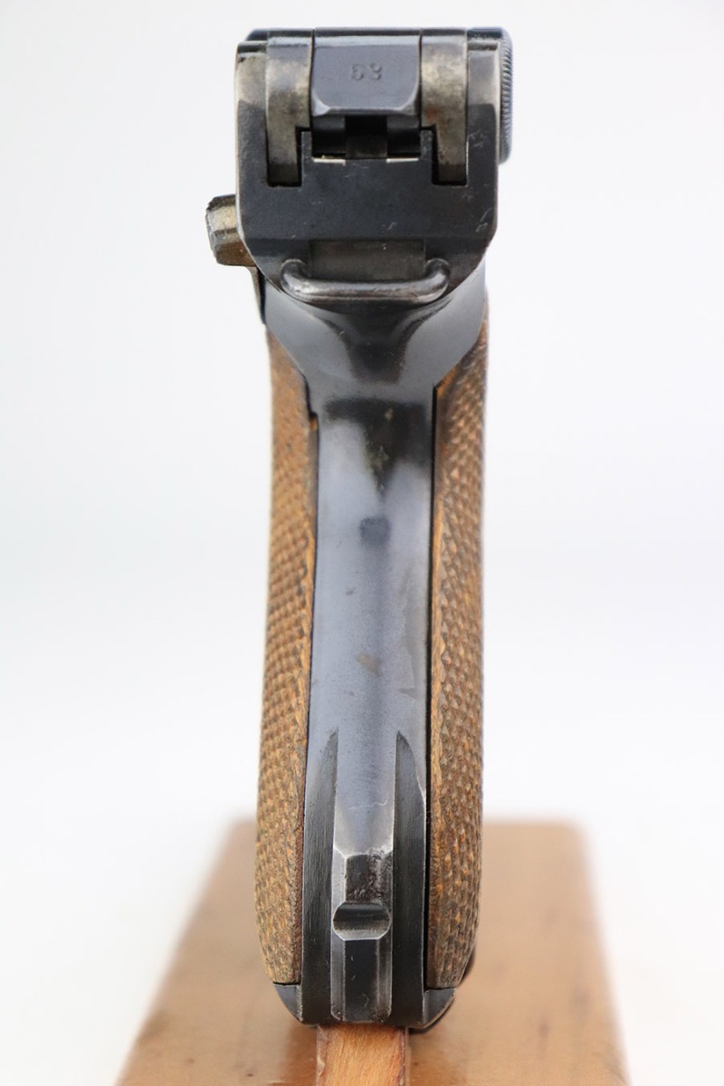 11/23/22 – This is a very nice example of a DWM Artillery Luger issued to the Imperial German military in 1918. It is all matching and has the proper Imperial military acceptance proofs. The gun has retained about 92% of its original finish. The majority of the wear is on the front strap, where there is also some light brown patina and a few tiny pits. Very minor wear on some of the high edges. A few small dots of wear on the back strap. Minor pin-pricking around the muzzle. Comes with minty matching-numbered wood grips and a period-correct but mismatched magazine. Very nice bore with good rifling.