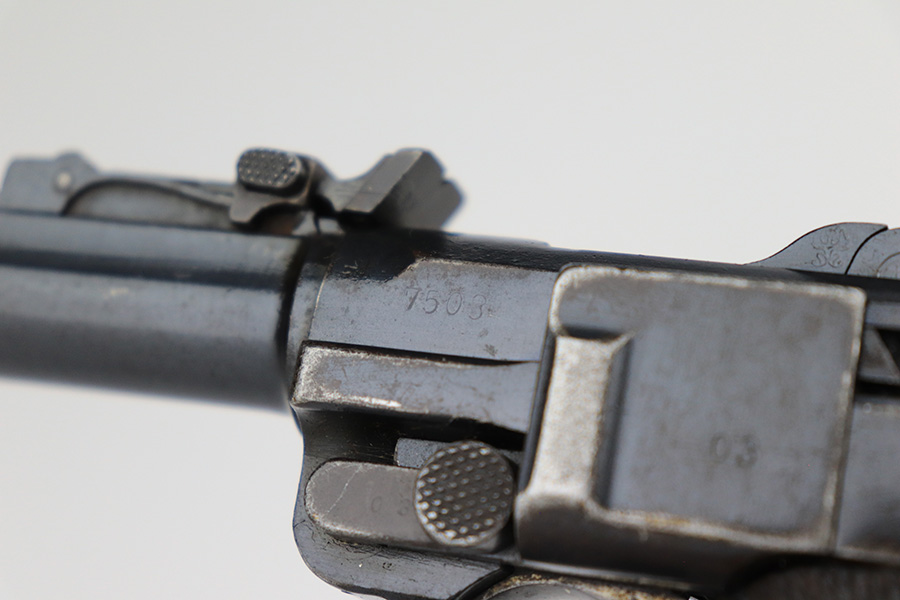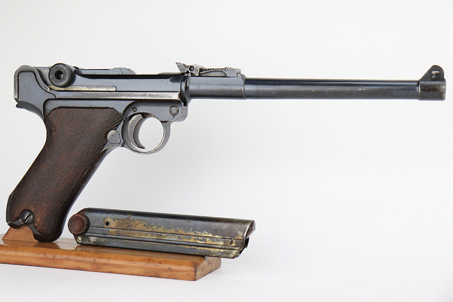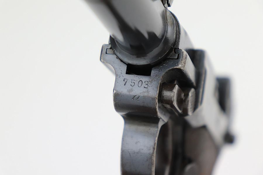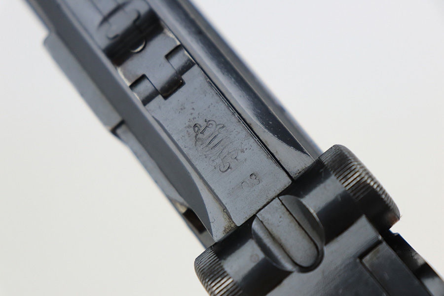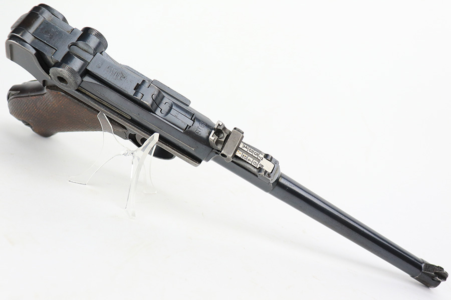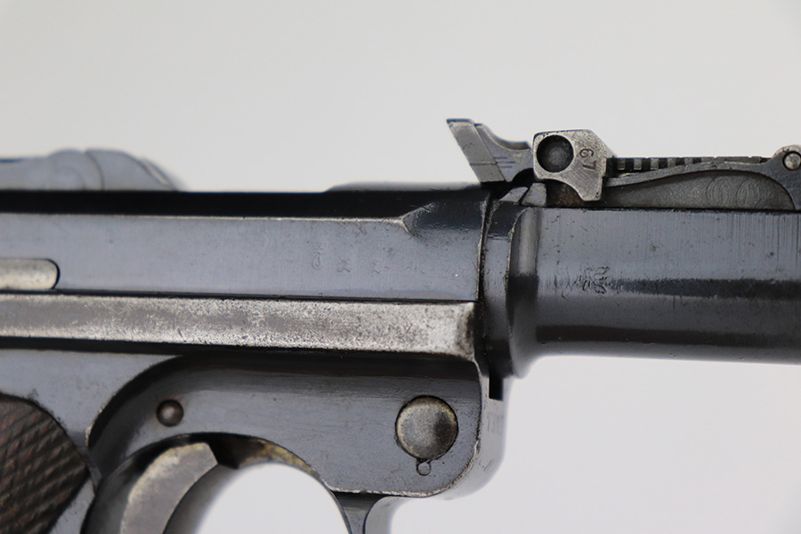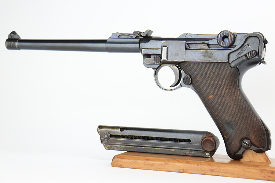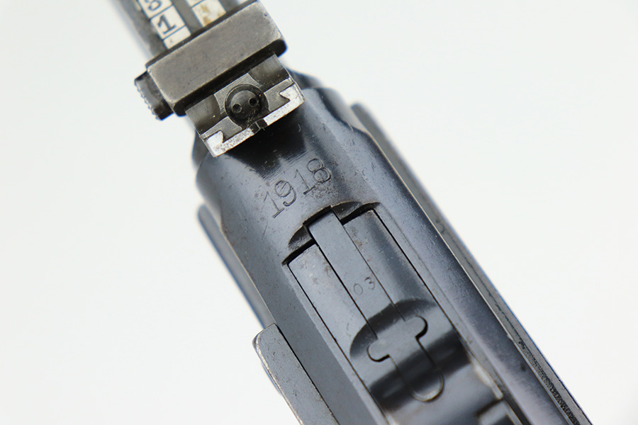 5/31/23 – This is a DWM Artillery Luger issued to the Imperial German military in 1918. Most of the gun is matching, but the rear sight is mismatched, and the barrel is an un-numbered replacement. We believe this gun has an old re-blued finish. There are areas of wear around the muzzle, on the side plate, on the side rails, and on the front strap. Light brown patina and spotty oxidation throughout. Some pitting around the muzzle. Fitted with fairly worn un-numbered wood grips. Comes with a refinished magazine with a replaced wood bottom. Mint bore.