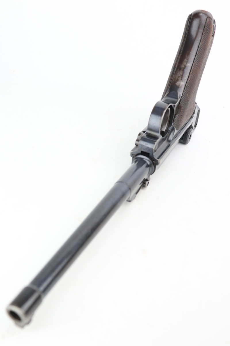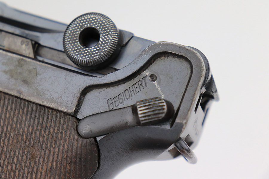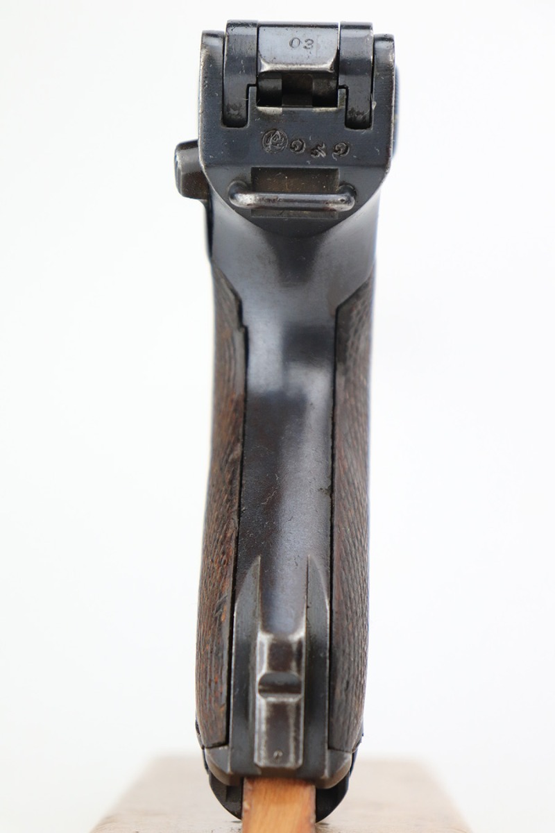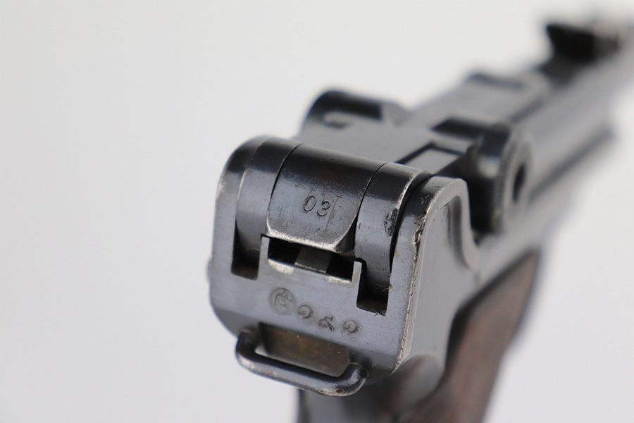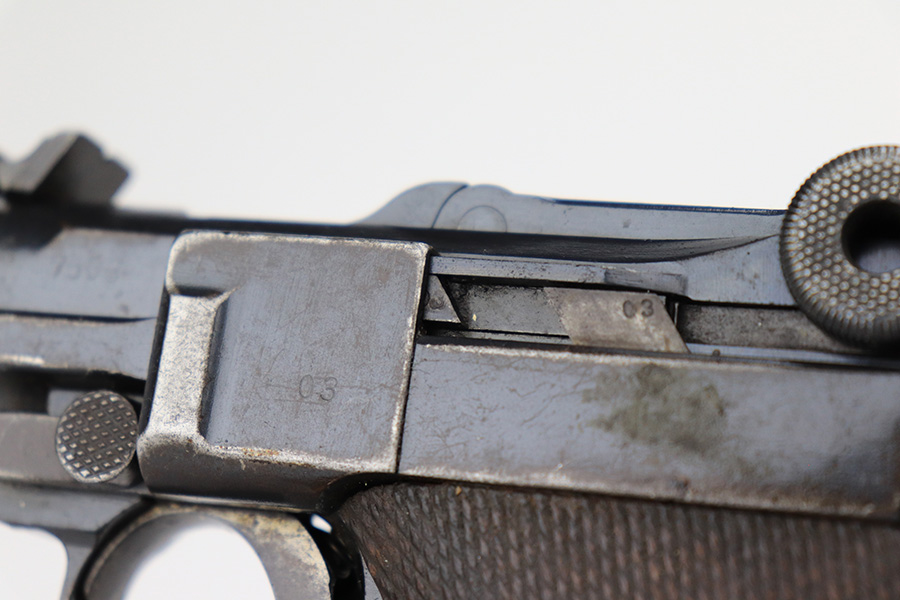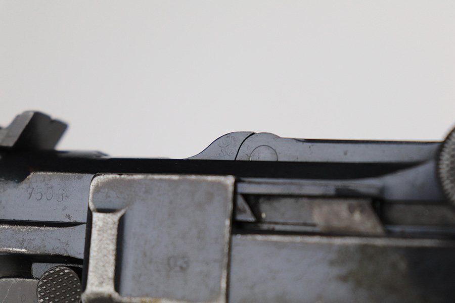 5/31/23 – This is a DWM Artillery Luger issued to the Imperial German military in 1918. Most of the gun is matching, but the rear sight is mismatched, and the barrel is an un-numbered replacement. We believe this gun has an old re-blued finish. There are areas of wear around the muzzle, on the side plate, on the side rails, and on the front strap. Light brown patina and spotty oxidation throughout. Some pitting around the muzzle. Fitted with fairly worn un-numbered wood grips. Comes with a refinished magazine with a replaced wood bottom. Mint bore.