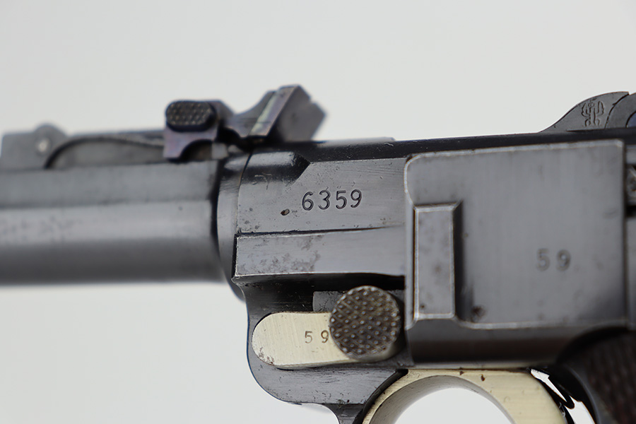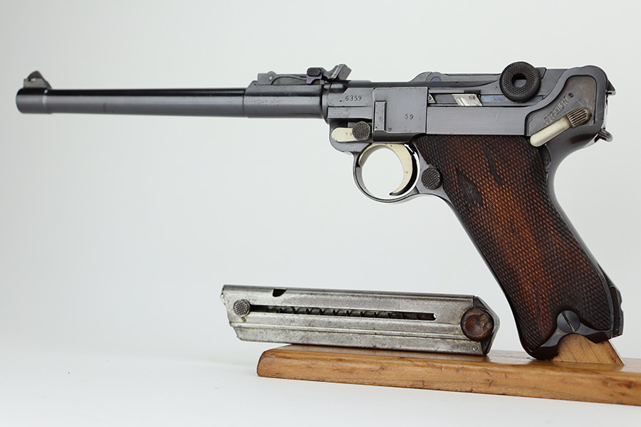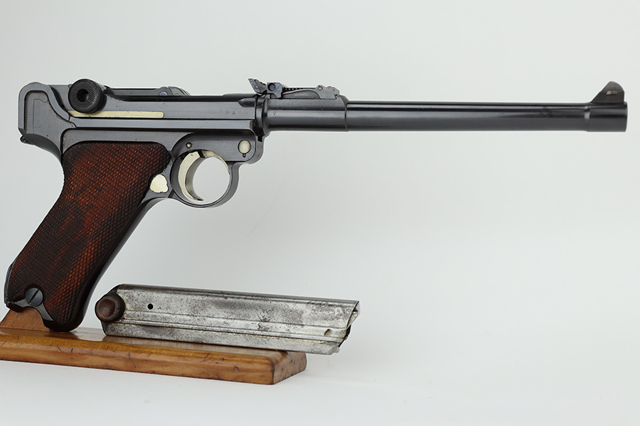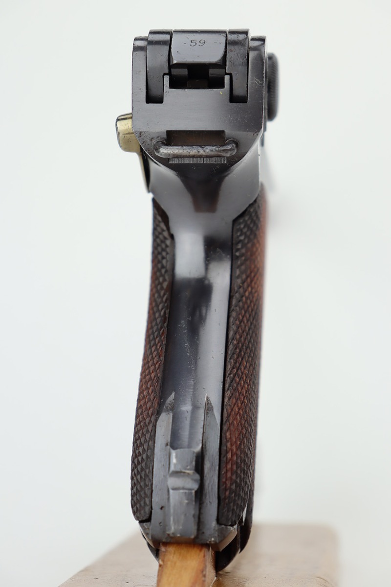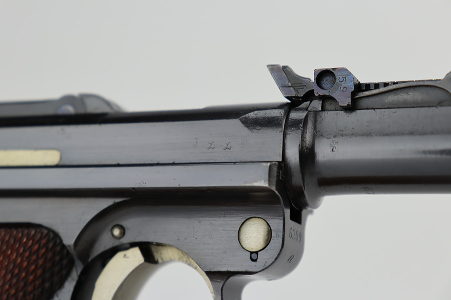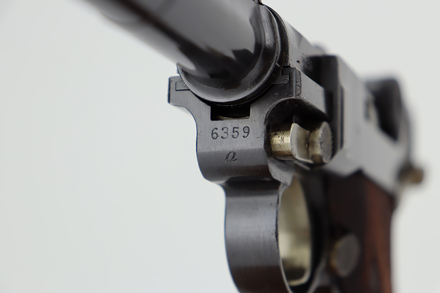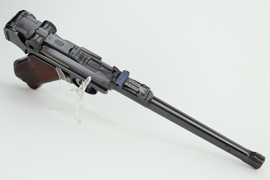 7/28/23 – This is an excellent example of a DWM Artillery Luger issued to the Imperial German military in 1918. All matching with the proper Imperial military proofs. This particular gun is a professional restoration done by the well-known Thomas Heller. Included with the gun are original receipts and correspondence between Thomas and the customer. The gun shows virtually no actual finish loss – just a few tiny scratches here and there and some tiny pits under the finish around the toggle. Replaced grip screws. Fitted with matching-numbered wood grips – the left side has two obvious gouges and a small chip in the upper corner. Comes with a period-correct but fairly worn magazine. The bore has good rifling, but there is minor frosting throughout.