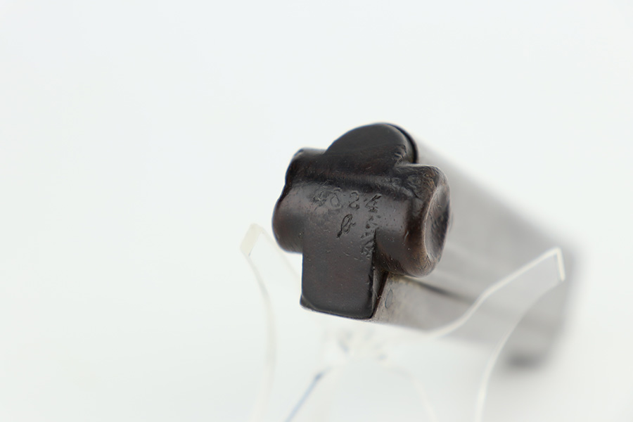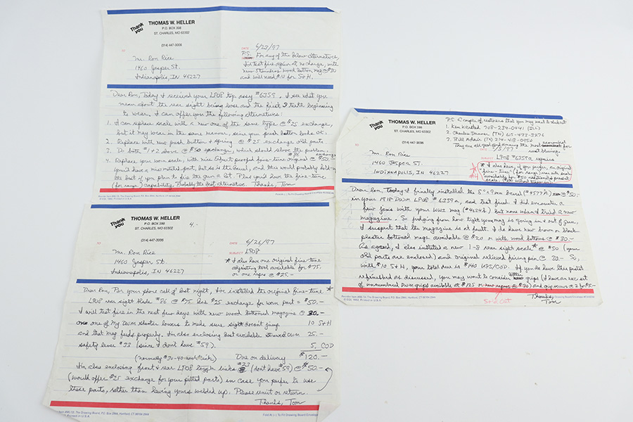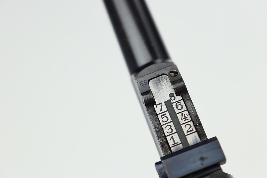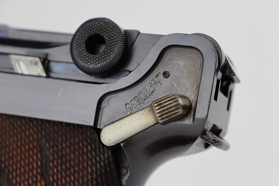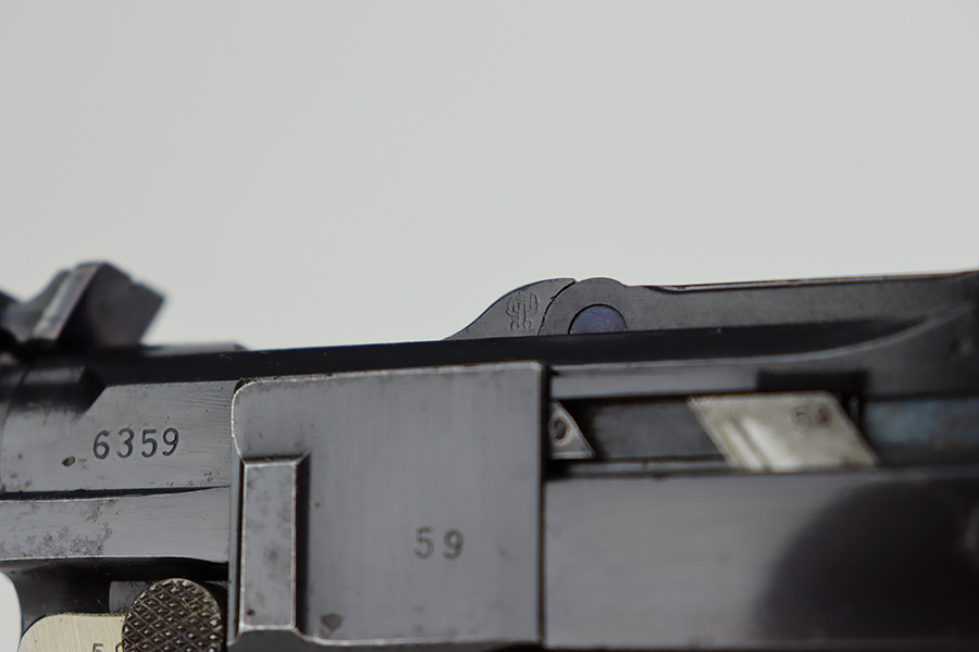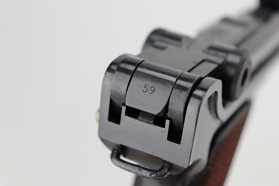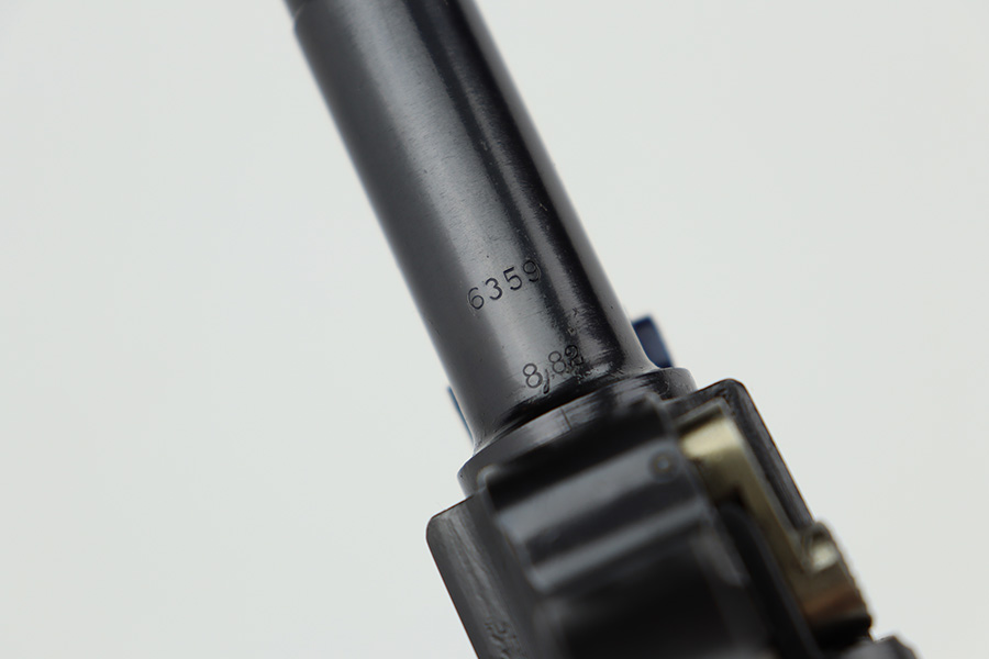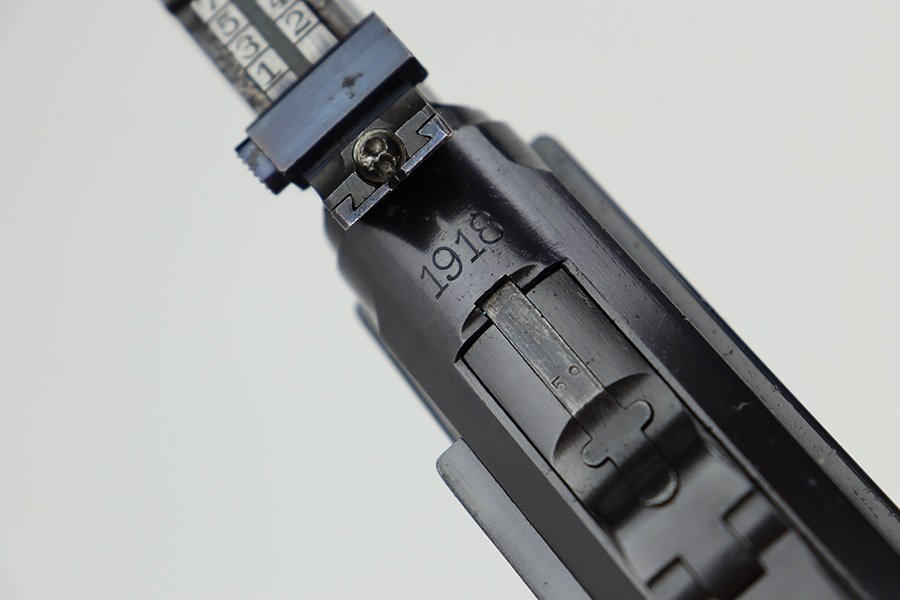 7/28/23 – This is an excellent example of a DWM Artillery Luger issued to the Imperial German military in 1918. All matching with the proper Imperial military proofs. This particular gun is a professional restoration done by the well-known Thomas Heller. Included with the gun are original receipts and correspondence between Thomas and the customer. The gun shows virtually no actual finish loss – just a few tiny scratches here and there and some tiny pits under the finish around the toggle. Replaced grip screws. Fitted with matching-numbered wood grips – the left side has two obvious gouges and a small chip in the upper corner. Comes with a period-correct but fairly worn magazine. The bore has good rifling, but there is minor frosting throughout.