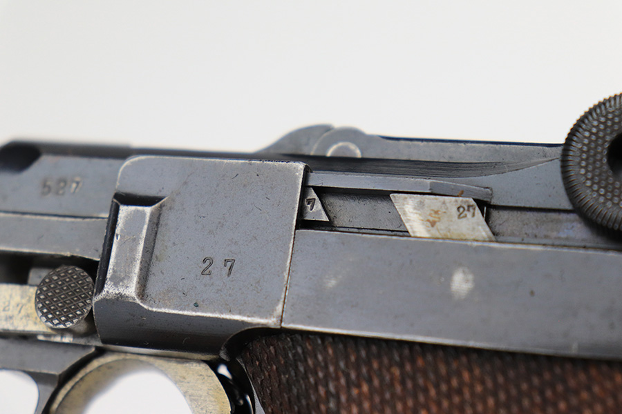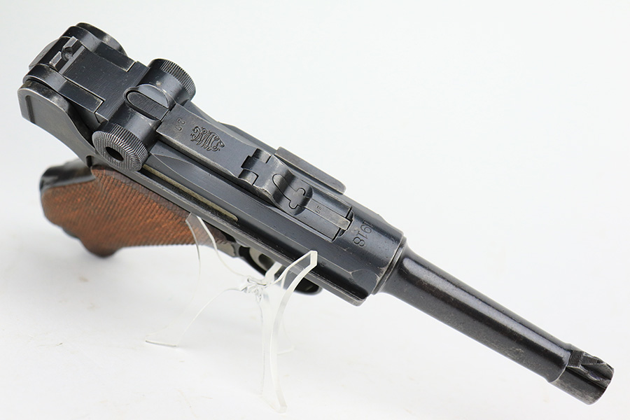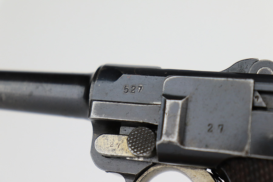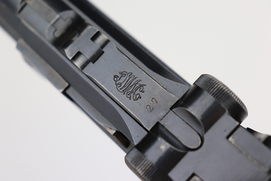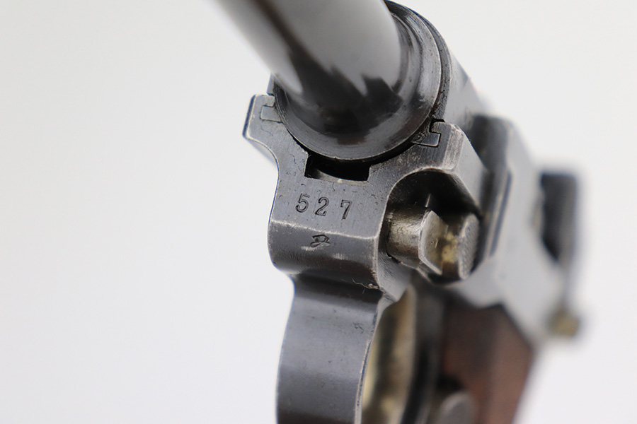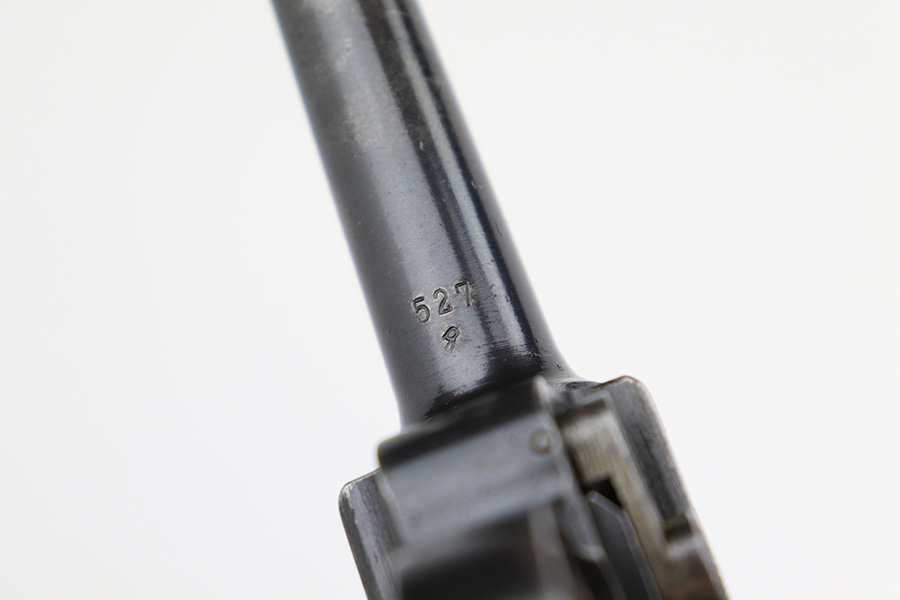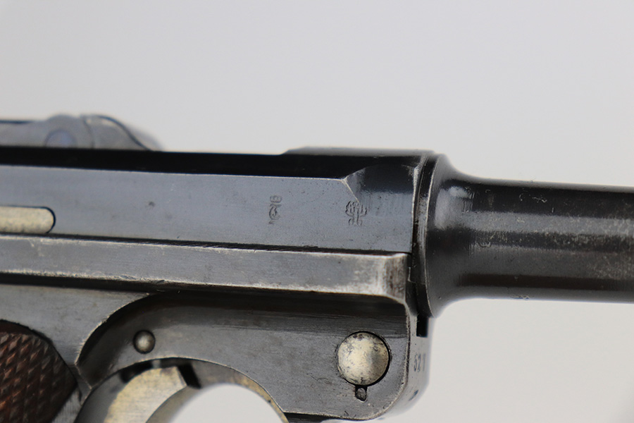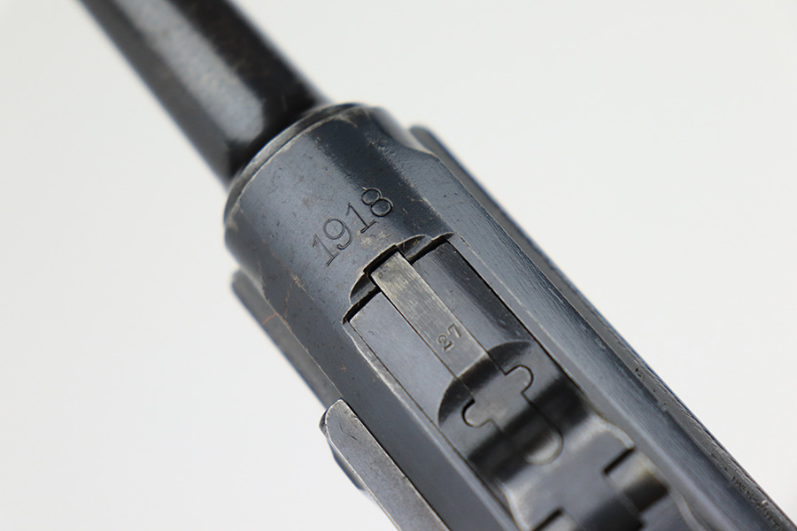 6/1/23 – This is a nice example of a DWM Luger issued to the Imperial German military in 1918. It is all matching, Imperial proofed, and has the proper proofs throughout. This one is interesting, because it only has one proof on the right side of the slide. Presumably it never made it to military-issue before WW1 ended. In any case, the gun has retained roughly 85% of its original finish. The majority of the wear is along the barrel and around the muzzle. Minor wear on the side plate and high edges. A few tiny dots of wear on the left side of the frame and on the grip straps. Some light spotty oxidation on the grip straps as well. Fitted with excellent matching-numbered wood grips. Comes with a period-correct but mismatched magazine. The rifling in the bore is fairly worn with minor pitting throughout.