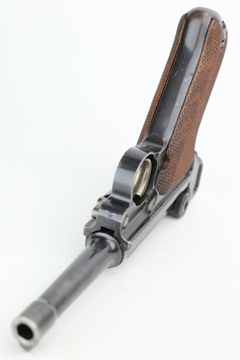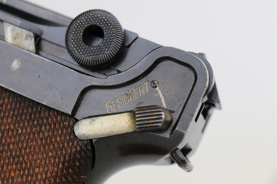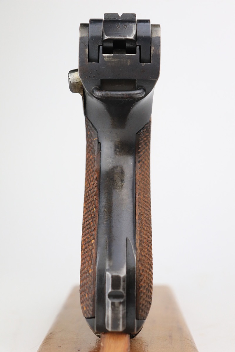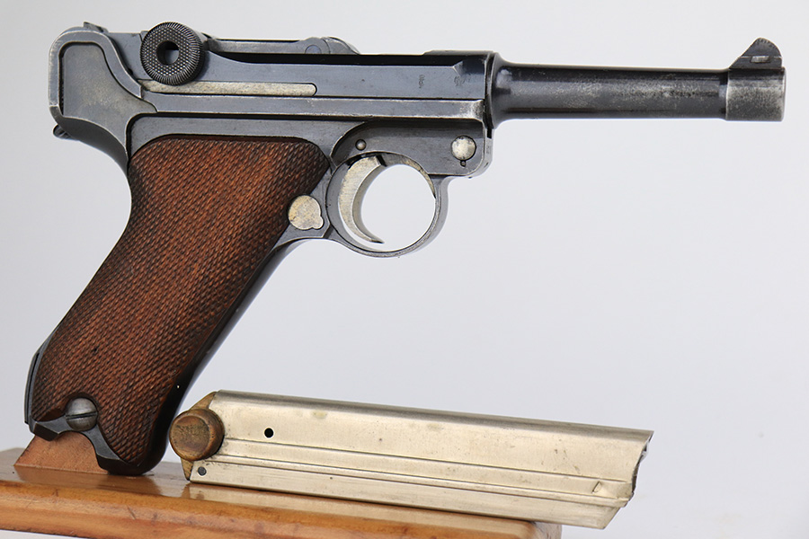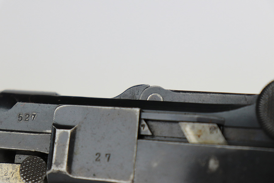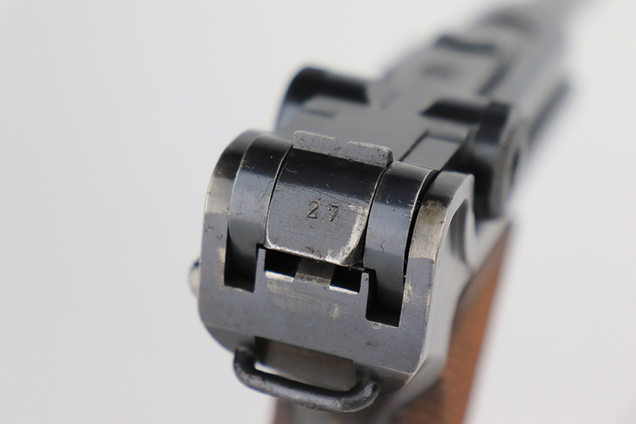 6/1/23 – This is a nice example of a DWM Luger issued to the Imperial German military in 1918. It is all matching, Imperial proofed, and has the proper proofs throughout. This one is interesting, because it only has one proof on the right side of the slide. Presumably it never made it to military-issue before WW1 ended. In any case, the gun has retained roughly 85% of its original finish. The majority of the wear is along the barrel and around the muzzle. Minor wear on the side plate and high edges. A few tiny dots of wear on the left side of the frame and on the grip straps. Some light spotty oxidation on the grip straps as well. Fitted with excellent matching-numbered wood grips. Comes with a period-correct but mismatched magazine. The rifling in the bore is fairly worn with minor pitting throughout.