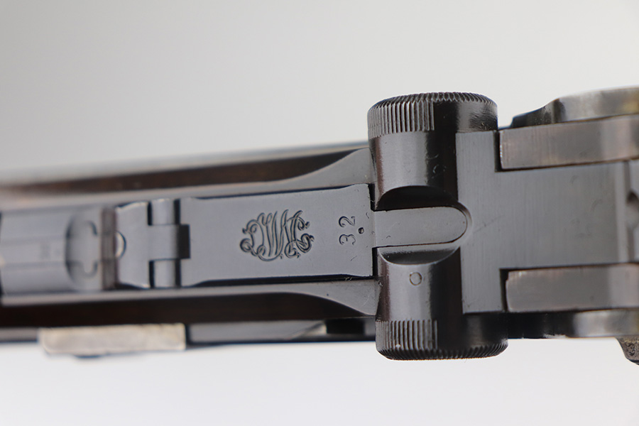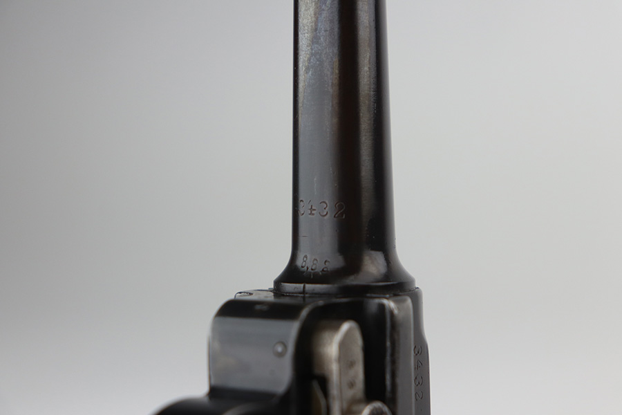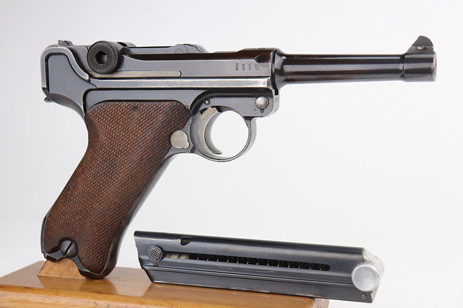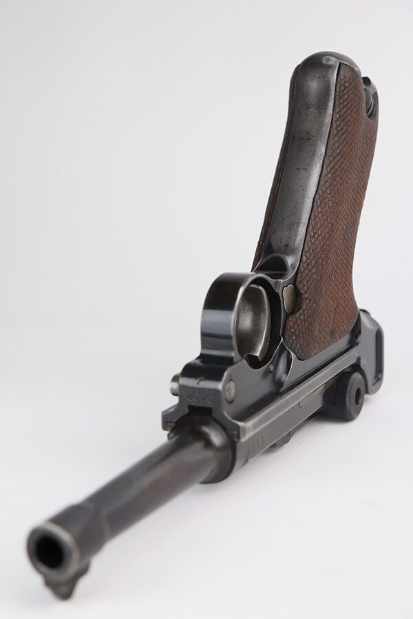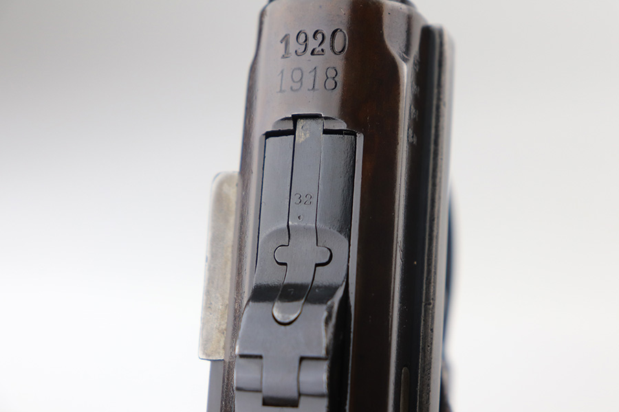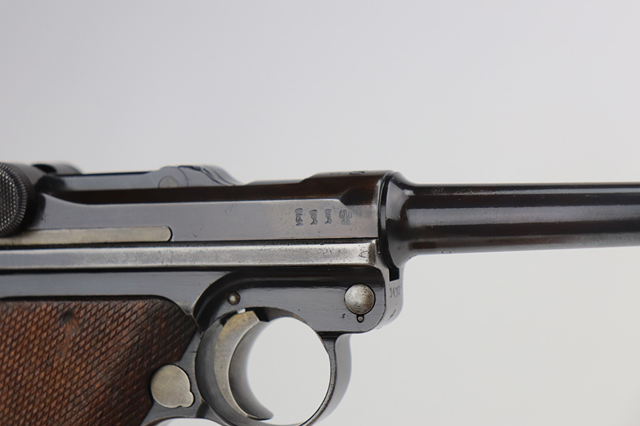 6/18/21 – This is a nice example of a DWM Luger issued to the Imperial German military in 1918. It is matching and has the proper Imperial military proofs. It was reworked in the 1920’s, as evidenced by the “1920” rework stamp on the chamber. It comes with a WW2-era matching magazine, so it was likely issued to the Nazi police force during WW2. The magazine was likely numbered at the police arsenal. It has retained roughly 65% of its finish. Most of the wear is on the straps, but there is wear on the side plate, side rails, and around the muzzle. Areas of thinning and patina on the left side of the frame and around the chamber. Comes with excellent period-correct grips that are mismatched. The bore has pretty good rifling with minor pin-pricking throughout.