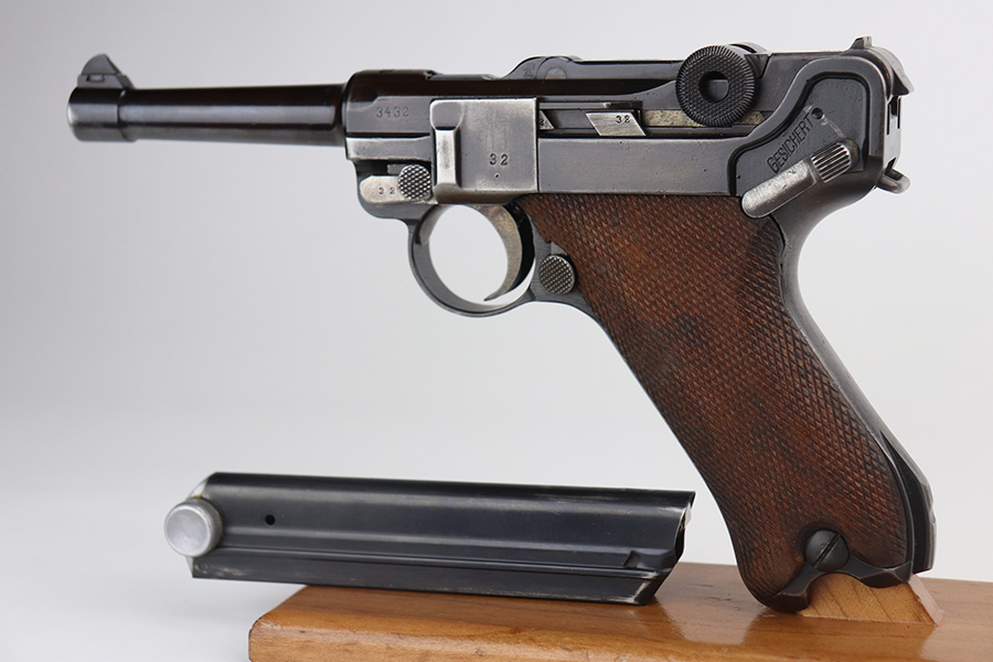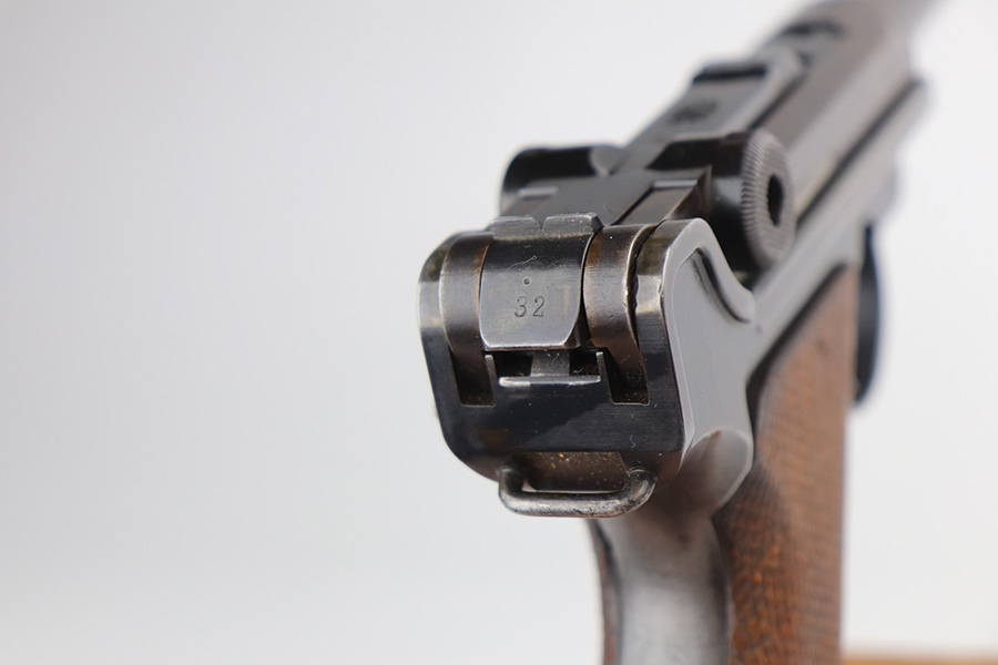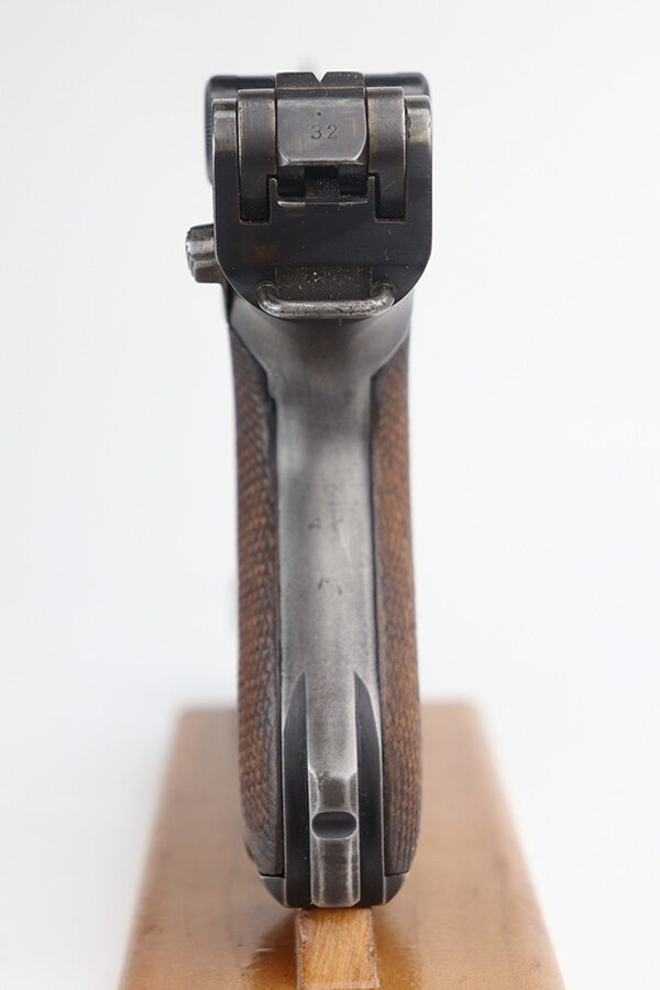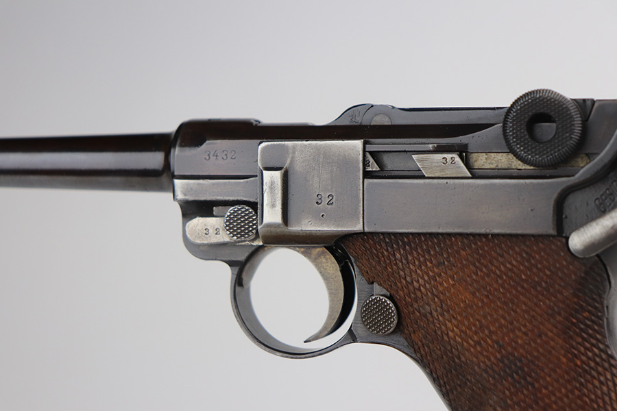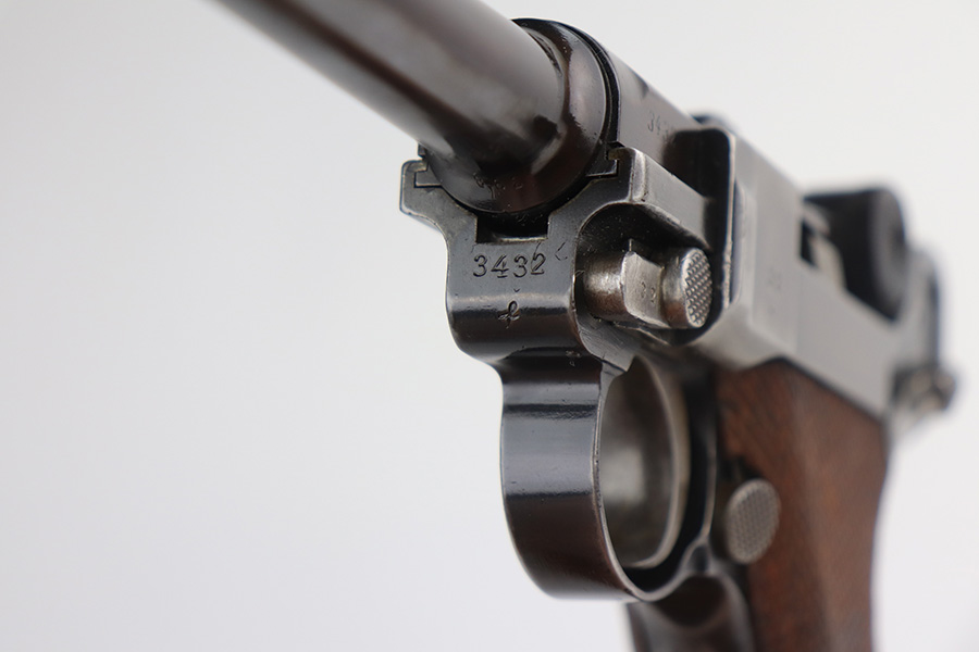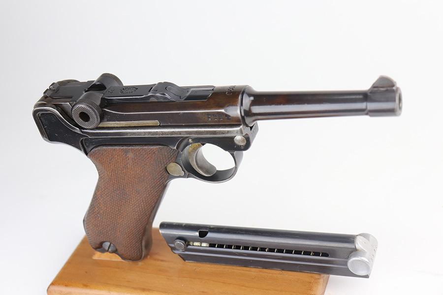 6/18/21 – This is a nice example of a DWM Luger issued to the Imperial German military in 1918. It is matching and has the proper Imperial military proofs. It was reworked in the 1920’s, as evidenced by the “1920” rework stamp on the chamber. It comes with a WW2-era matching magazine, so it was likely issued to the Nazi police force during WW2. The magazine was likely numbered at the police arsenal. It has retained roughly 65% of its finish. Most of the wear is on the straps, but there is wear on the side plate, side rails, and around the muzzle. Areas of thinning and patina on the left side of the frame and around the chamber. Comes with excellent period-correct grips that are mismatched. The bore has pretty good rifling with minor pin-pricking throughout.