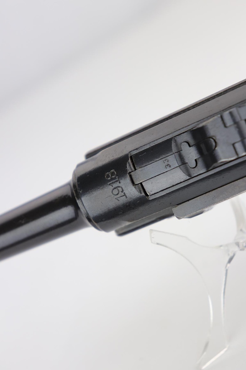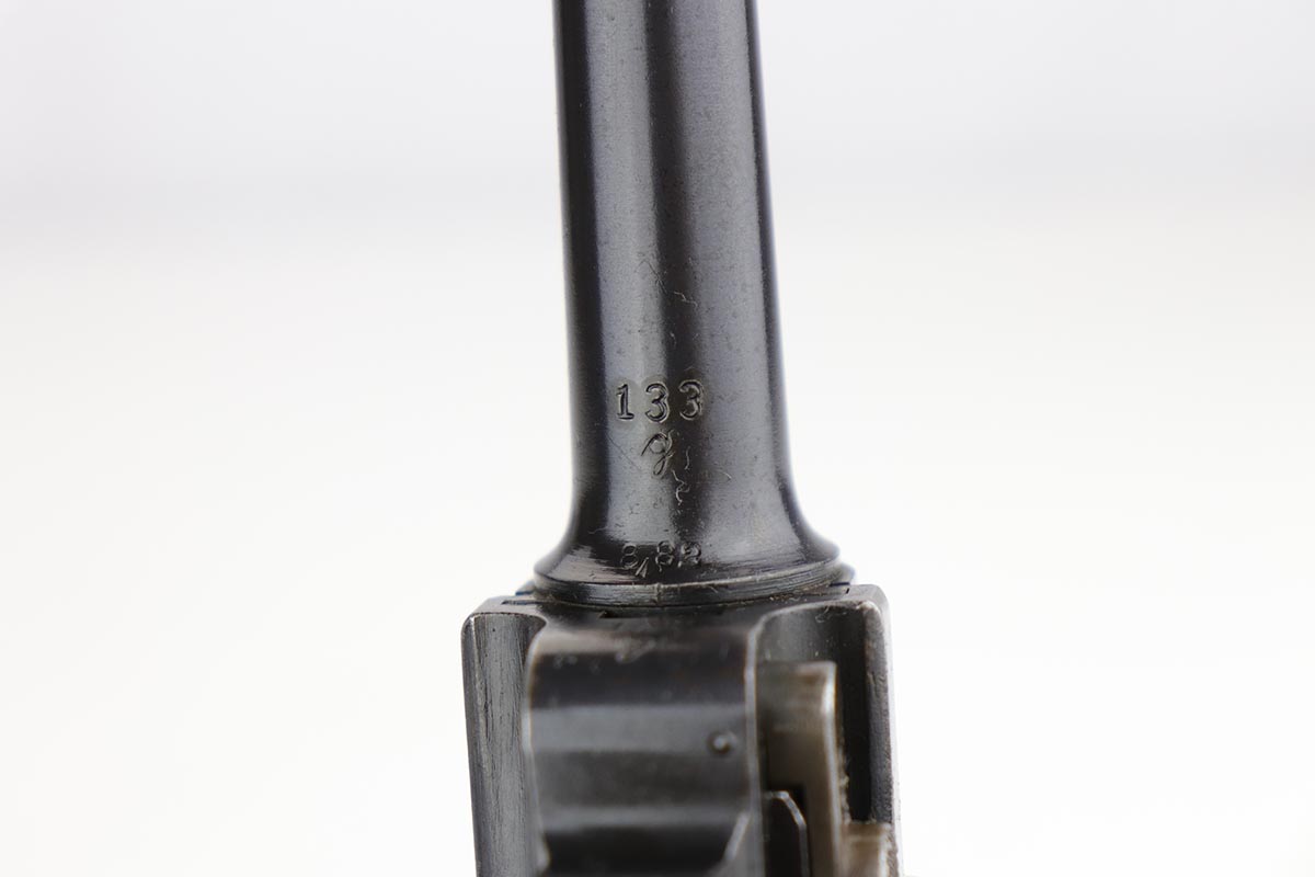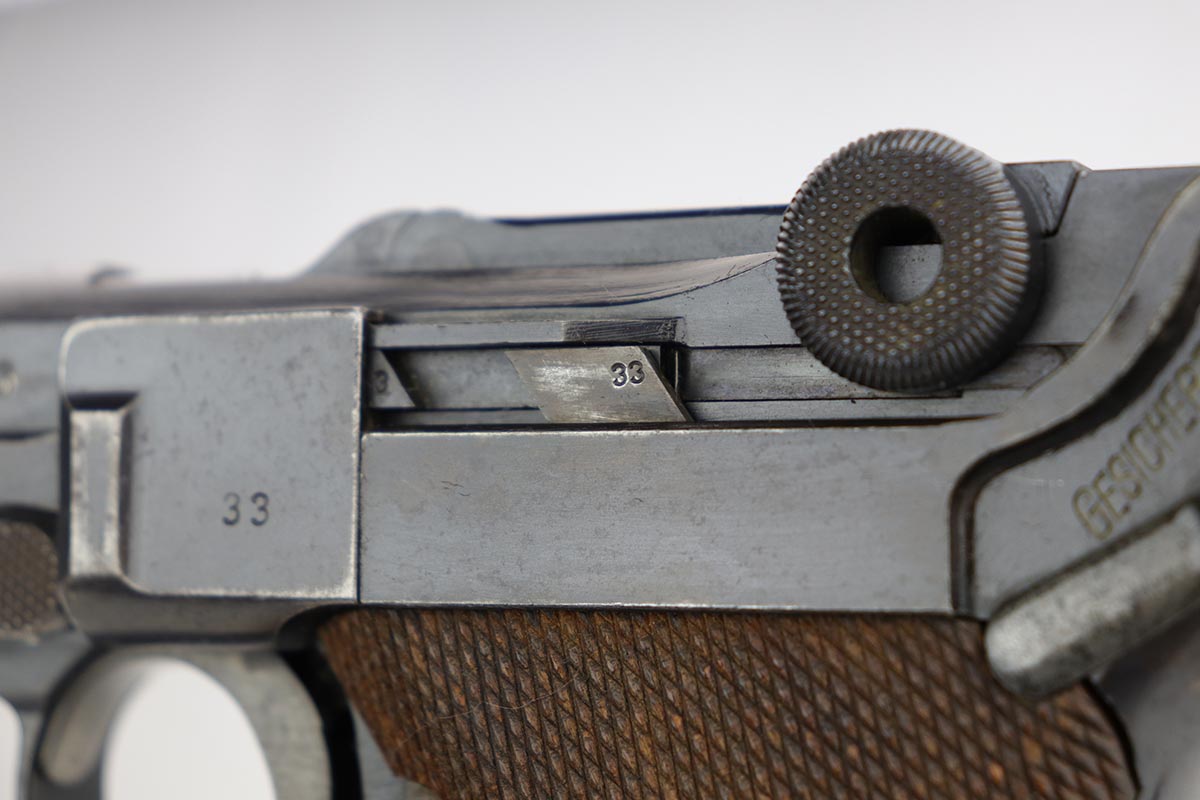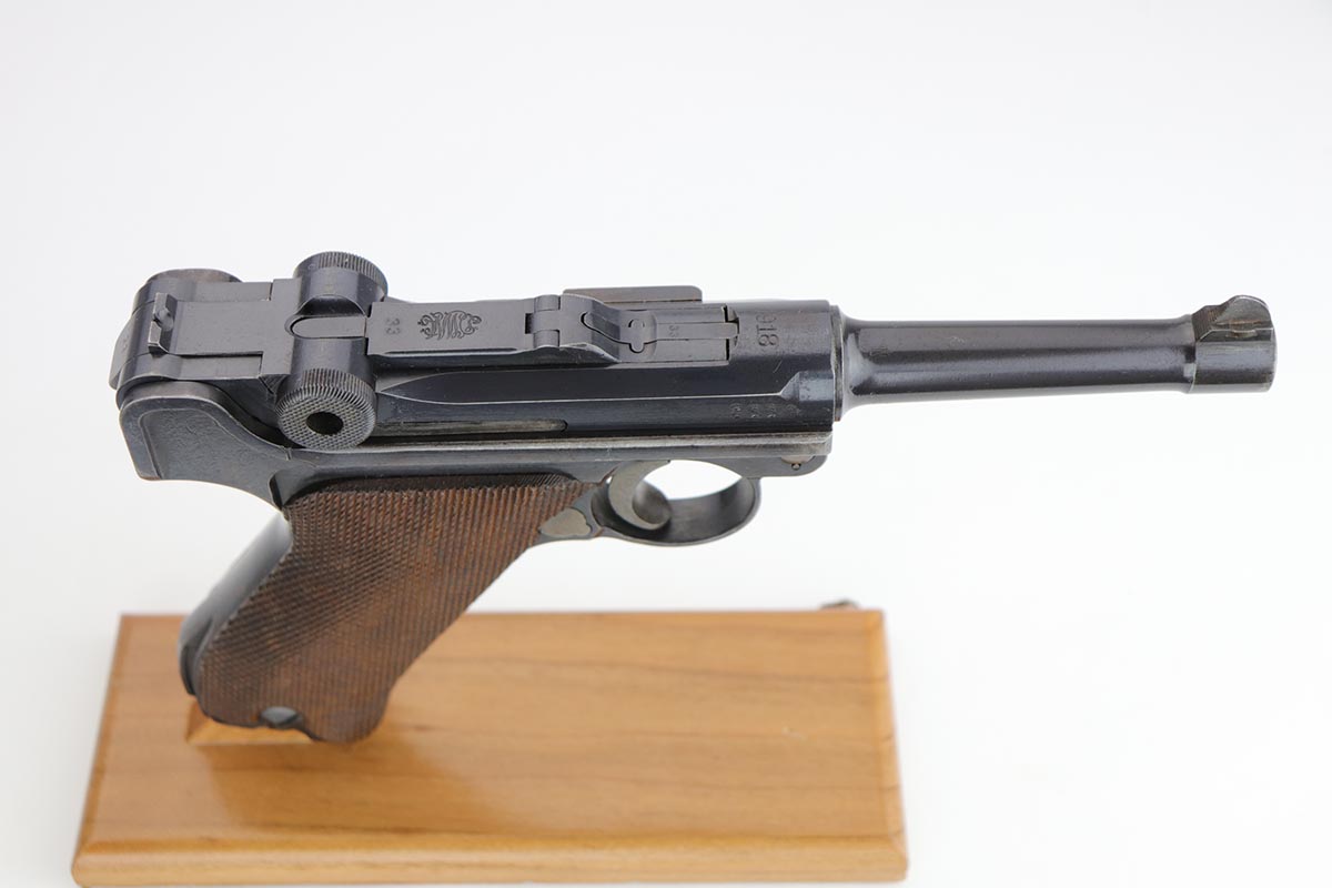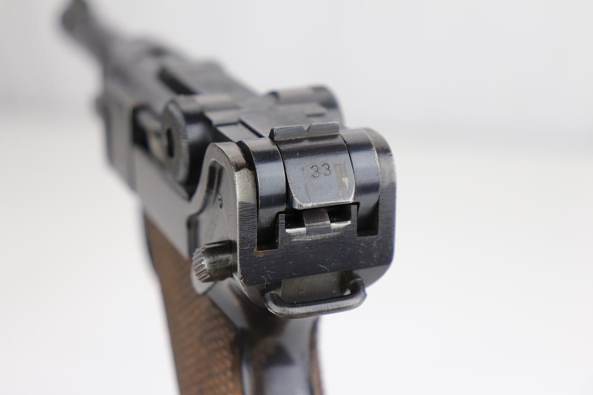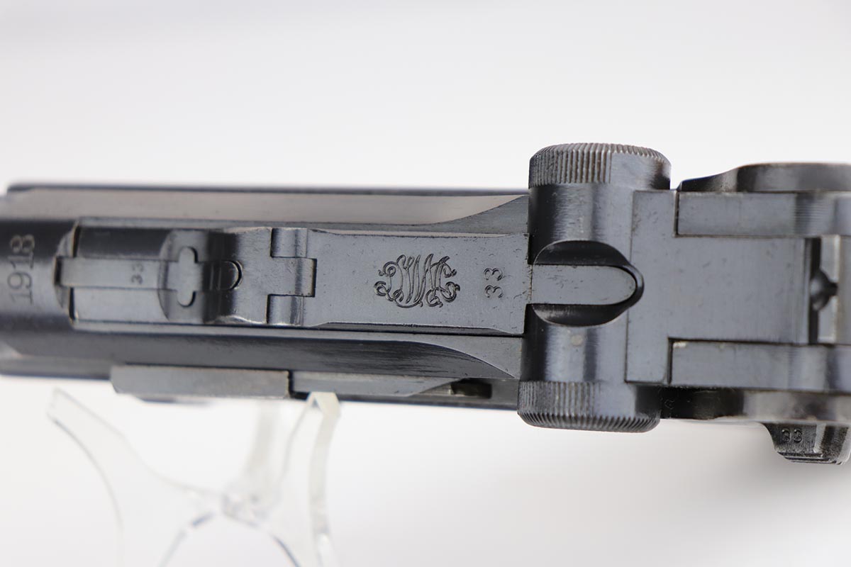 12/19/19 – This is an all matching and original DWM military Luger from 1918. The pistol has about 90% of the original blue remaining, with the vast majority of finish loss on the front strap. Beautiful profile view. Bore is shiny with strong rifling, and only minor signs of use. The grips are mismatched replacements. Magazine is period original but also mismatched.