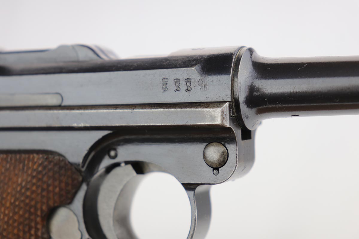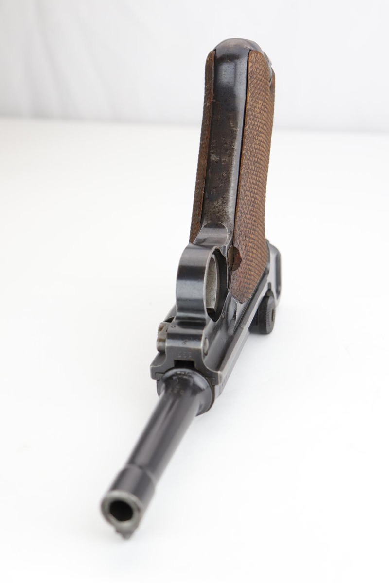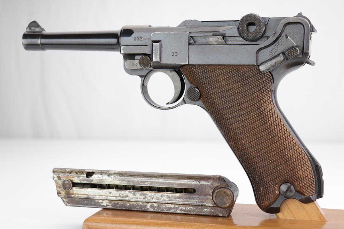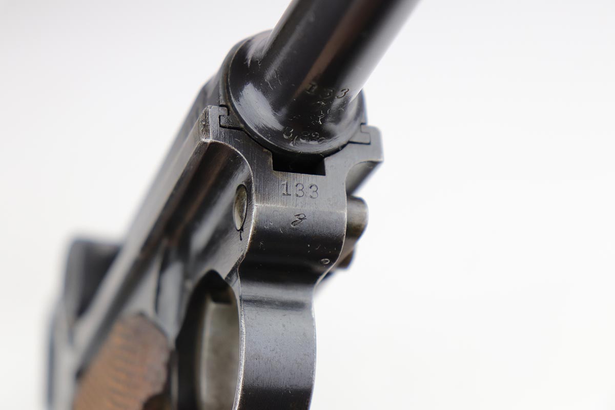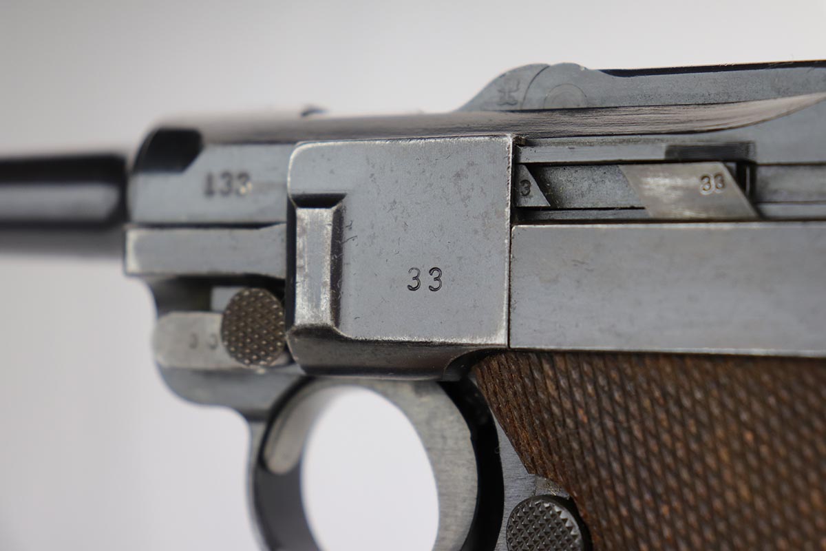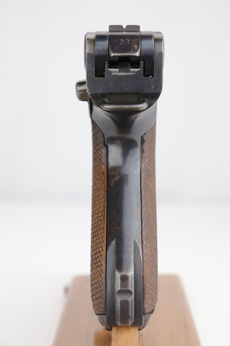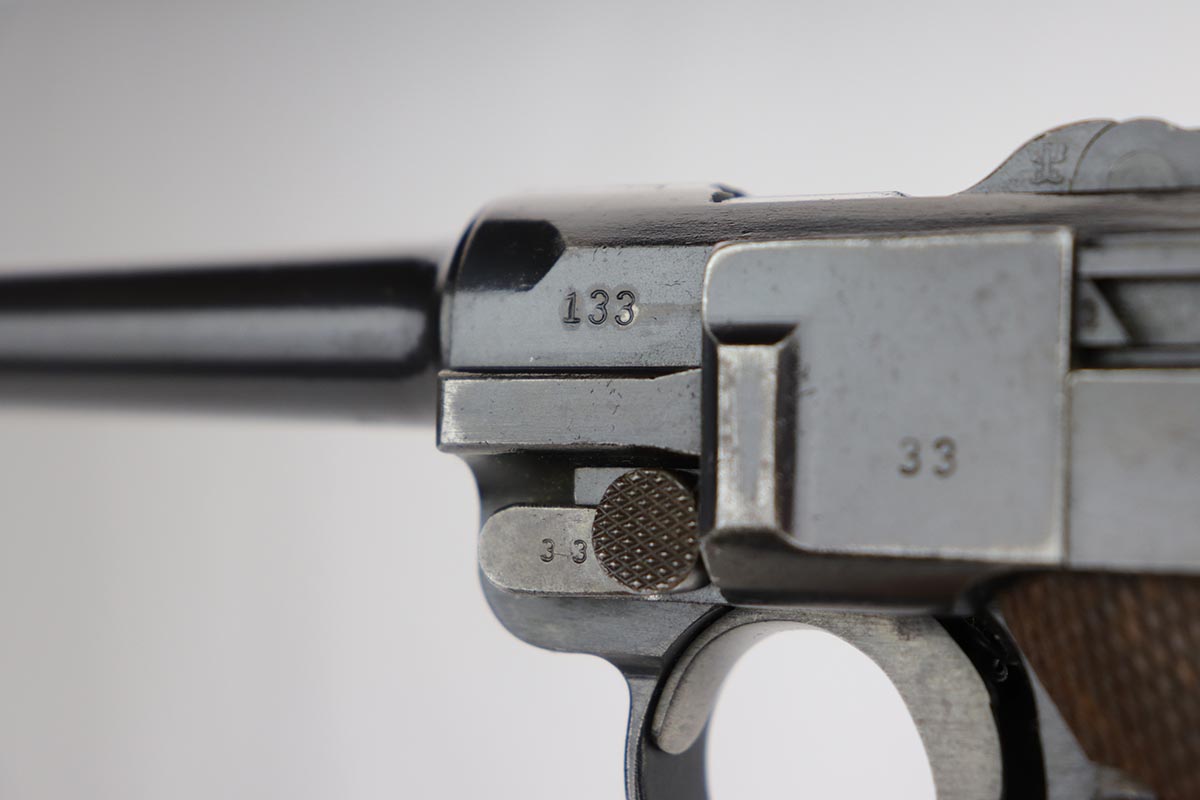 12/19/19 – This is an all matching and original DWM military Luger from 1918. The pistol has about 90% of the original blue remaining, with the vast majority of finish loss on the front strap. Beautiful profile view. Bore is shiny with strong rifling, and only minor signs of use. The grips are mismatched replacements. Magazine is period original but also mismatched.