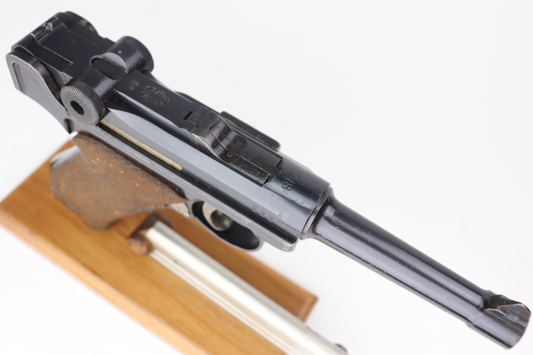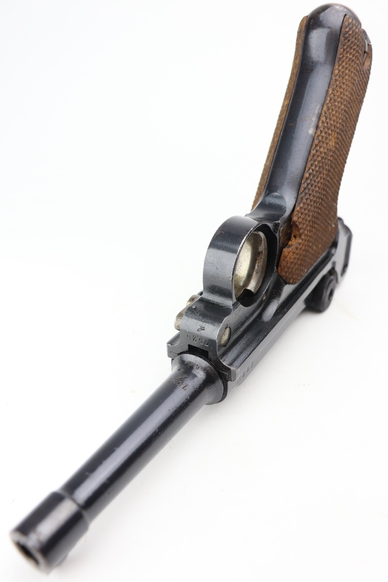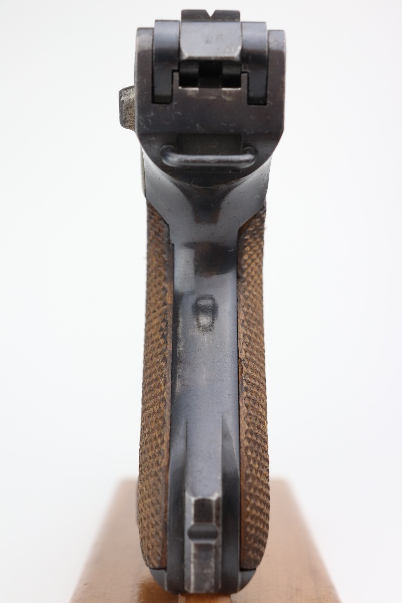 2/25/21 – This is a nice example of a DWM Luger issued to the Imperial German army in 1918. It is all matching and has the proper Imperial proofs. It has retained about 90-92% of its original finish. There is some spotty wear on the straps and the side plate. Spotty discoloration on the front edges of the frame. Spotty oxidation on the straps, side plate, and barrel. Comes with excellent grips and a mismatched WW1-era magazine. Very nice bore – shiny with strong rifling.