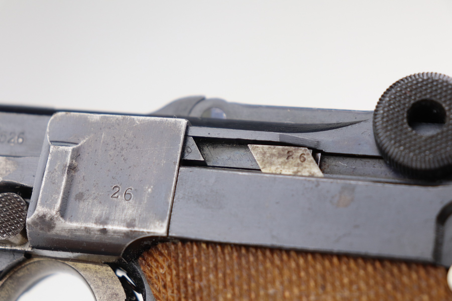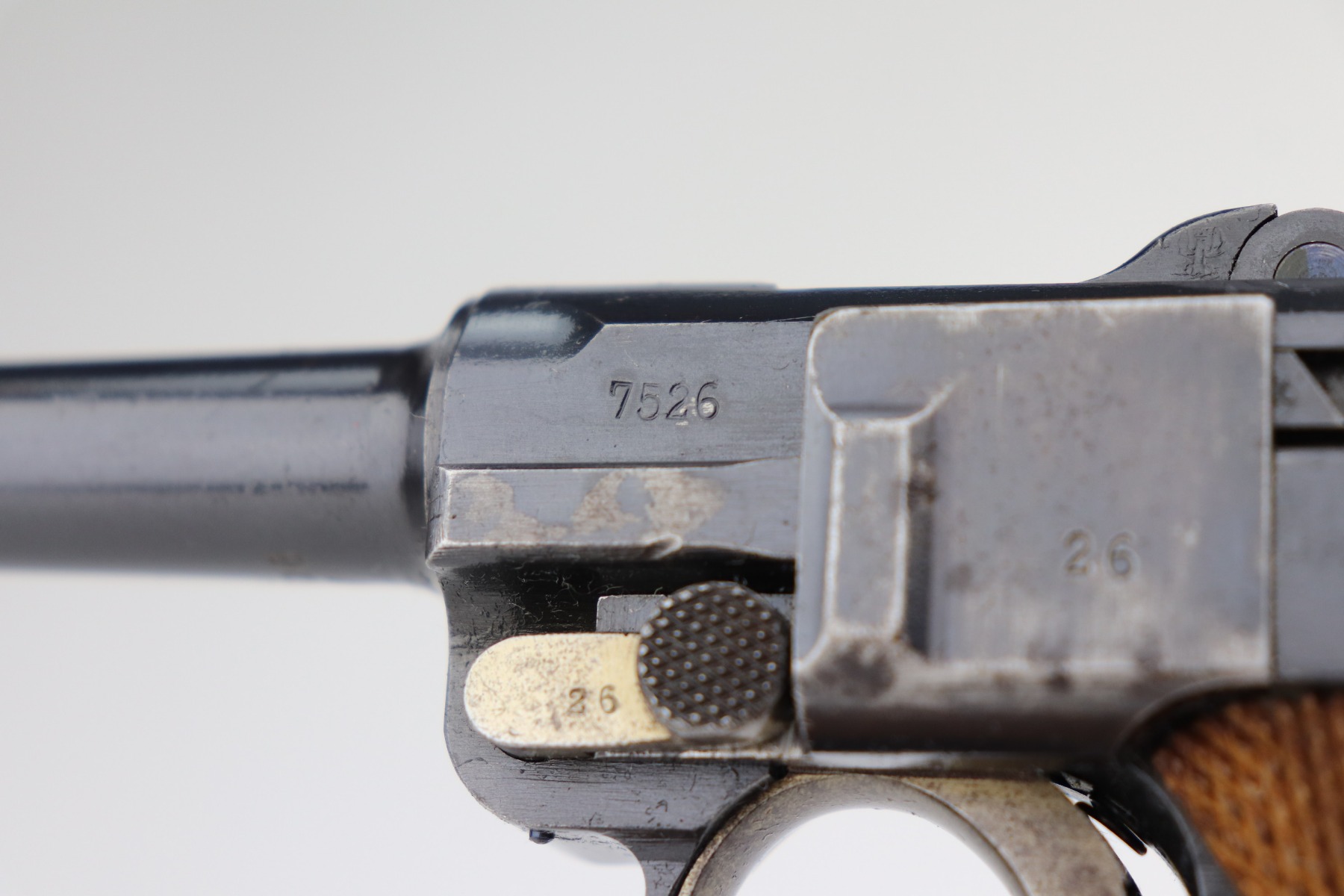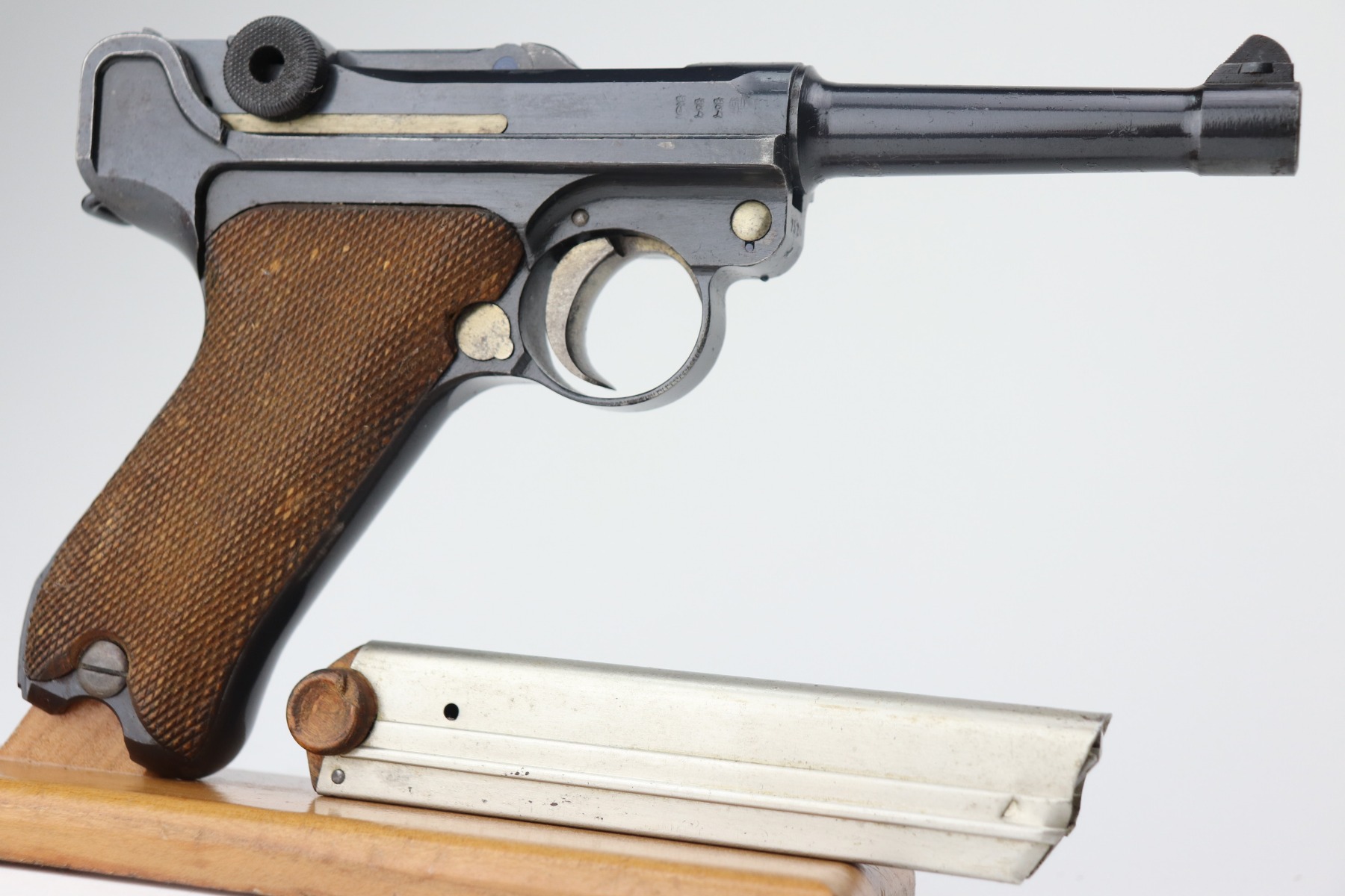 2/25/21 – This is a nice example of a DWM Luger issued to the Imperial German army in 1918. It is all matching and has the proper Imperial proofs. It has retained about 90-92% of its original finish. There is some spotty wear on the straps and the side plate. Spotty discoloration on the front edges of the frame. Spotty oxidation on the straps, side plate, and barrel. Comes with excellent grips and a mismatched WW1-era magazine. Very nice bore – shiny with strong rifling.