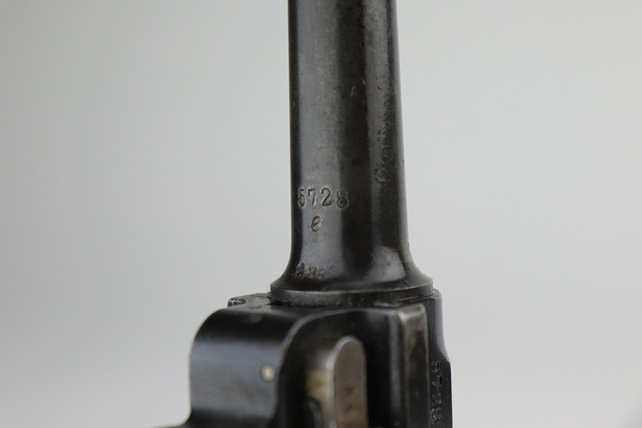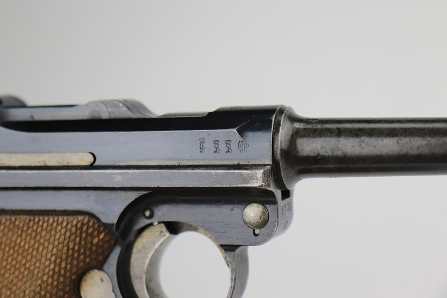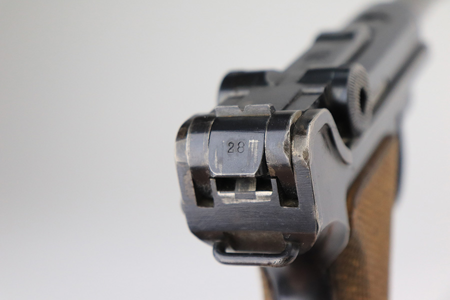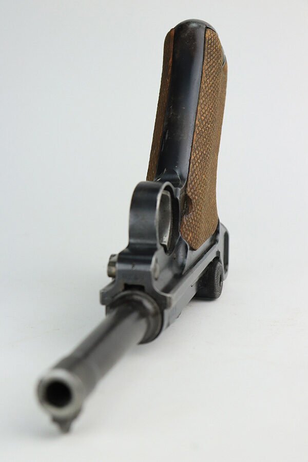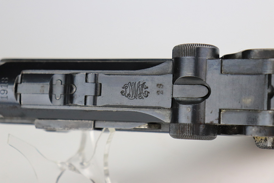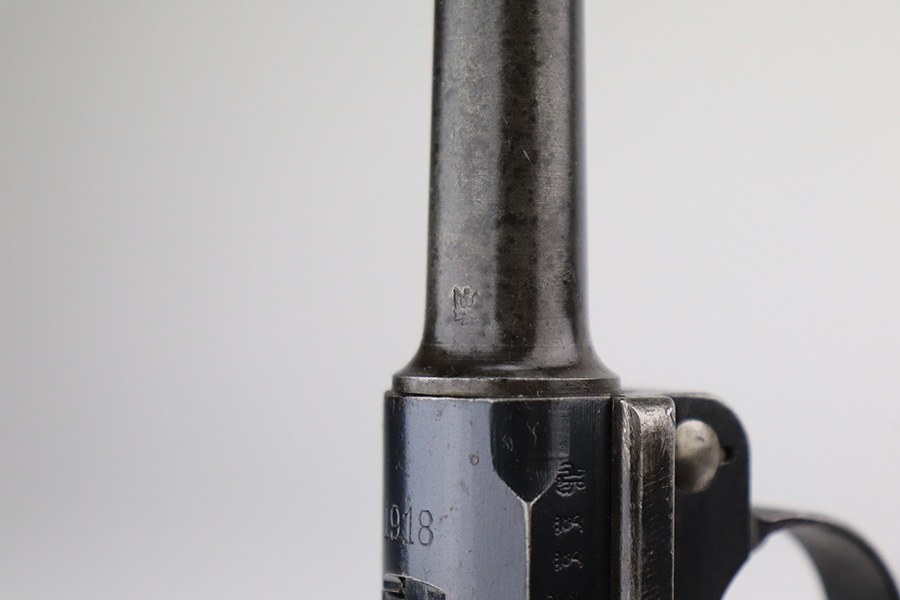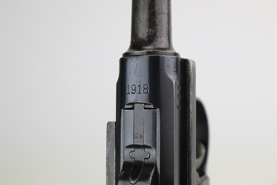 6/4/21 – This is a nice example of a DWM Luger issued to the Imperial German Army in 1918. It is all matching and has the proper Imperial proofs. It has retained roughly 65-70% of its original bluing. There is spotty, scratchy wear on the side plate, side rails, left side of the frame, and on the straps. Thinning on the whole barrel. Noticeable spotty oxidation on the barrel and side plate. Excellent matching grips – small chip in the top left corner of the left panel. Also comes with a mismatched period-correct magazine – a few chips in the wood bottom. Mint bore. This would make a great shooter.