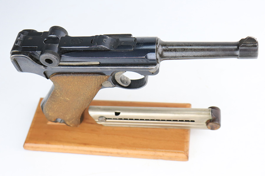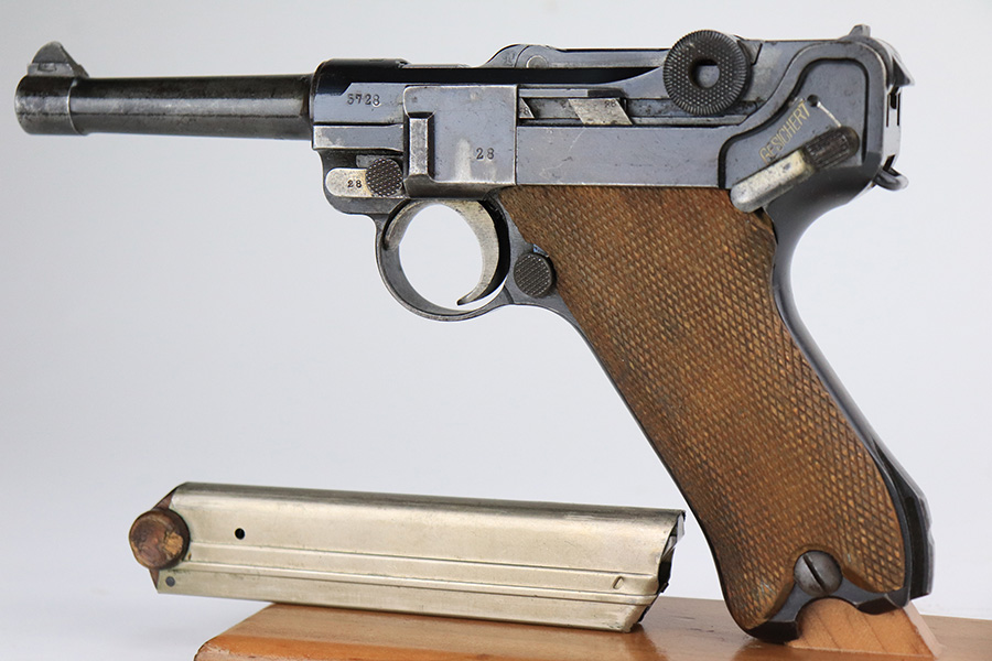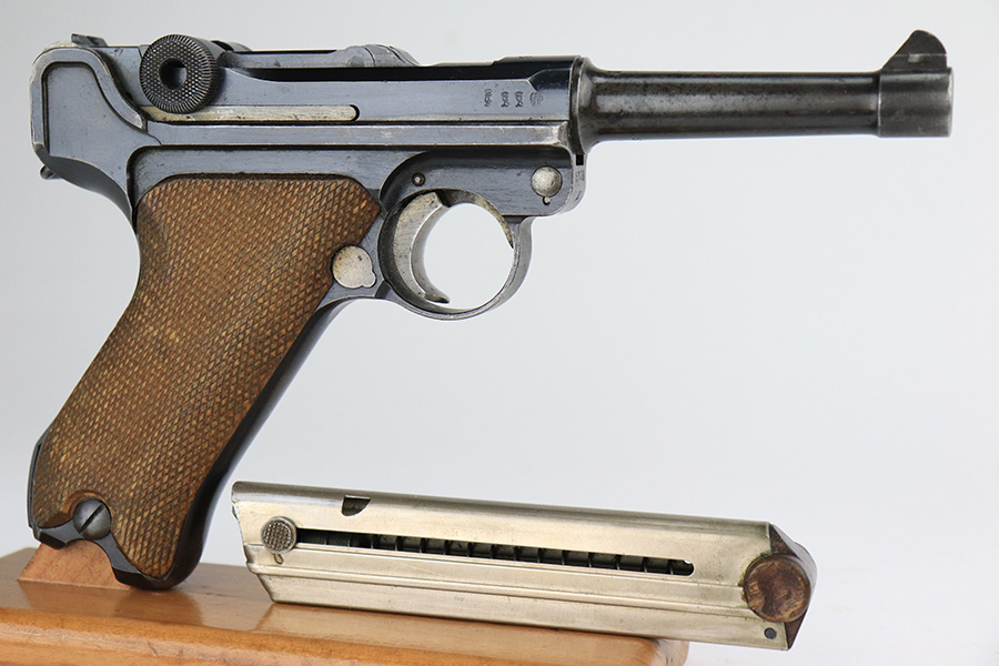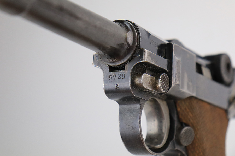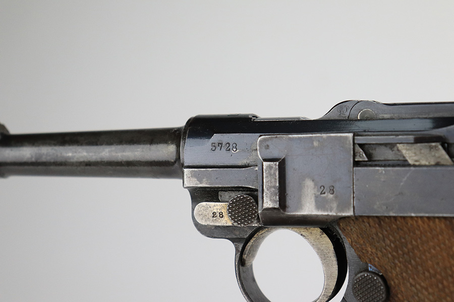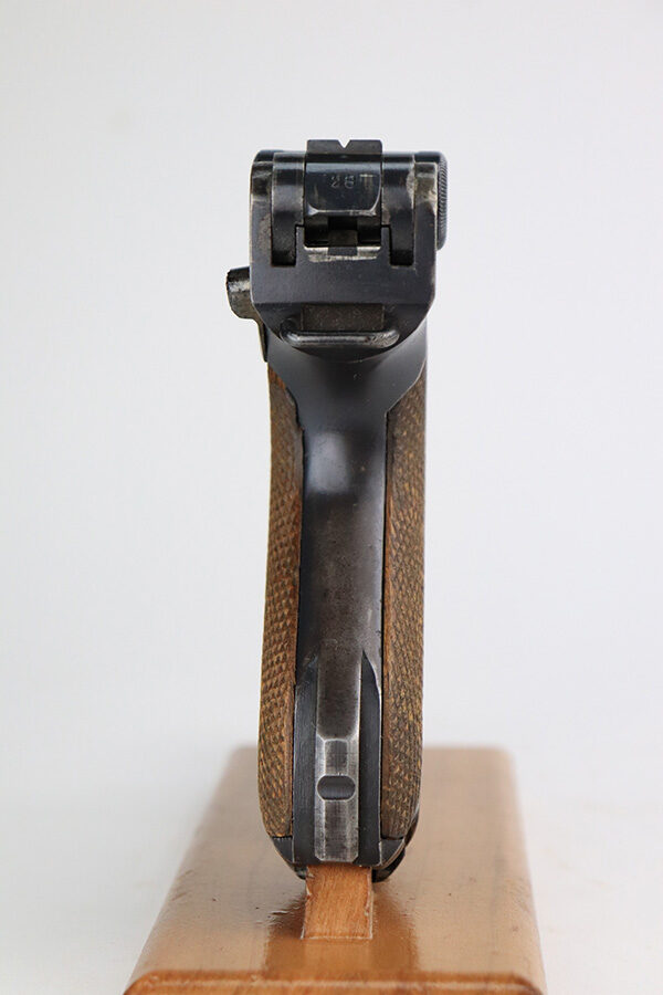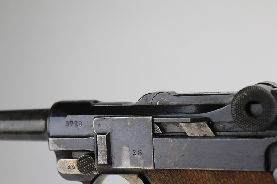6/4/21 – This is a nice example of a DWM Luger issued to the Imperial German Army in 1918. It is all matching and has the proper Imperial proofs. It has retained roughly 65-70% of its original bluing. There is spotty, scratchy wear on the side plate, side rails, left side of the frame, and on the straps. Thinning on the whole barrel. Noticeable spotty oxidation on the barrel and side plate. Excellent matching grips – small chip in the top left corner of the left panel. Also comes with a mismatched period-correct magazine – a few chips in the wood bottom. Mint bore. This would make a great shooter.