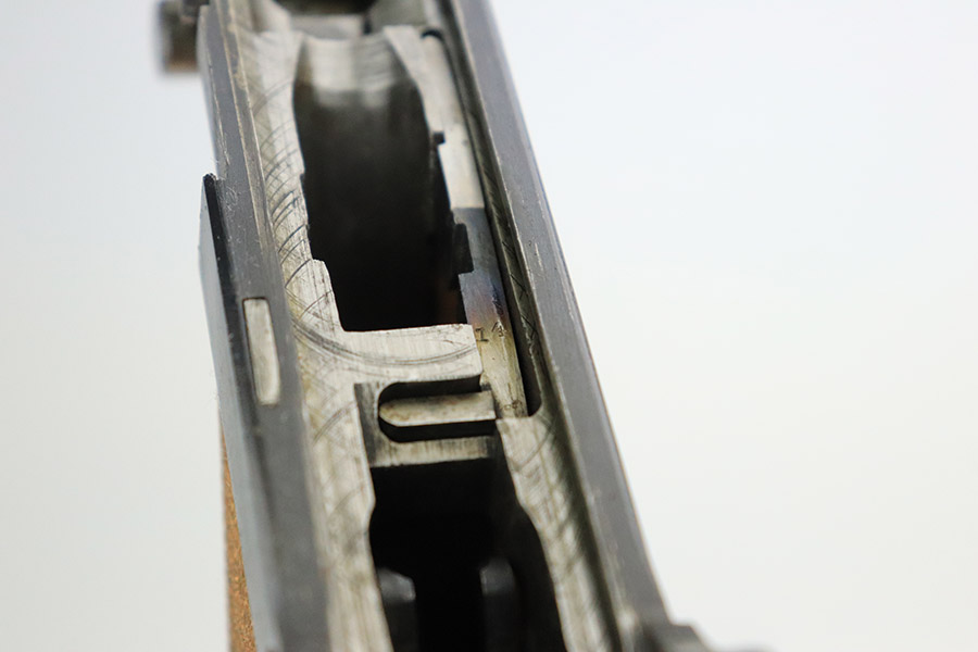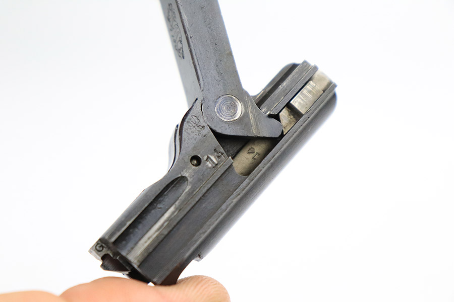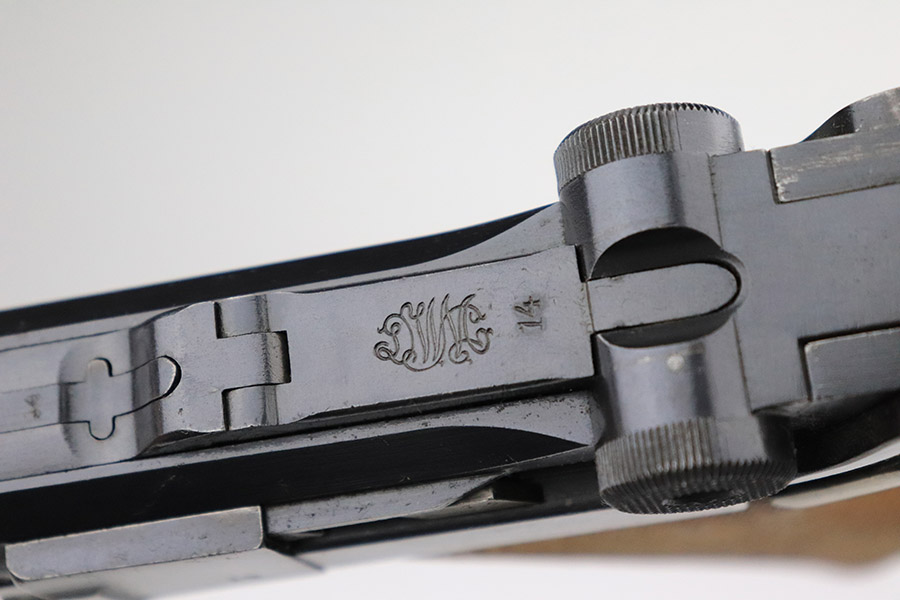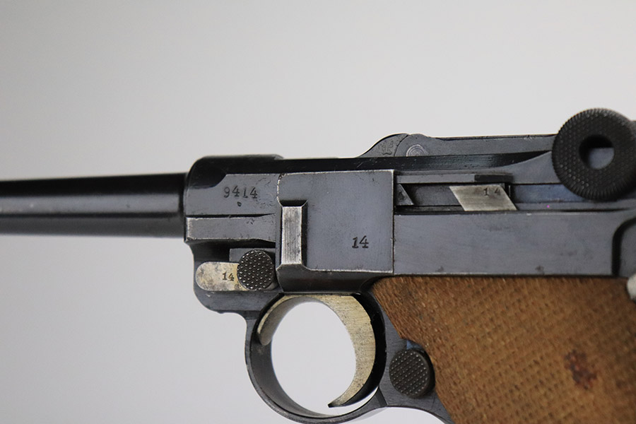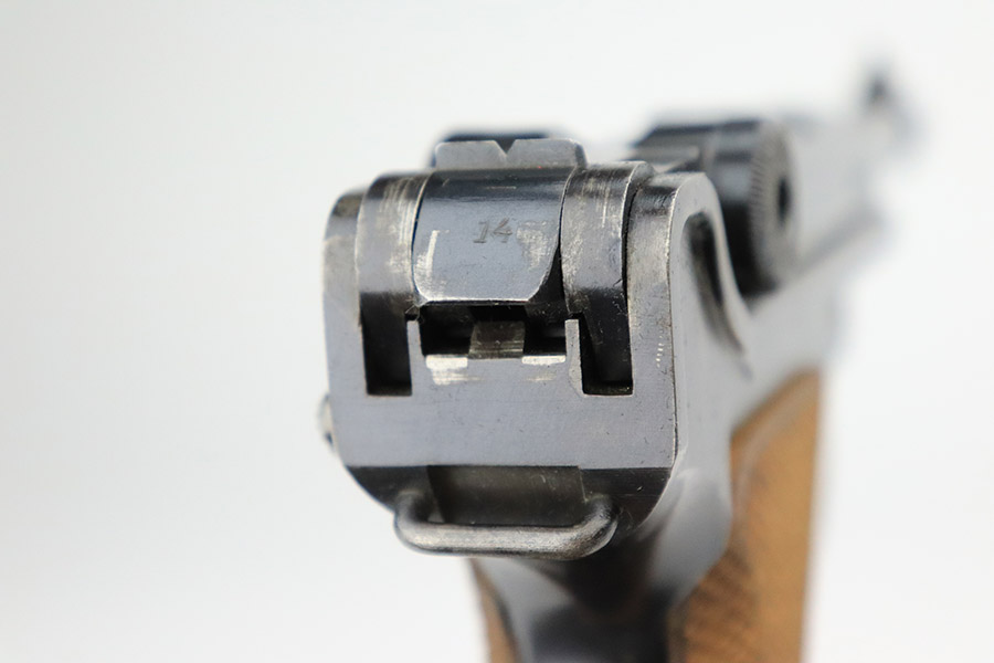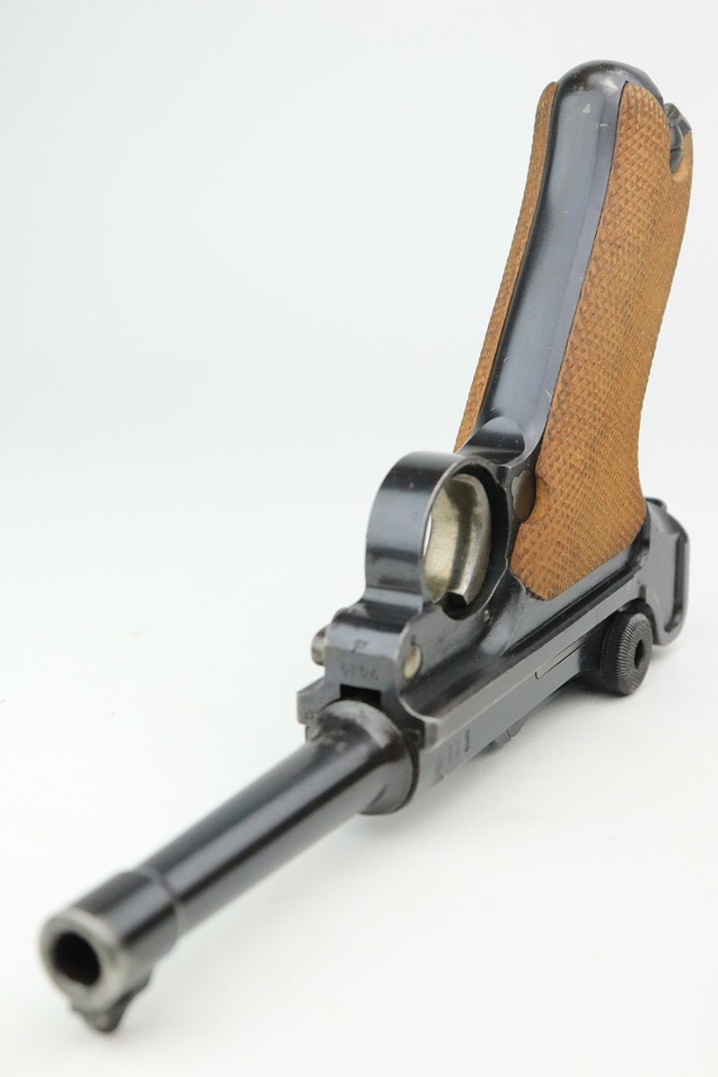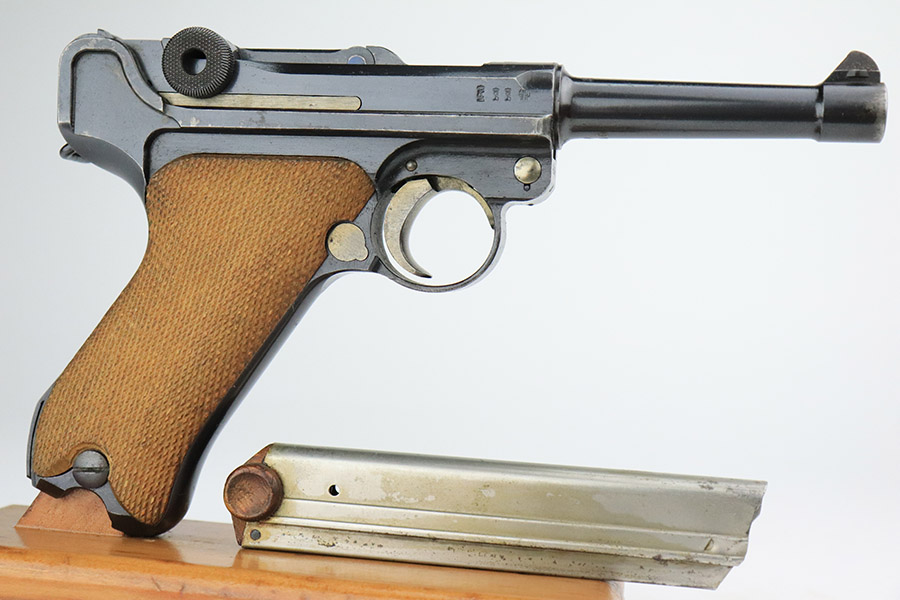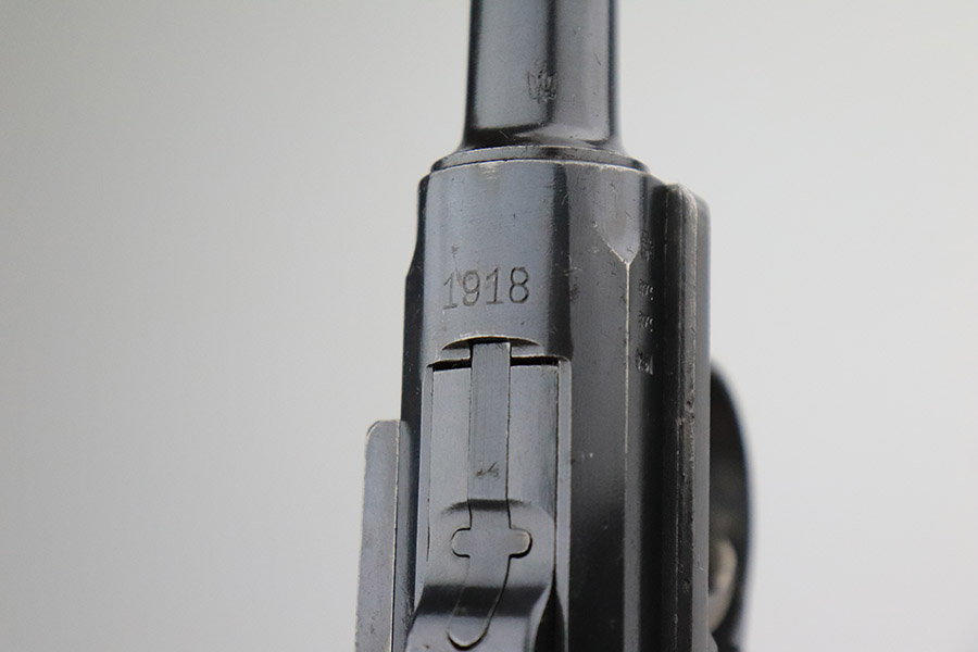 3/15/23 – This is an excellent example of a DWM Luger issued to the Imperial German military in 1918. The gun is all matching and has the proper Imperial proofs. It has retained about 96% of its original finish. There are areas of very minor wear on the side plate, side rails, around the muzzle, and on the left side of the barrel. A few small spots of wear on the front strap. Some tiny dots of oxidation sporadically here and there. Comes with excellent blonde wood grips and a period-correct but mismatched magazine. The bore has good rifling, but there are tiny pits and roughness throughout the bore interior.