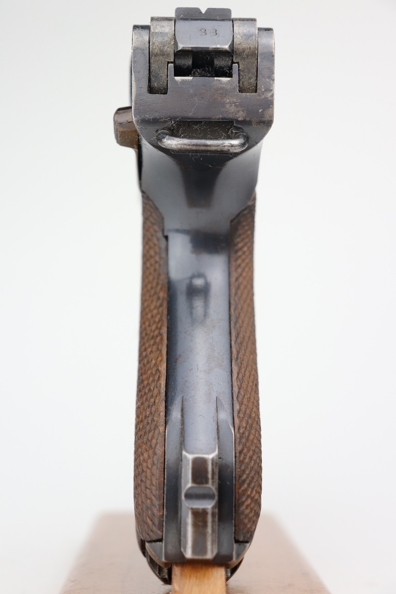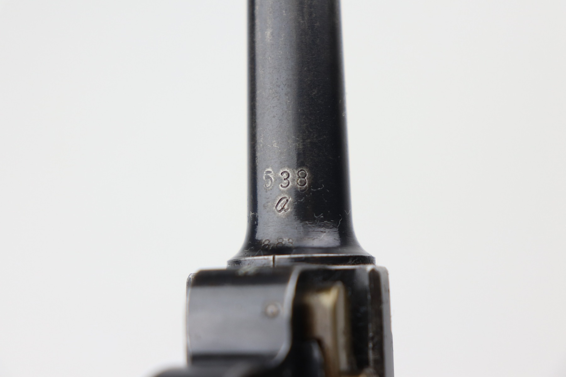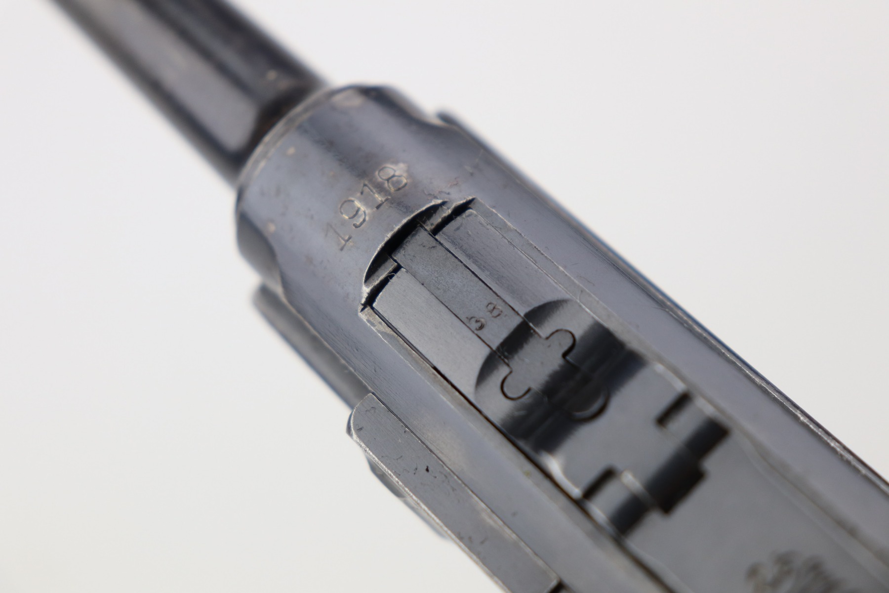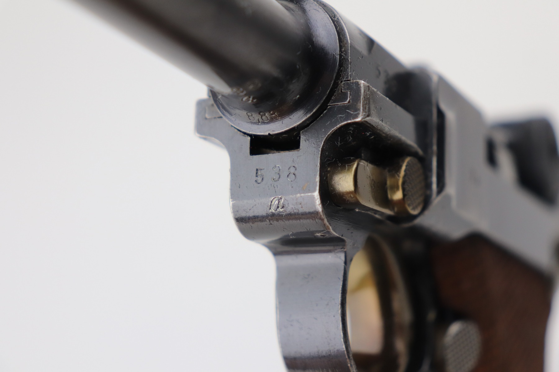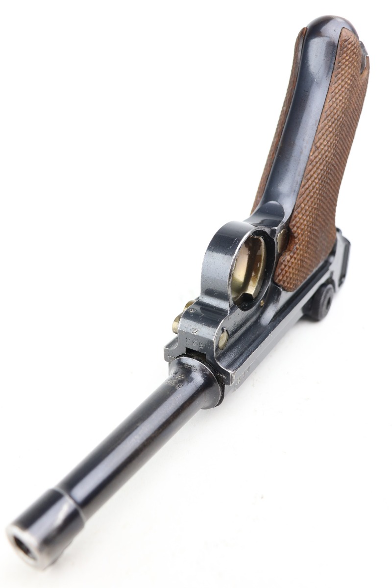 3/4/21 – This is a very nice example of a DWM Luger issued to the Imperial German army in 1918. It is all matching and has the proper Imperial proofs. This one also comes with one original matching magazine. The gun has retained about 94% of its original bluing. There are areas of minor wear around the side plate, muzzle, high edges of the frame, and on the left side of the barrel. Minor pin-pricking on the straps. Comes with excellent matching grips. The rifling in the bore is a bit worn, and there is minor pin-pricking throughout.