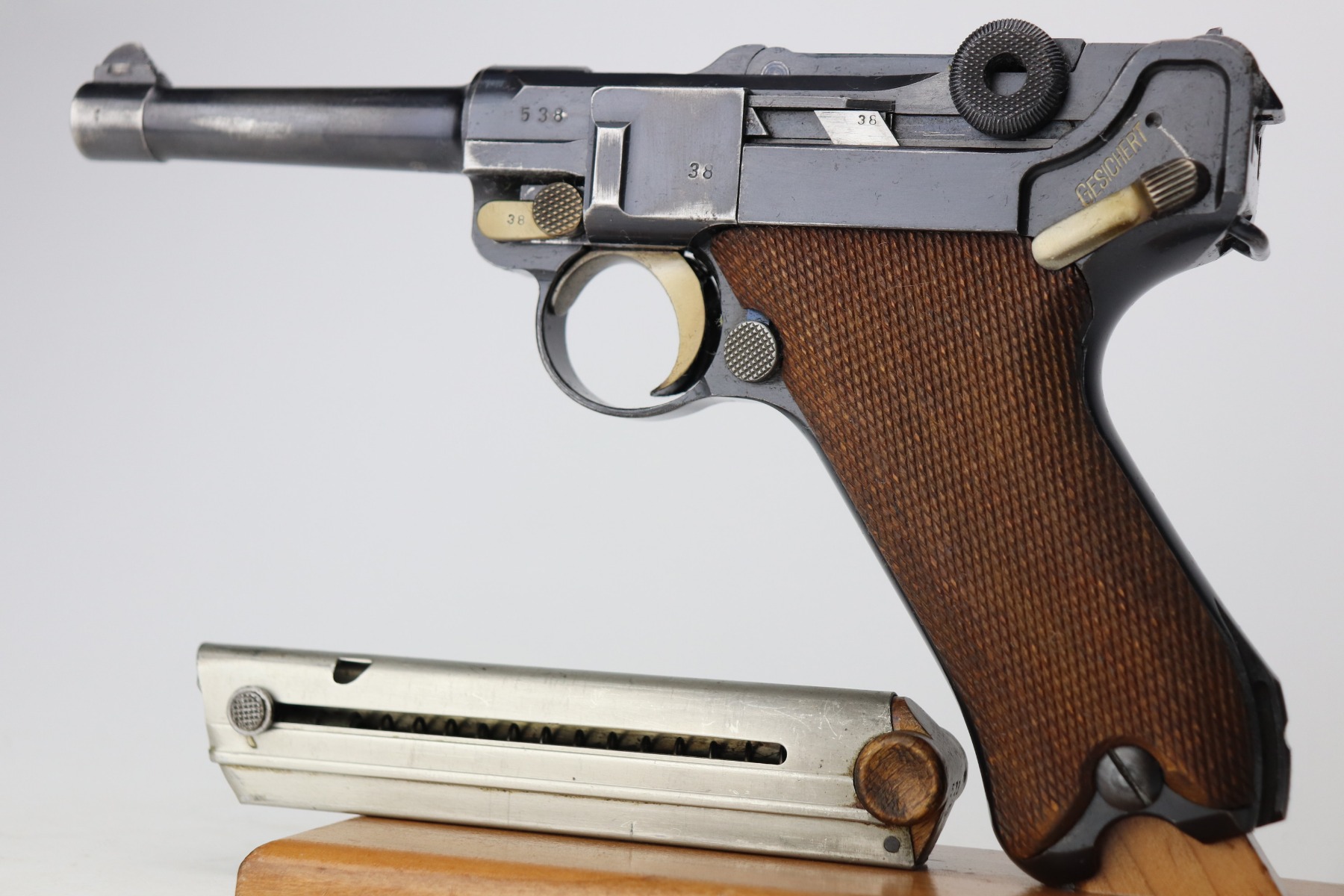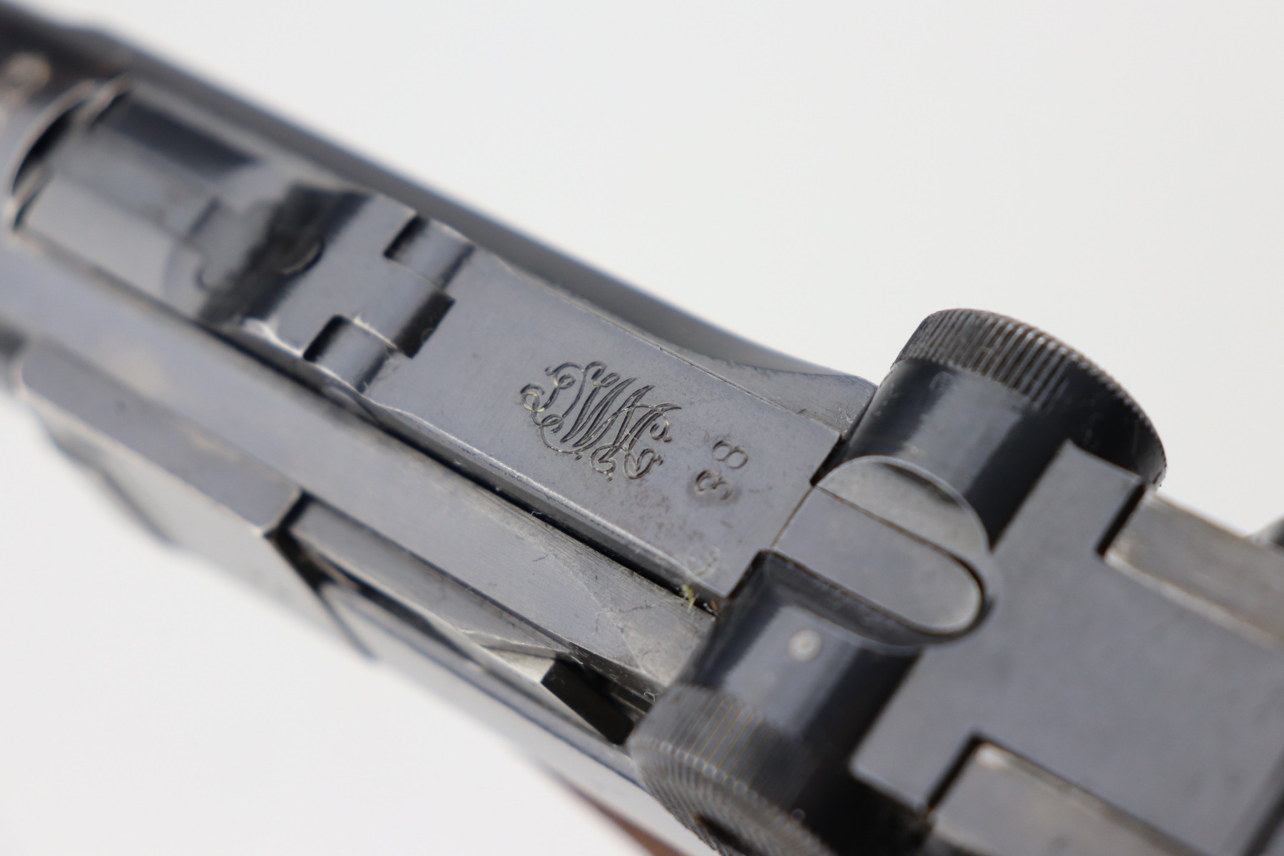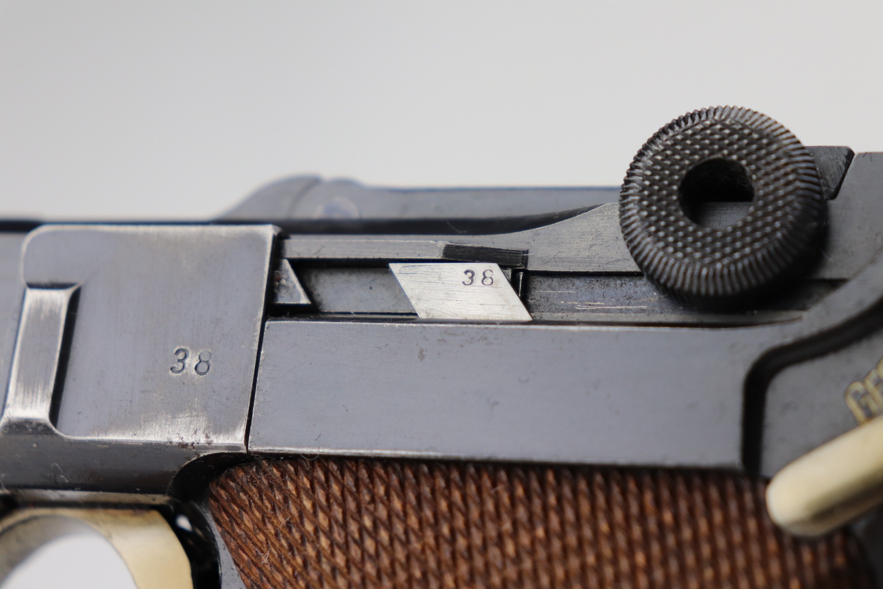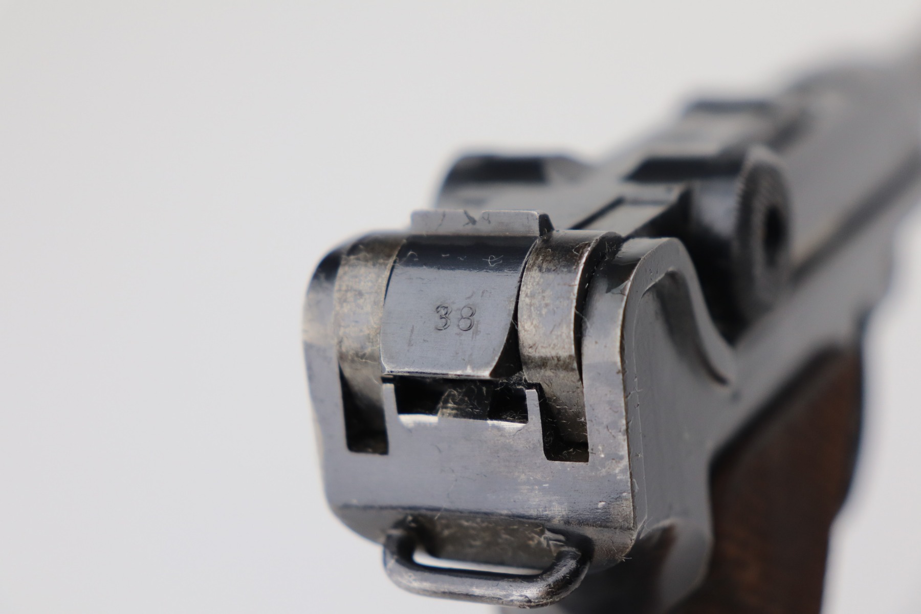3/4/21 – This is a very nice example of a DWM Luger issued to the Imperial German army in 1918. It is all matching and has the proper Imperial proofs. This one also comes with one original matching magazine. The gun has retained about 94% of its original bluing. There are areas of minor wear around the side plate, muzzle, high edges of the frame, and on the left side of the barrel. Minor pin-pricking on the straps. Comes with excellent matching grips. The rifling in the bore is a bit worn, and there is minor pin-pricking throughout.