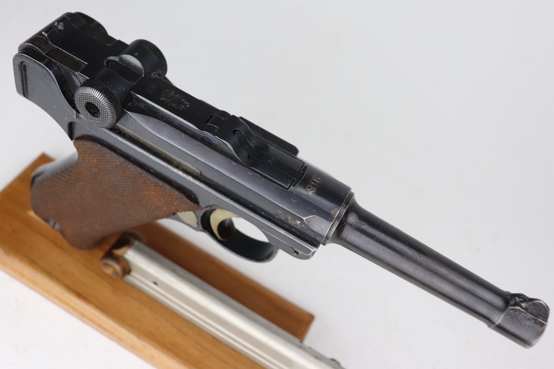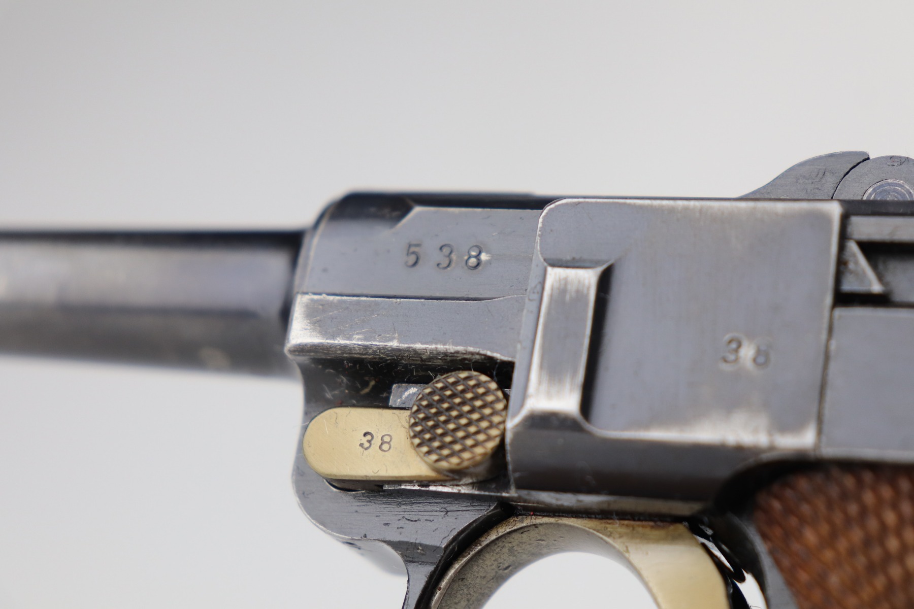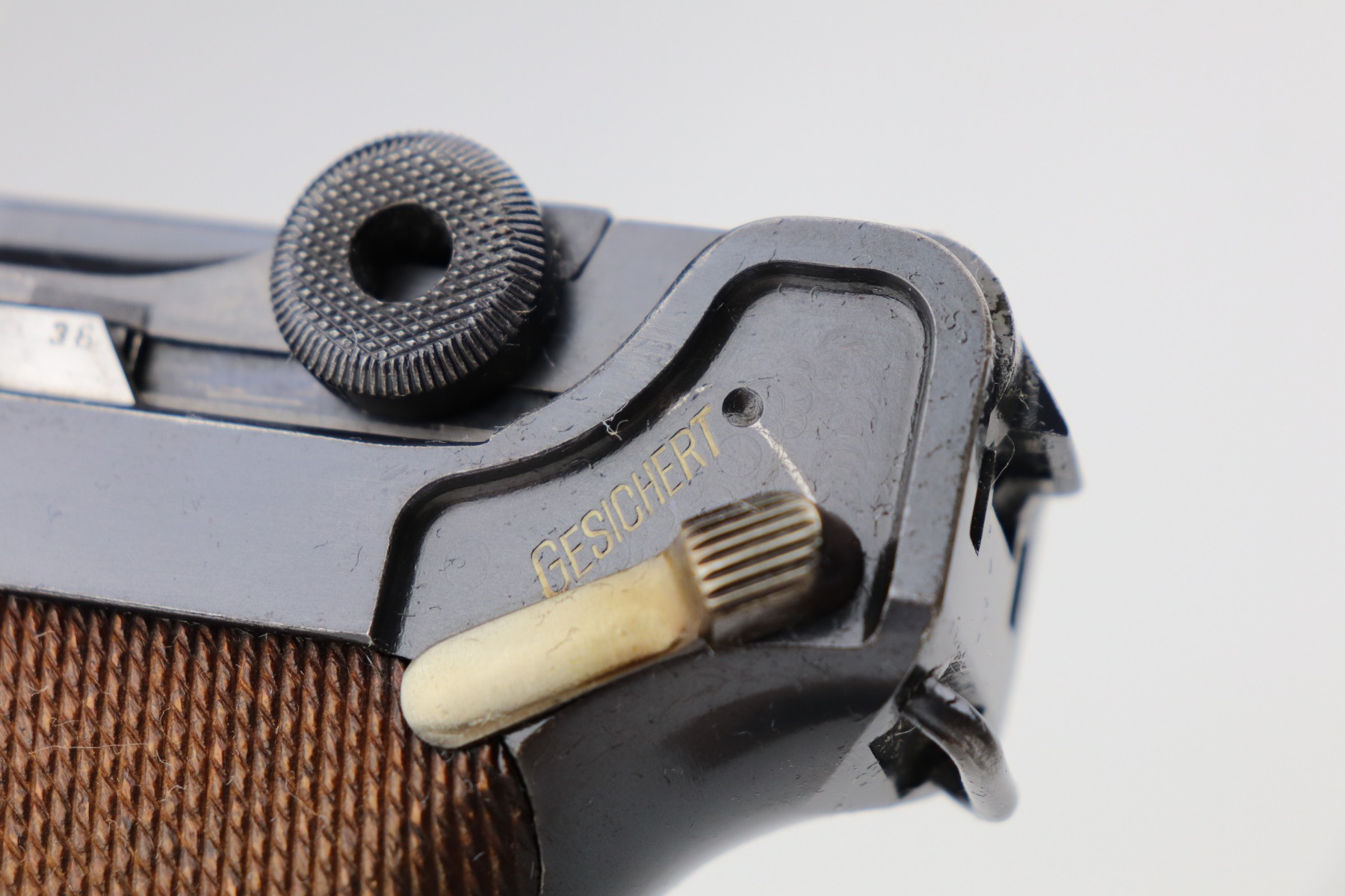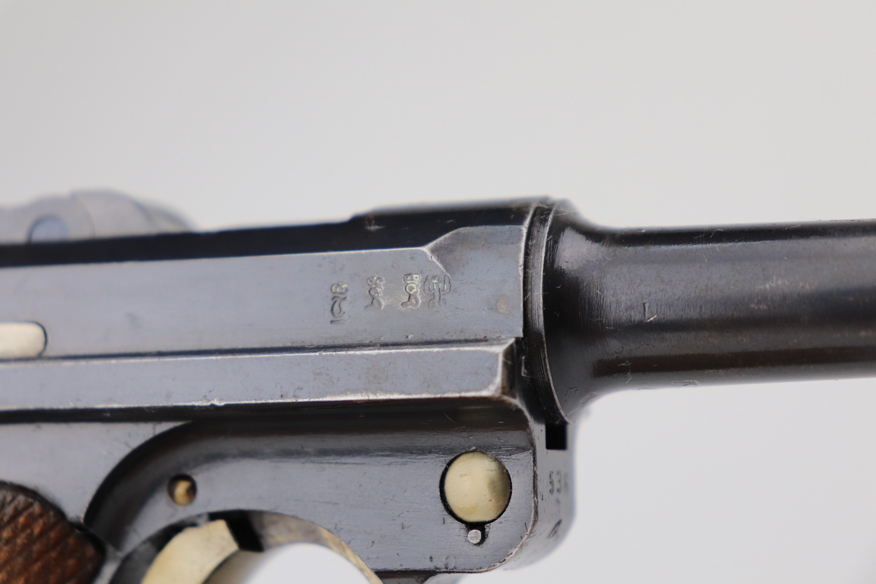 3/4/21 – This is a very nice example of a DWM Luger issued to the Imperial German army in 1918. It is all matching and has the proper Imperial proofs. This one also comes with one original matching magazine. The gun has retained about 94% of its original bluing. There are areas of minor wear around the side plate, muzzle, high edges of the frame, and on the left side of the barrel. Minor pin-pricking on the straps. Comes with excellent matching grips. The rifling in the bore is a bit worn, and there is minor pin-pricking throughout.