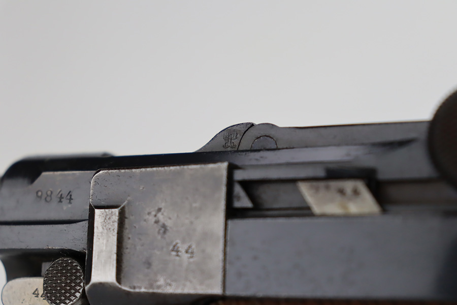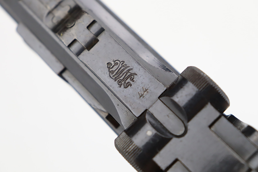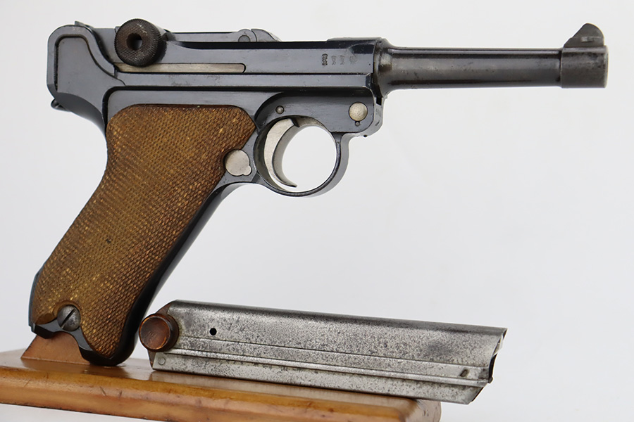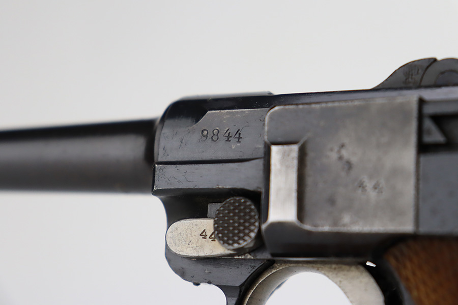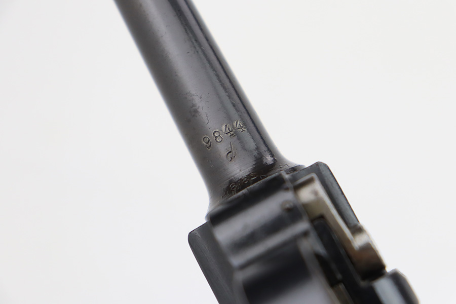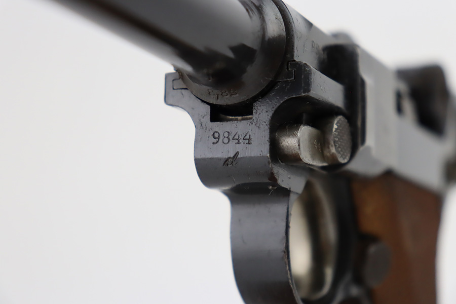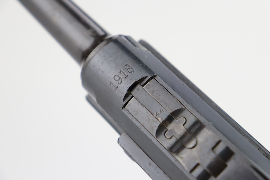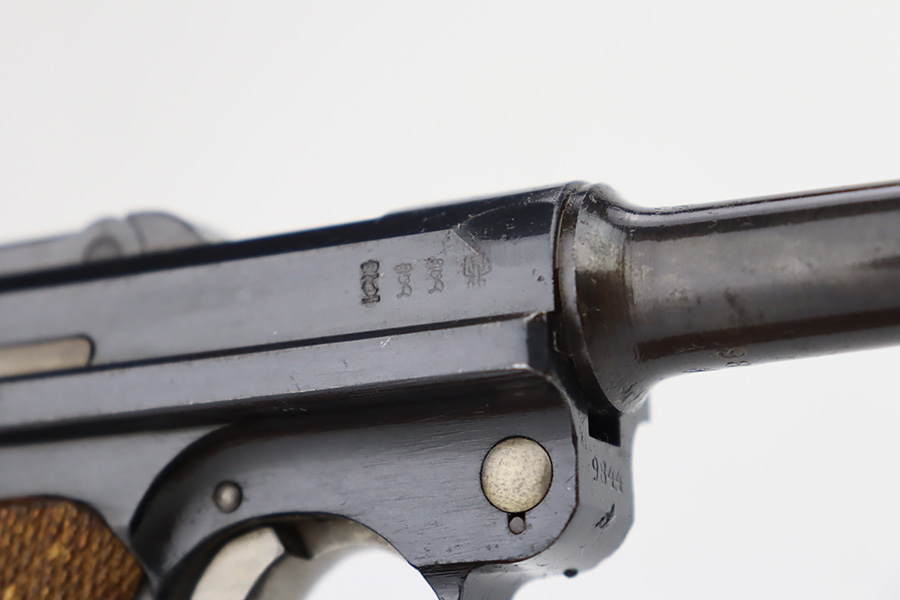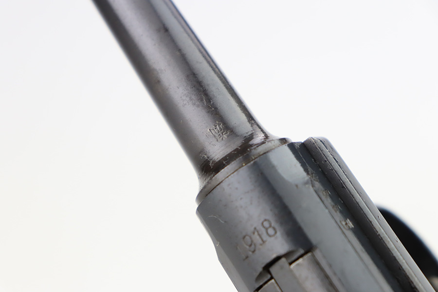9/26/23 – This is a very nice DWM Luger issued to the Imperial German military in 1918. All matching with the proper Imperial proofs. Comes with one matching-numbered magazine. The bluing rates about 93%. Most of the wear is on the side plate, but there is also minor muzzle wear and some minor thinning on the right side of the barrel. Areas of light spotty oxidation and pin-pricking here and there – most noticeable on the left side of the gun. Minty un-numbered wood grips. Very nice bore with strong rifling and hints of pin-pricking in the grooves.