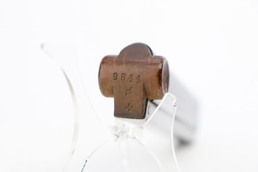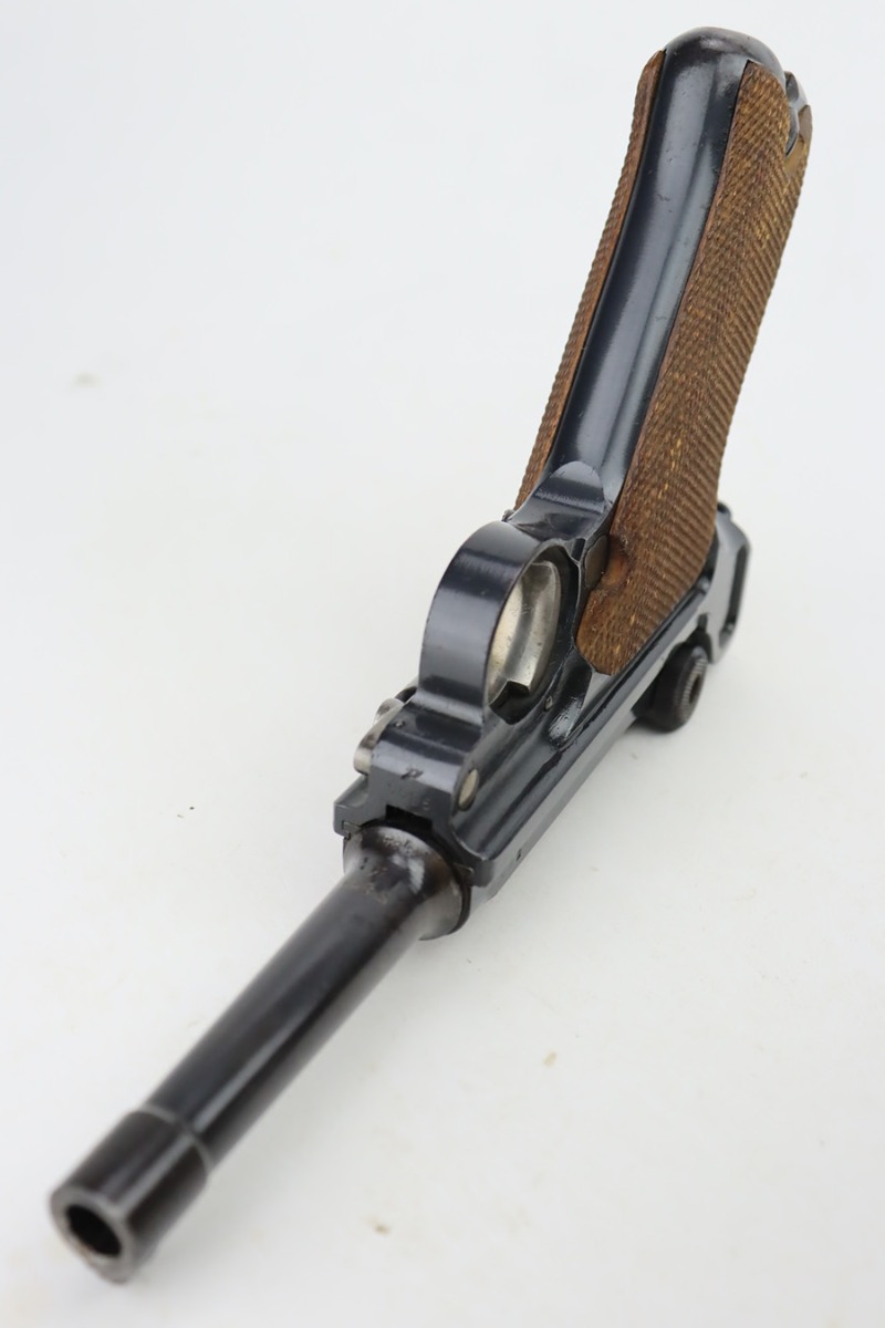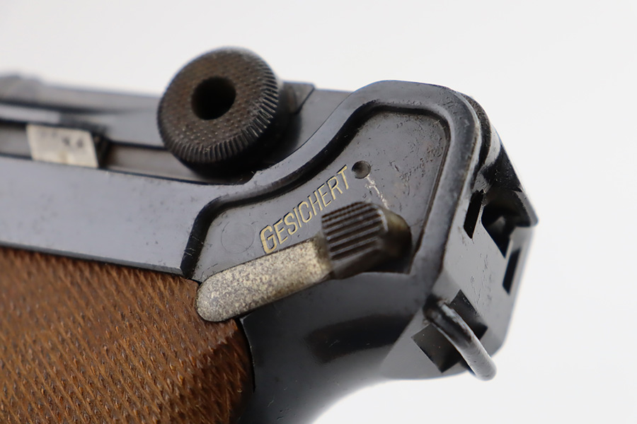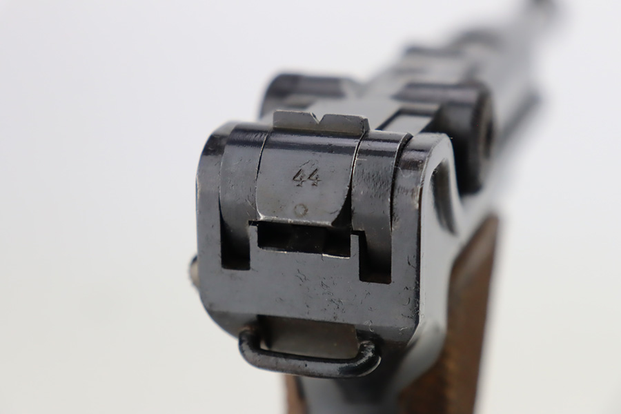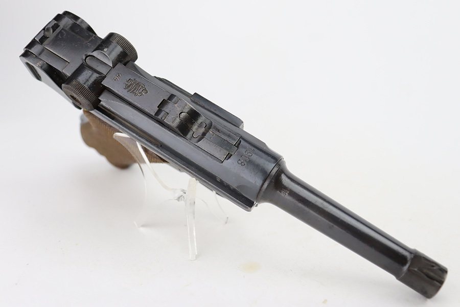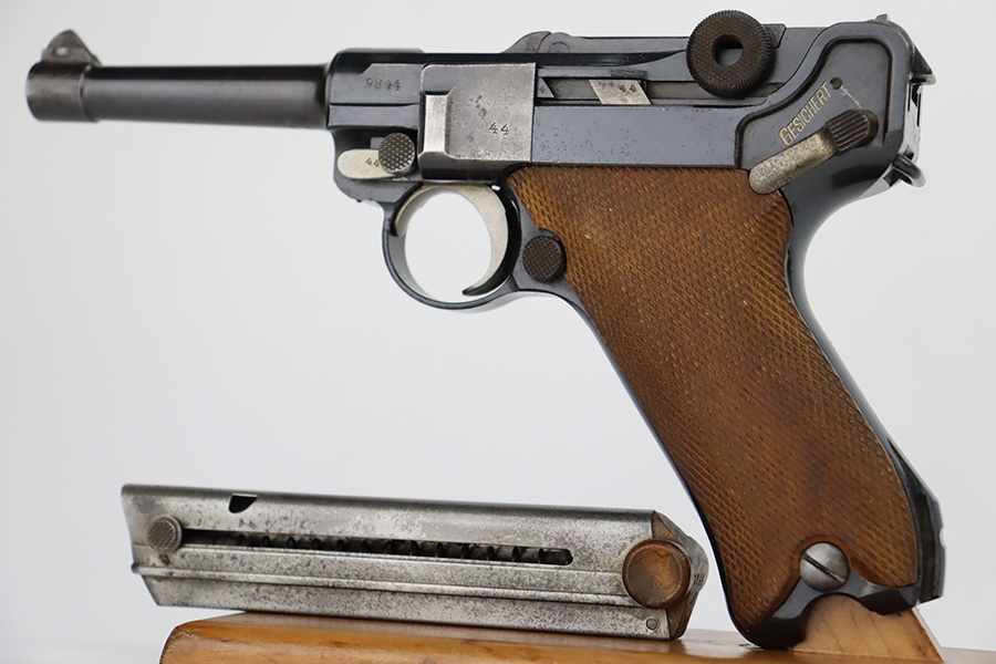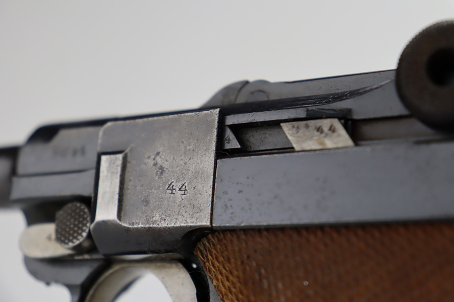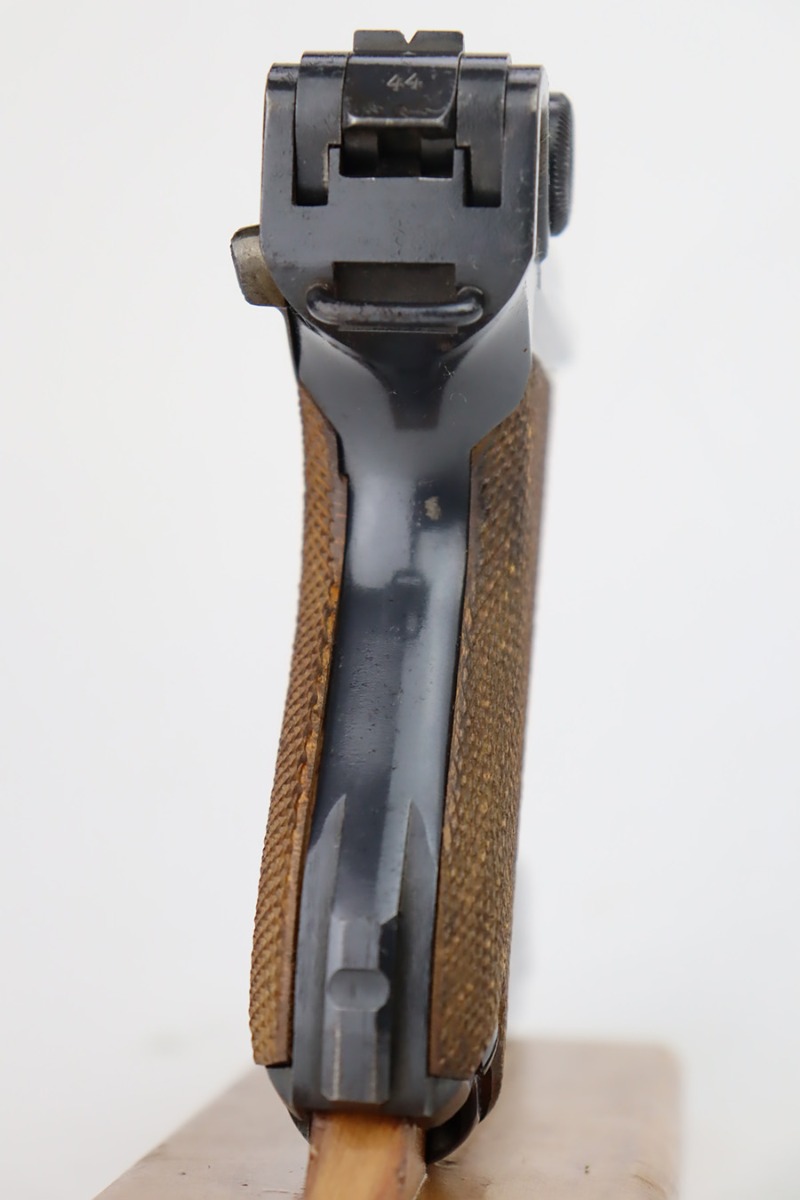 9/26/23 – This is a very nice DWM Luger issued to the Imperial German military in 1918. All matching with the proper Imperial proofs. Comes with one matching-numbered magazine. The bluing rates about 93%. Most of the wear is on the side plate, but there is also minor muzzle wear and some minor thinning on the right side of the barrel. Areas of light spotty oxidation and pin-pricking here and there – most noticeable on the left side of the gun. Minty un-numbered wood grips. Very nice bore with strong rifling and hints of pin-pricking in the grooves.
