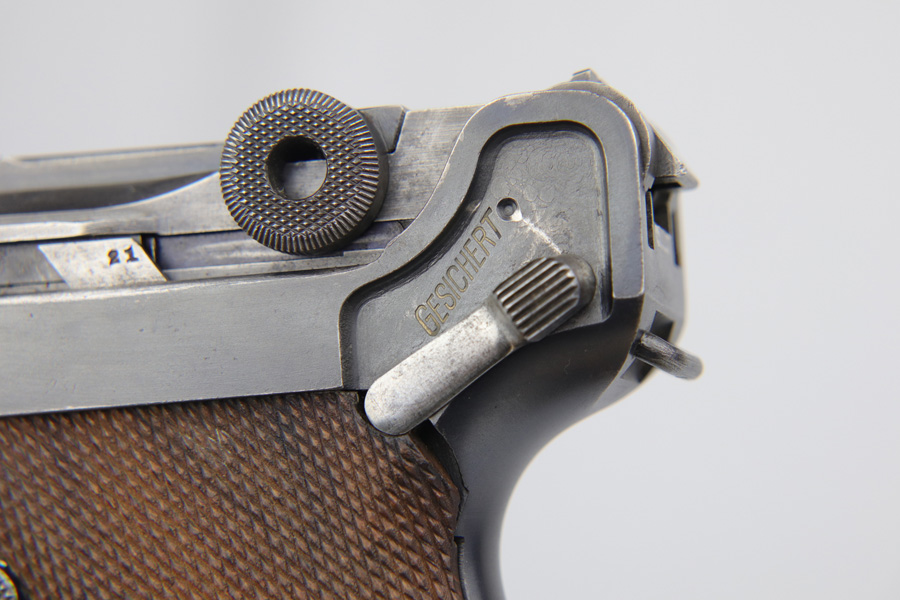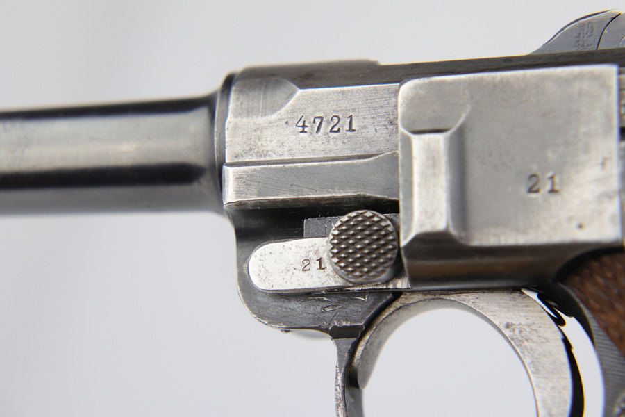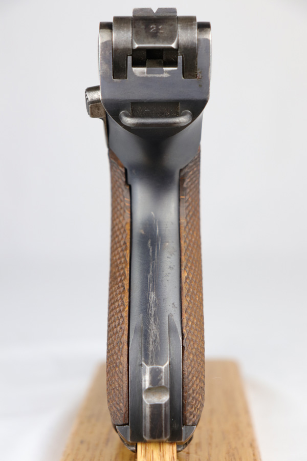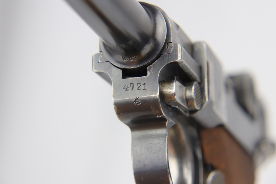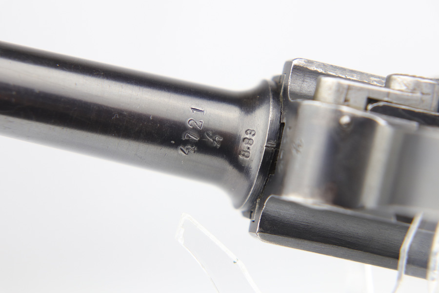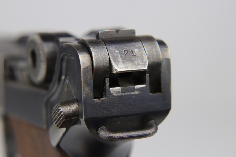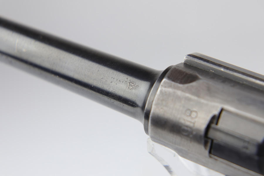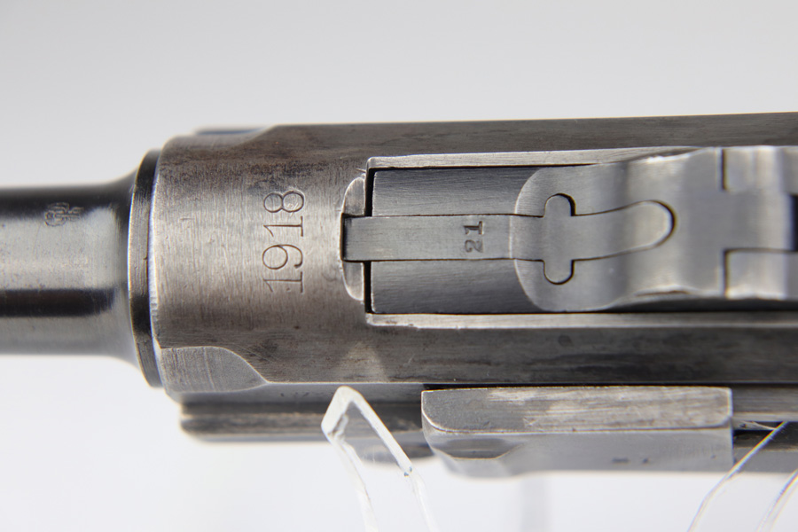 12/3/18 – This is an original 1918 dated DWM Luger pistol. The pistol is all original and matching. The magazine is period correct, but non-matching serial numbered. The grips are WW1 style but are not numbered except for a small “2” on the left panel. The left panel has a small chip near the safety lever, as is a common flaw on Lugers. The finish overall is about 80-85% as there’s significant bluing loss on the receiver and “straw parts”, such as the trigger, safety lever, and takedown lever. The back strap has some light surface scratching as shown in photos. The pistol has all small parts correct and matching with a very nice bore – 8.5/10 overall with strong grooves and only minor patina. Guaranteed original and fully functional.