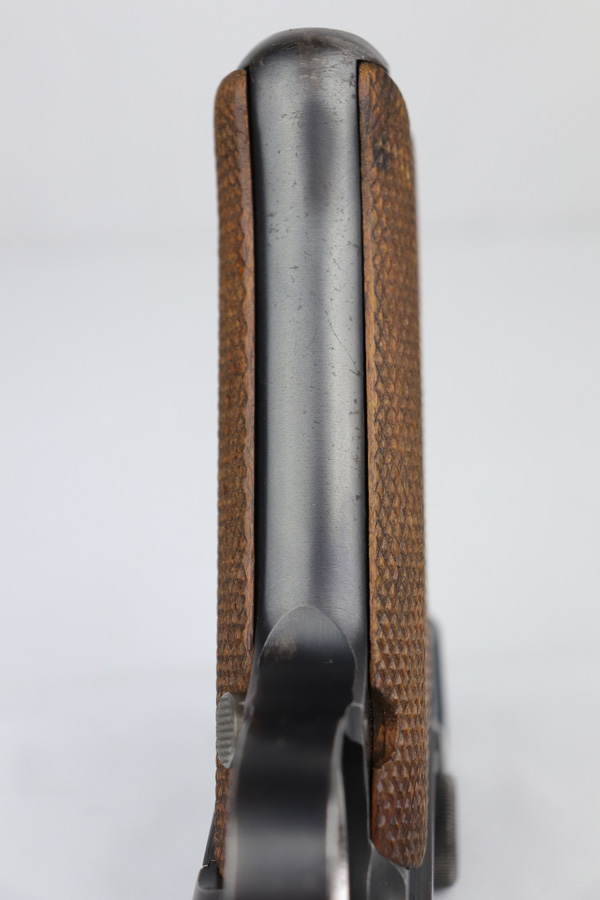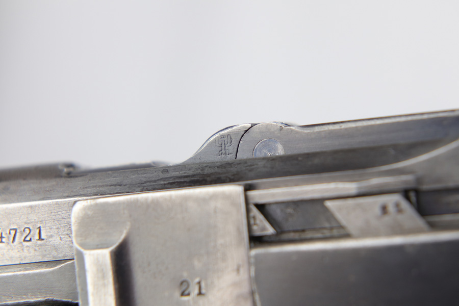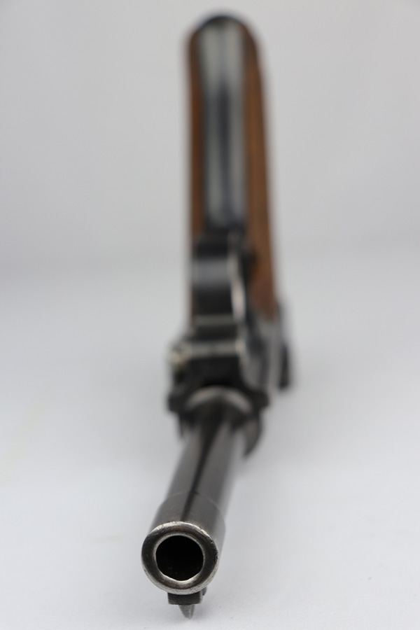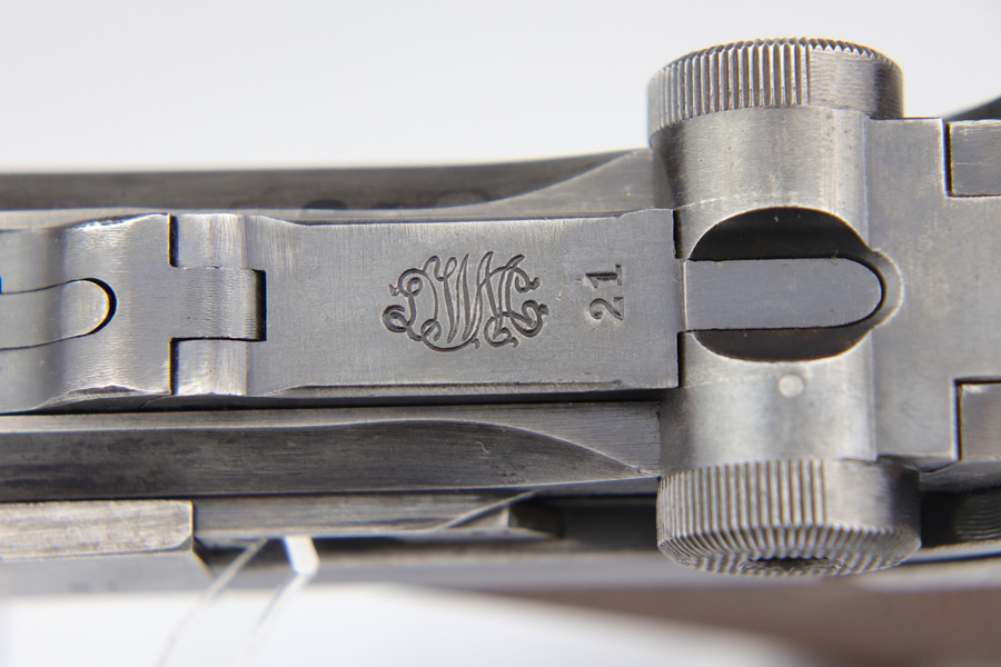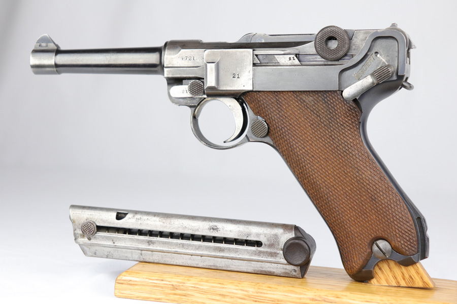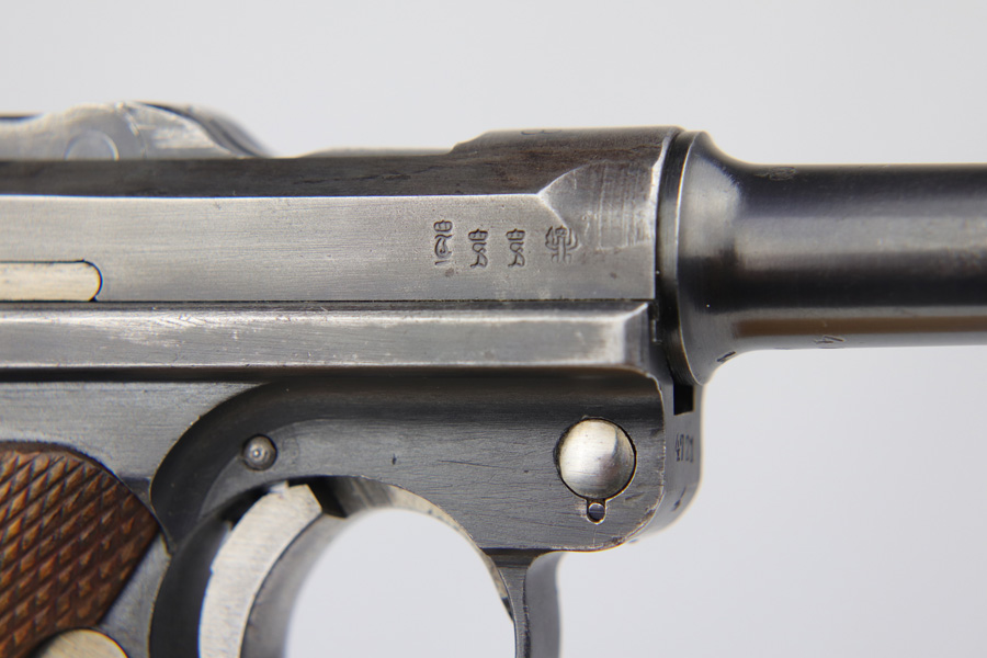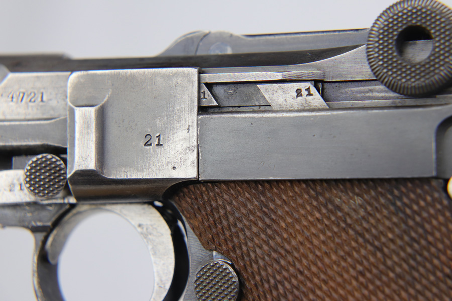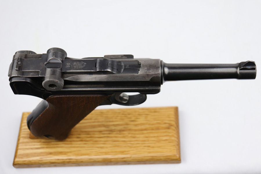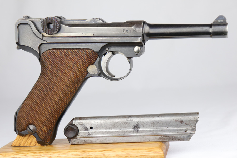 12/3/18 – This is an original 1918 dated DWM Luger pistol. The pistol is all original and matching. The magazine is period correct, but non-matching serial numbered. The grips are WW1 style but are not numbered except for a small “2” on the left panel. The left panel has a small chip near the safety lever, as is a common flaw on Lugers. The finish overall is about 80-85% as there’s significant bluing loss on the receiver and “straw parts”, such as the trigger, safety lever, and takedown lever. The back strap has some light surface scratching as shown in photos. The pistol has all small parts correct and matching with a very nice bore – 8.5/10 overall with strong grooves and only minor patina. Guaranteed original and fully functional.