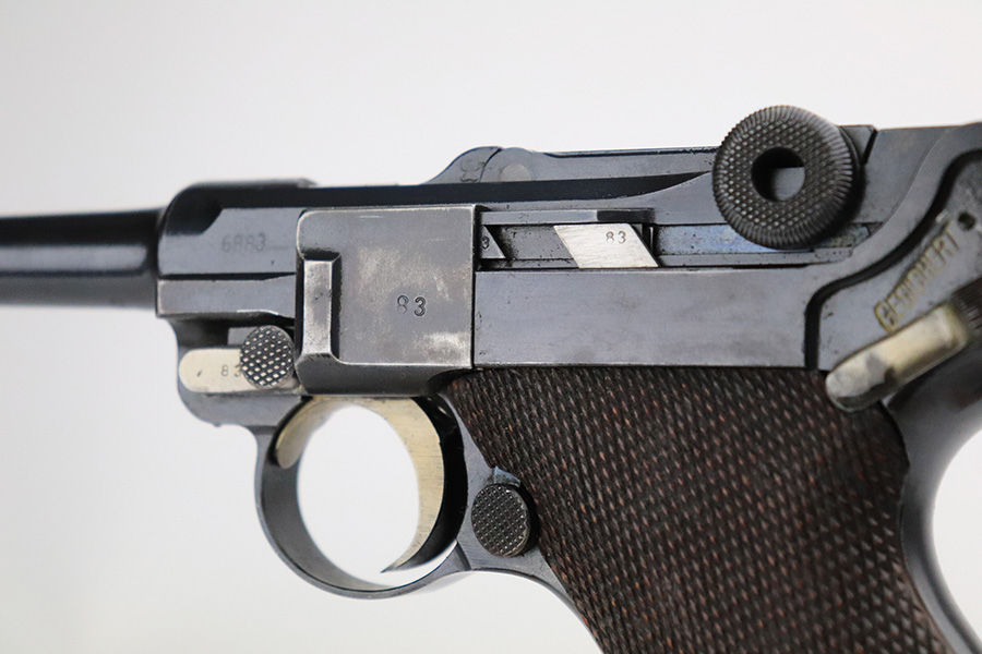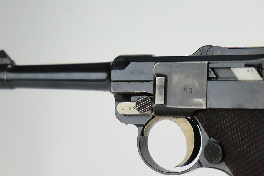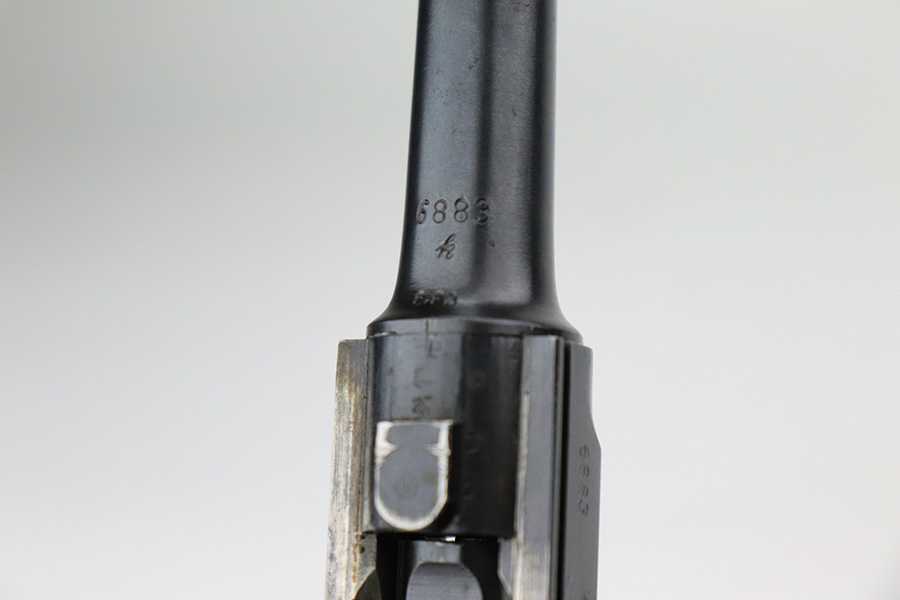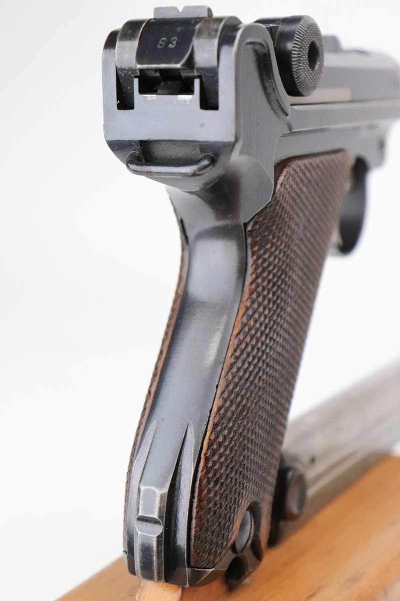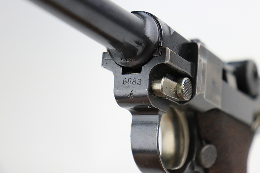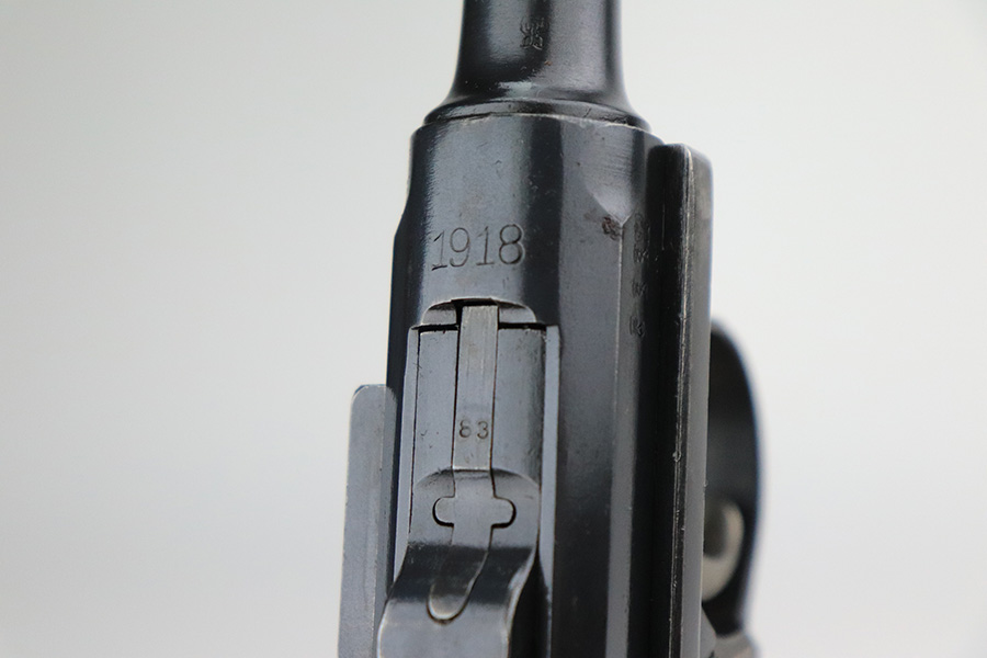 8/1/22 – This is a very nice example of a DWM Luger issued to the Imperial German military in 1918. It is all matching and has the proper Imperial military acceptance proofs. There is also an “S.B.12555.” police unit marking on the front strap. So presumably, the gun eventually ended up with the police. It has retained about 93-94% of its original bluing. Most of the finish loss is on the side plate, but there is also some wear on the front strap, side rails, and around the muzzle. Some areas of minor oxidation on the side plate and along the barrel. Comes with nice un-numbered wood grips and a police-style magazine numbered “2663”. Very nice bore with good rifling.