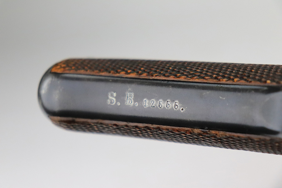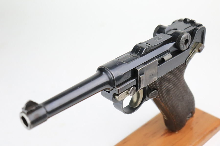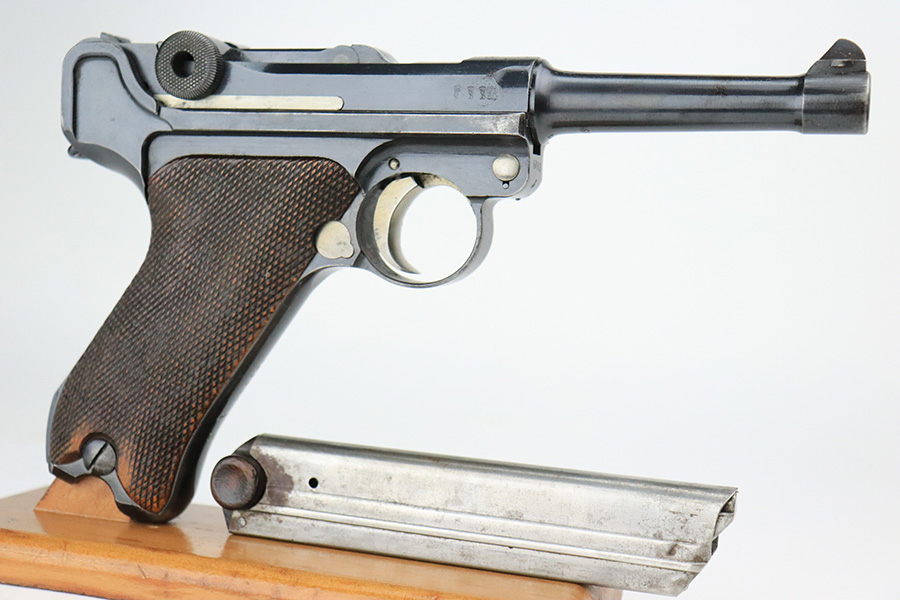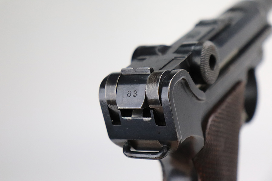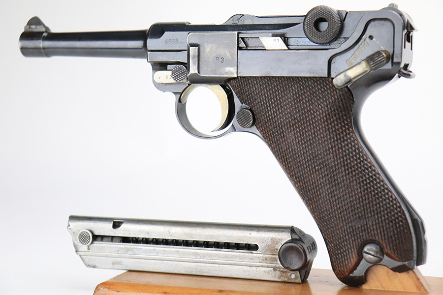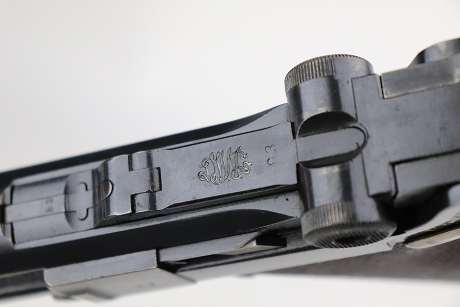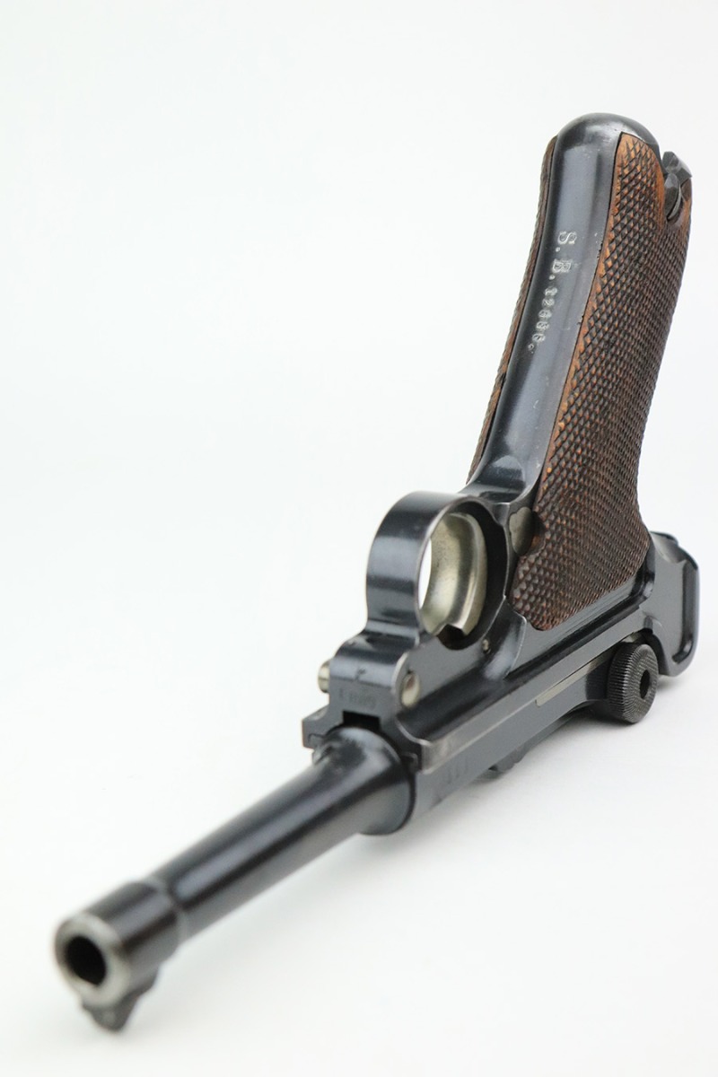 8/1/22 – This is a very nice example of a DWM Luger issued to the Imperial German military in 1918. It is all matching and has the proper Imperial military acceptance proofs. There is also an “S.B.12555.” police unit marking on the front strap. So presumably, the gun eventually ended up with the police. It has retained about 93-94% of its original bluing. Most of the finish loss is on the side plate, but there is also some wear on the front strap, side rails, and around the muzzle. Some areas of minor oxidation on the side plate and along the barrel. Comes with nice un-numbered wood grips and a police-style magazine numbered “2663”. Very nice bore with good rifling.