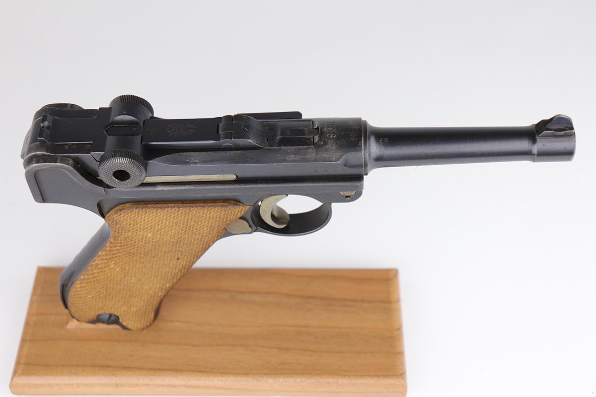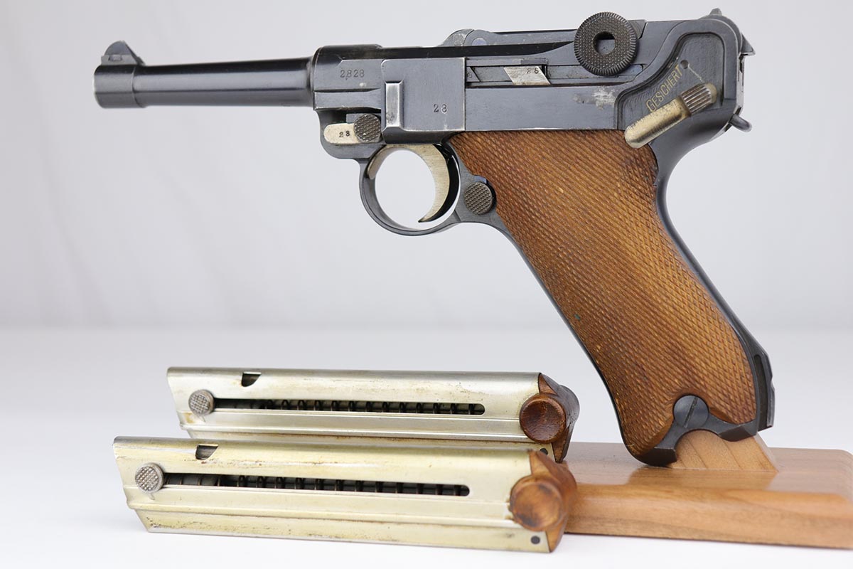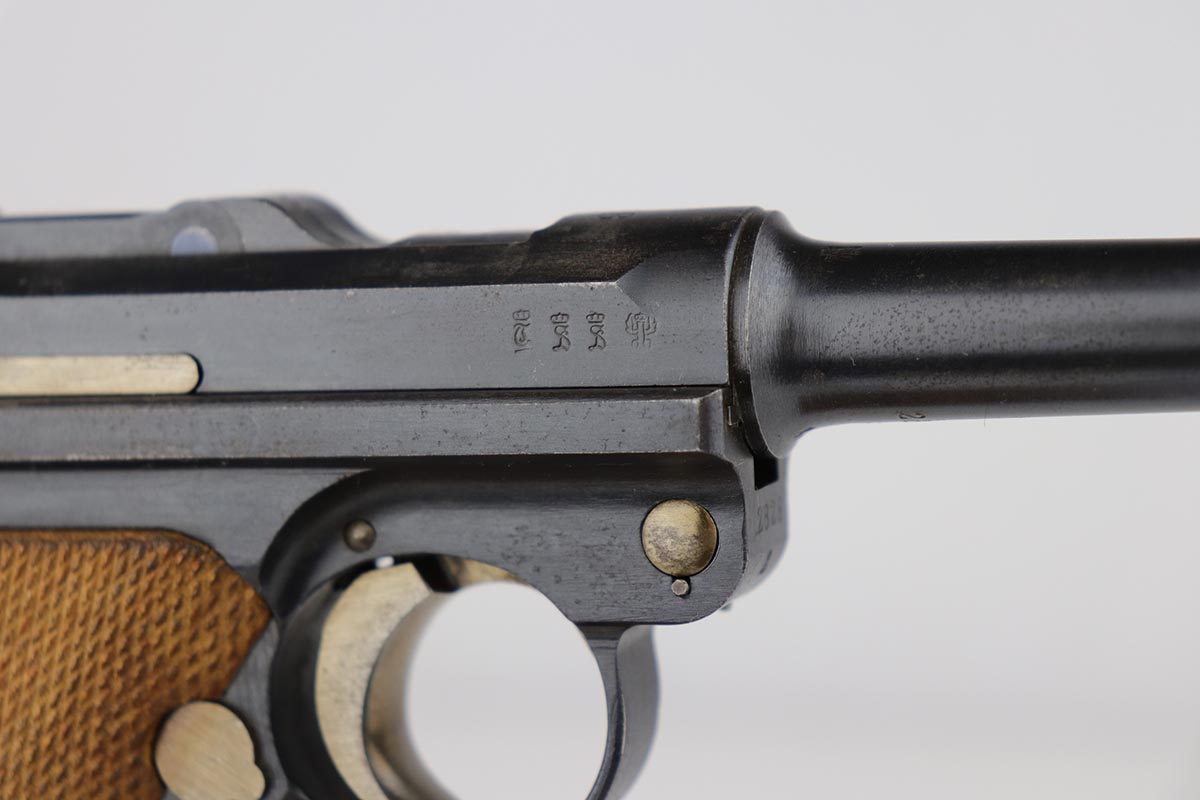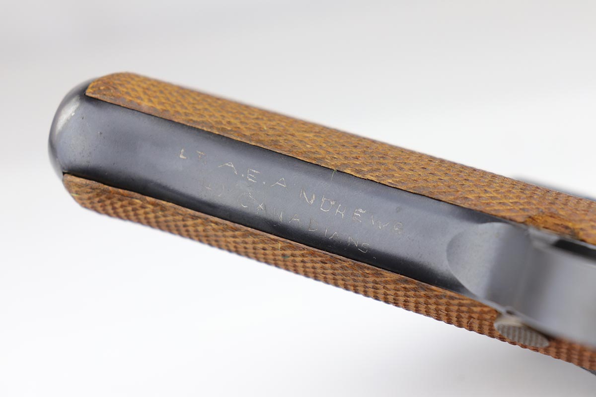 Andrews told his son he purchased the pistol from a Sergeant in his regiment, and that it had been untouched and laying in warehouse storage for over 60 years. The document states that the magazines are 100% original to the gun, but we aren’t completely certain about the numbering. Please see the photos – a few collectors have inspected & verified authenticity, but decide for yourself. The pistol frame and the holster both have Andrews’ name inscribed. Pistol otherwise shows about 5% finish loss, with most wear on high edges and the top of the receiver. Small parts retain 90+% straw. Original grips are numbered and matching to the gun. Holster is in excellent condition but did have some stitching repairs done to it.
