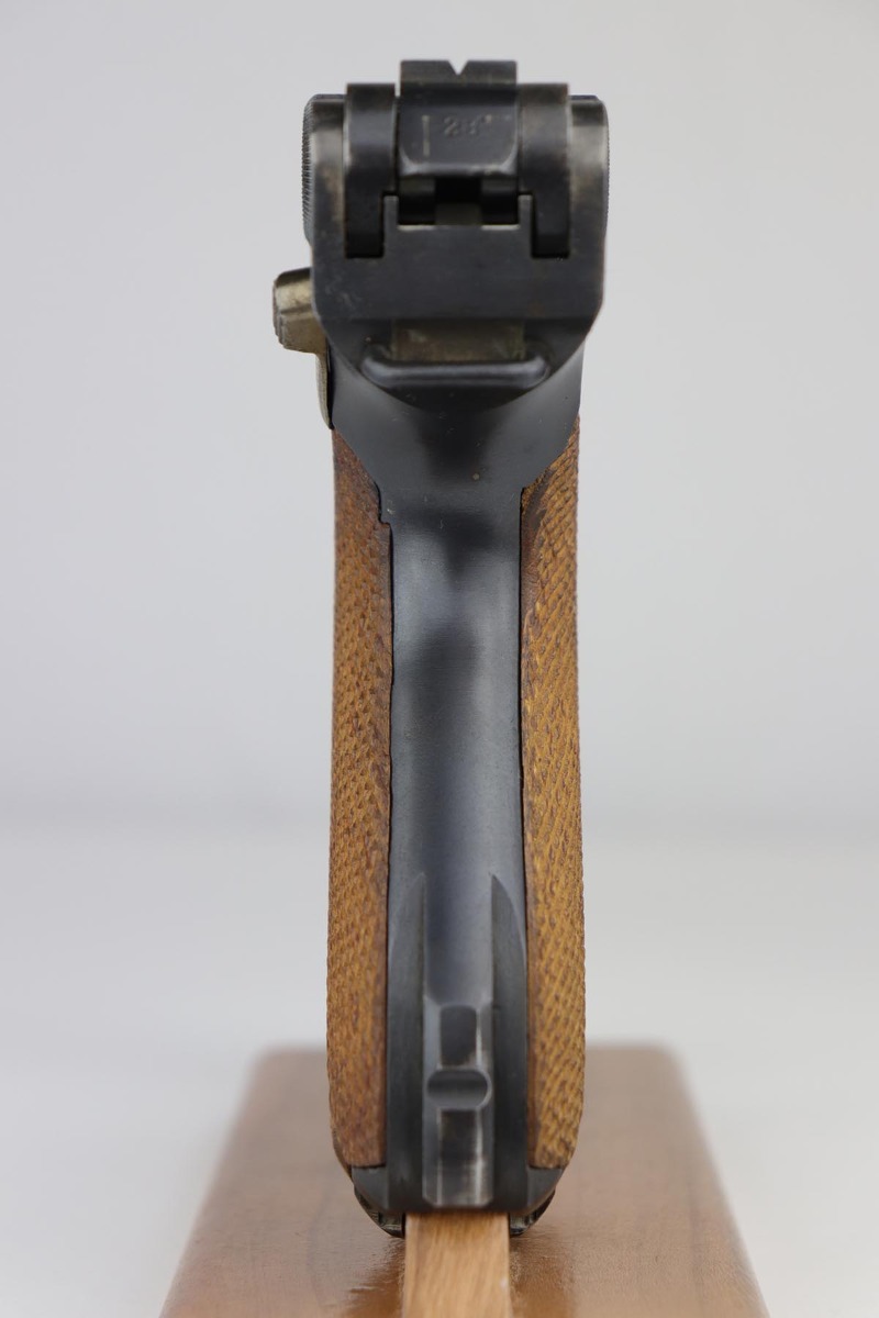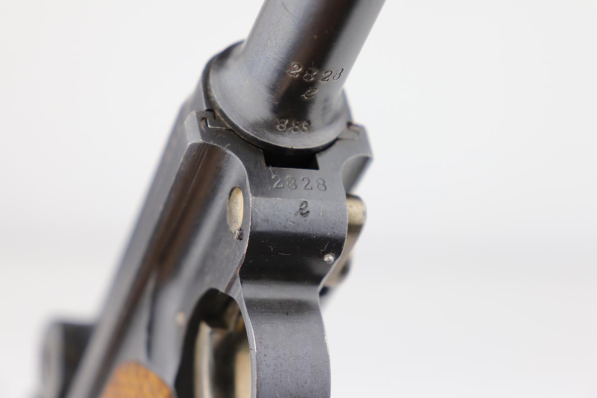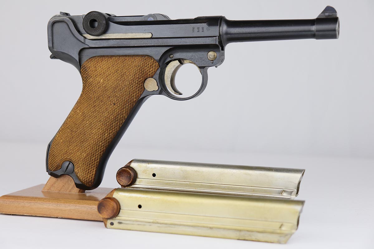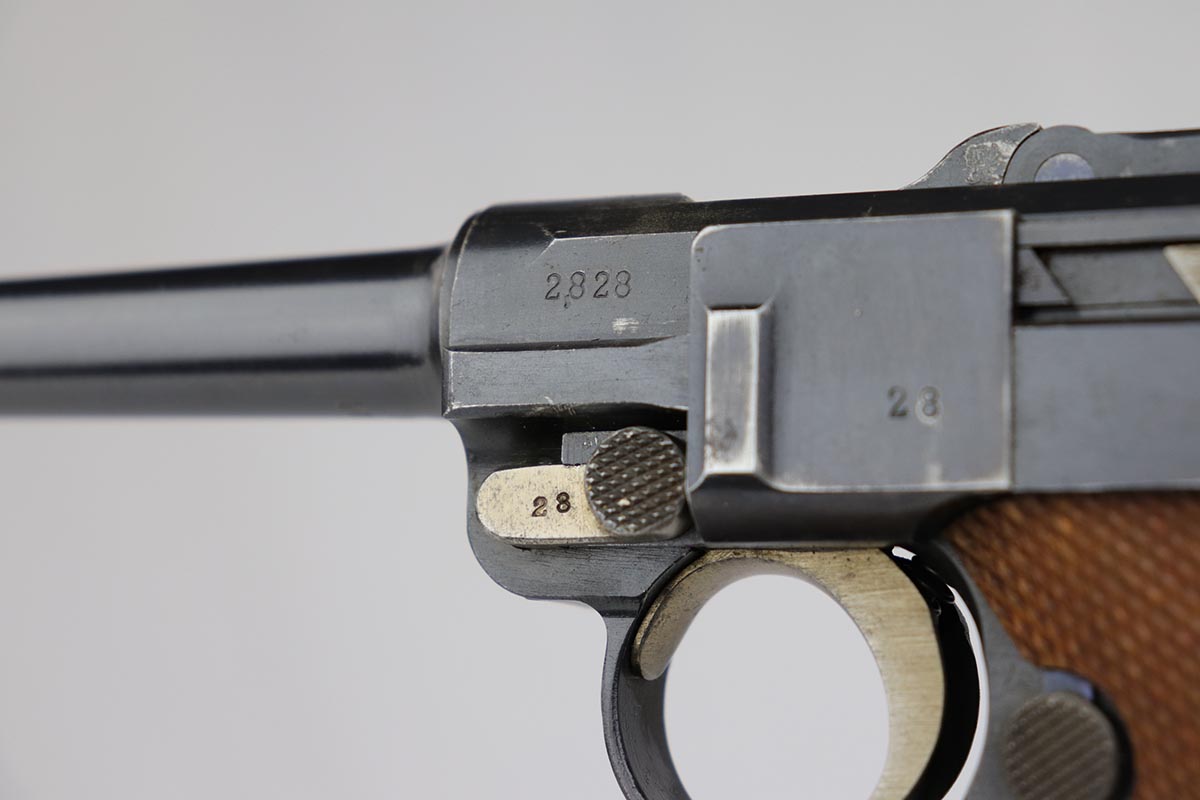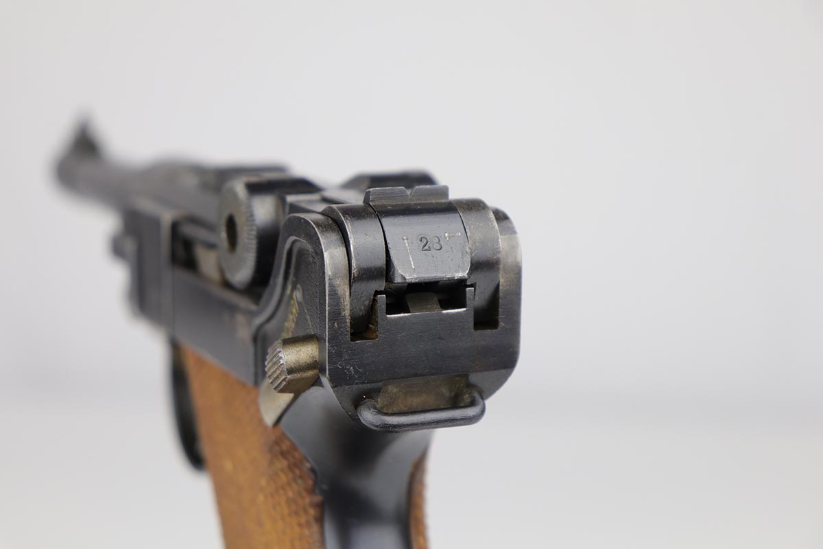 Andrews told his son he purchased the pistol from a Sergeant in his regiment, and that it had been untouched and laying in warehouse storage for over 60 years. The document states that the magazines are 100% original to the gun, but we aren’t completely certain about the numbering. Please see the photos – a few collectors have inspected & verified authenticity, but decide for yourself. The pistol frame and the holster both have Andrews’ name inscribed. Pistol otherwise shows about 5% finish loss, with most wear on high edges and the top of the receiver. Small parts retain 90+% straw. Original grips are numbered and matching to the gun. Holster is in excellent condition but did have some stitching repairs done to it.